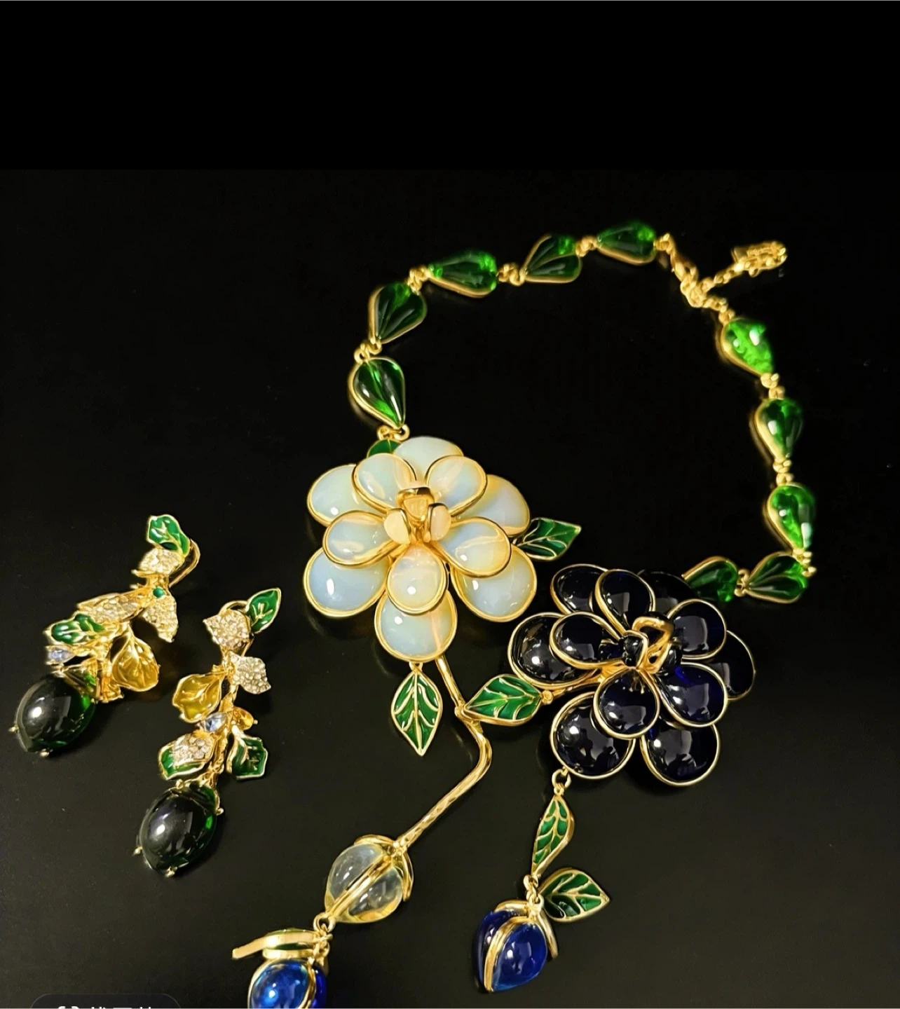 Beautiful floral necklace and earring set featuring white, black, and blue flower designs with green leaf accents. Perfect for adding a touch of elegance to any outfit!