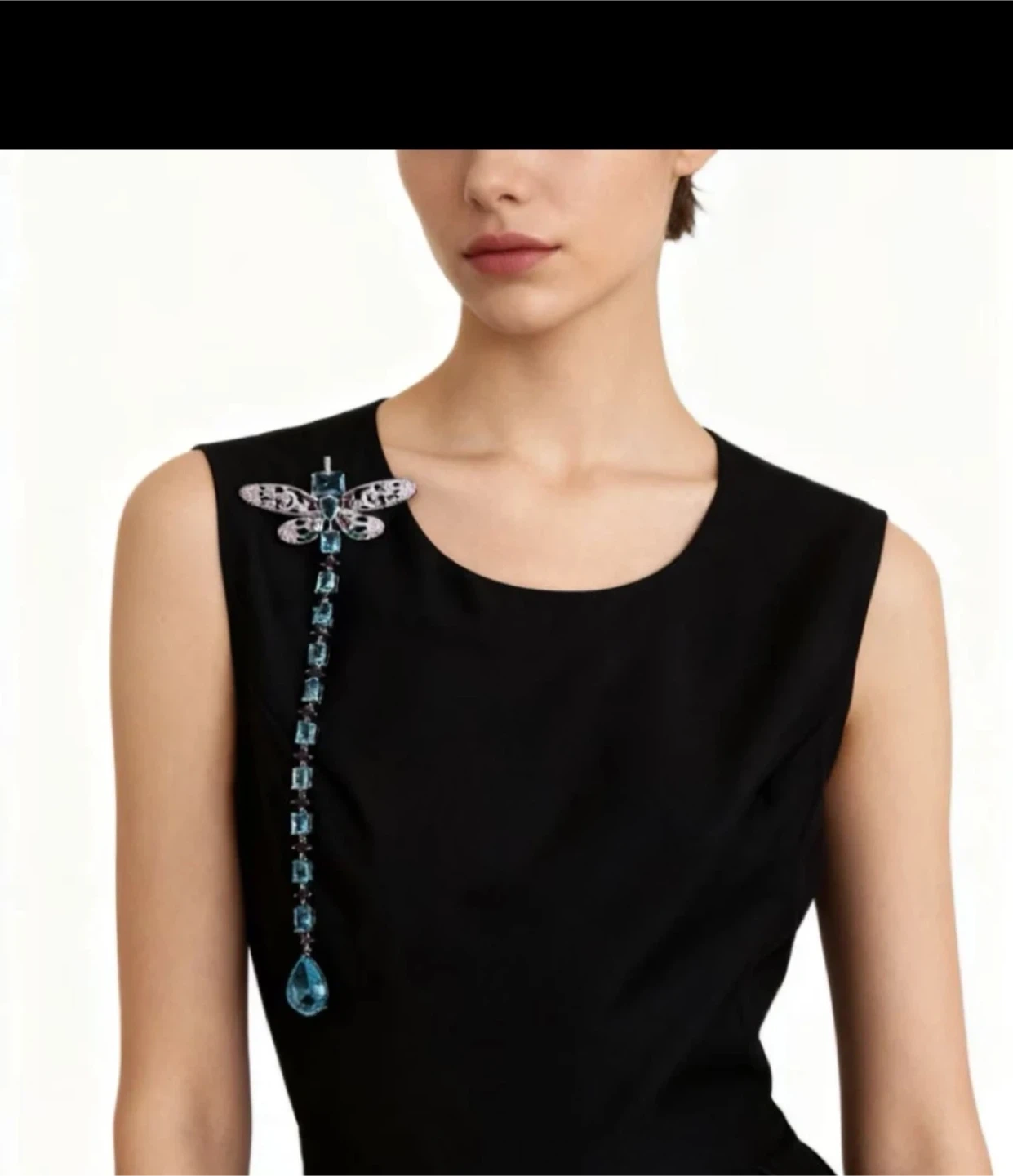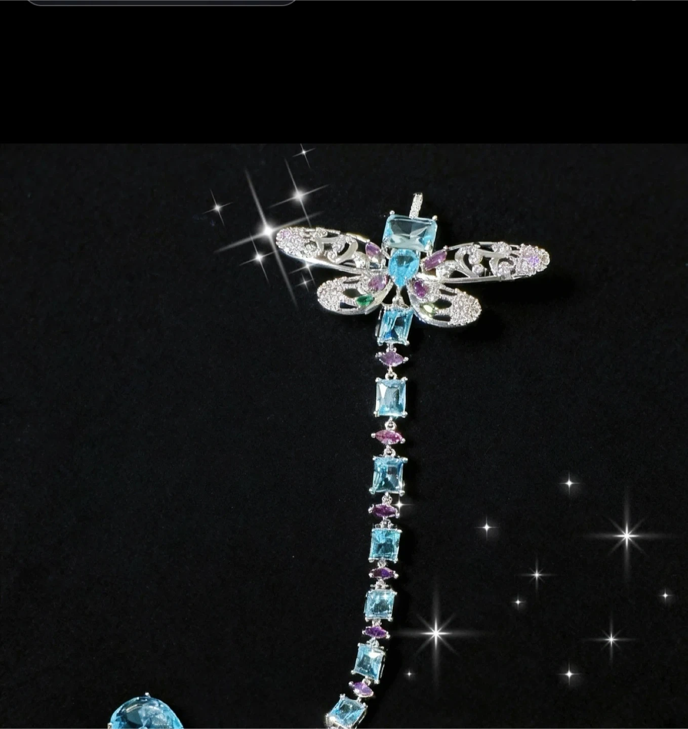 This is a dragonfly brooch, featuring blue and purple stones. It's a beautiful accessory to add to any outfit!