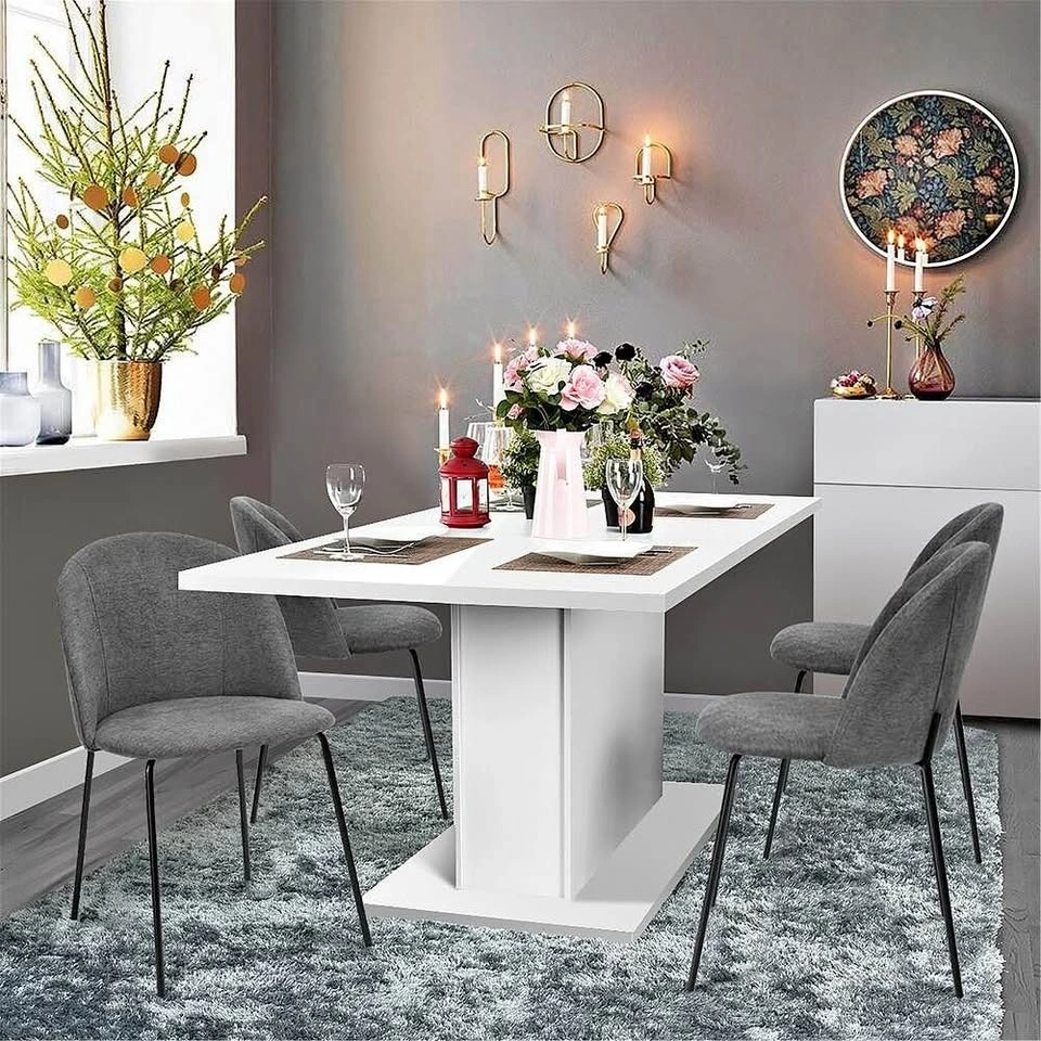 Chairs: Set of 4, stylish dark grey fabric dining chairs with black metal legs.