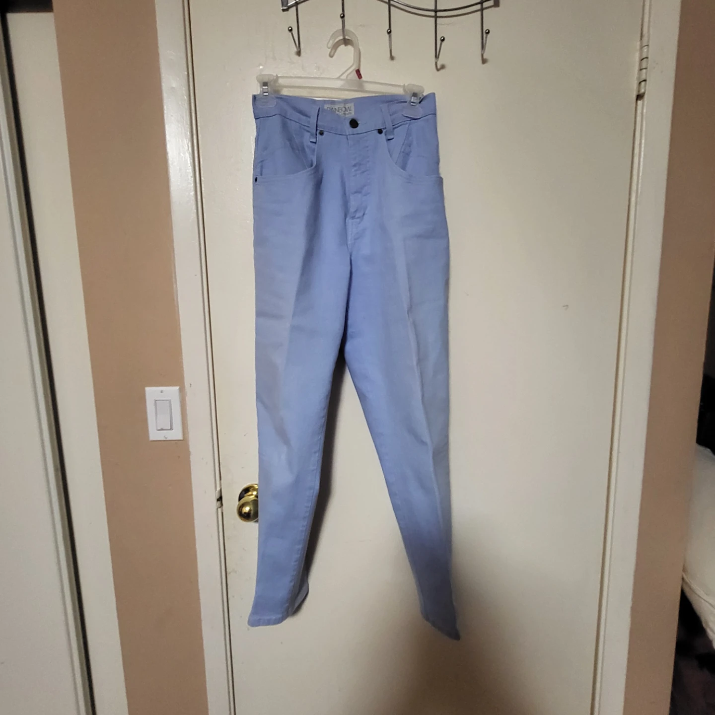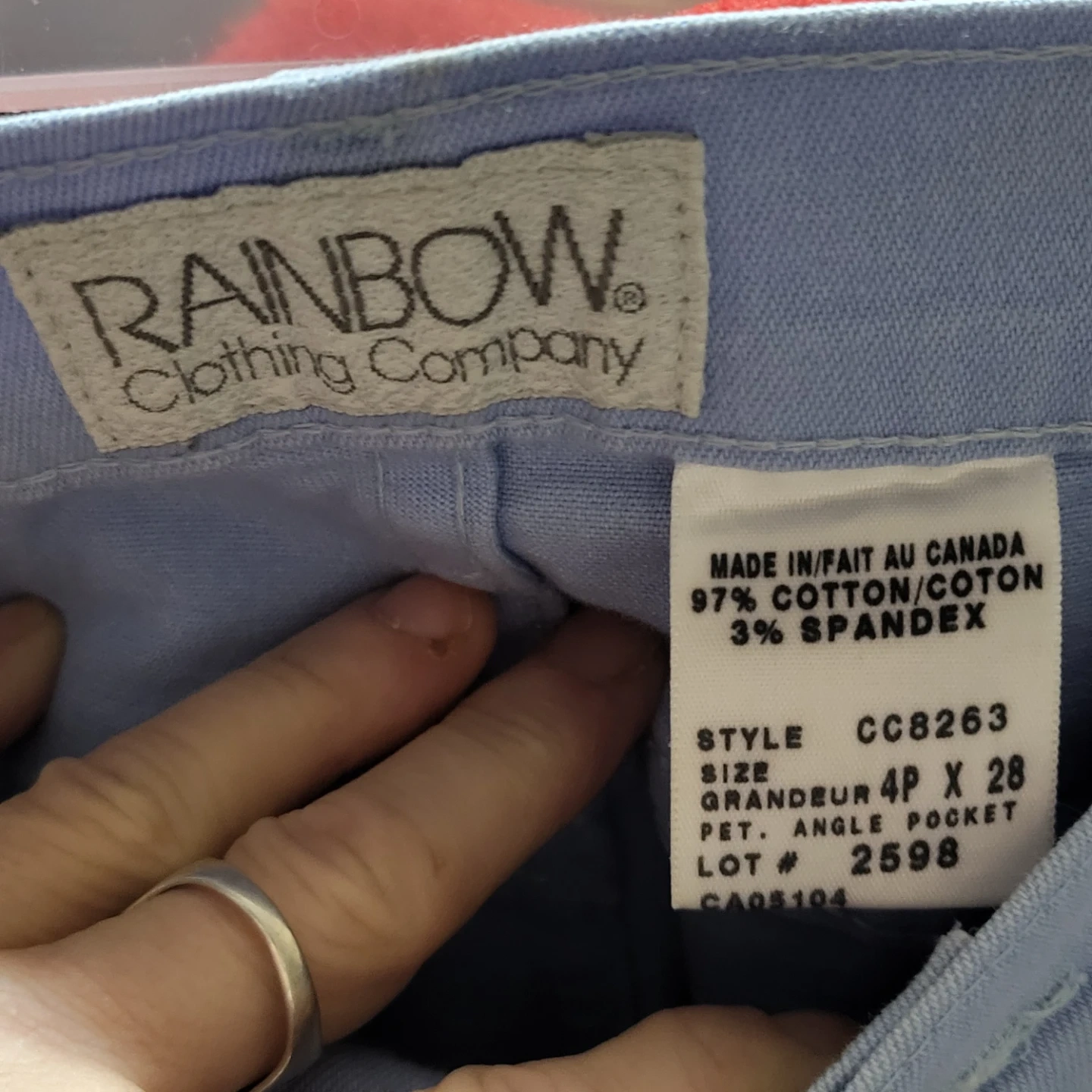 Selling a pair of light blue jeans from Rainbow Clothing Company. They're a size 4P x 28 and made in Canada from 97% cotton and 3% spandex. The style is CC8263, and they have a petite angle pocket. Great for everyday wear!