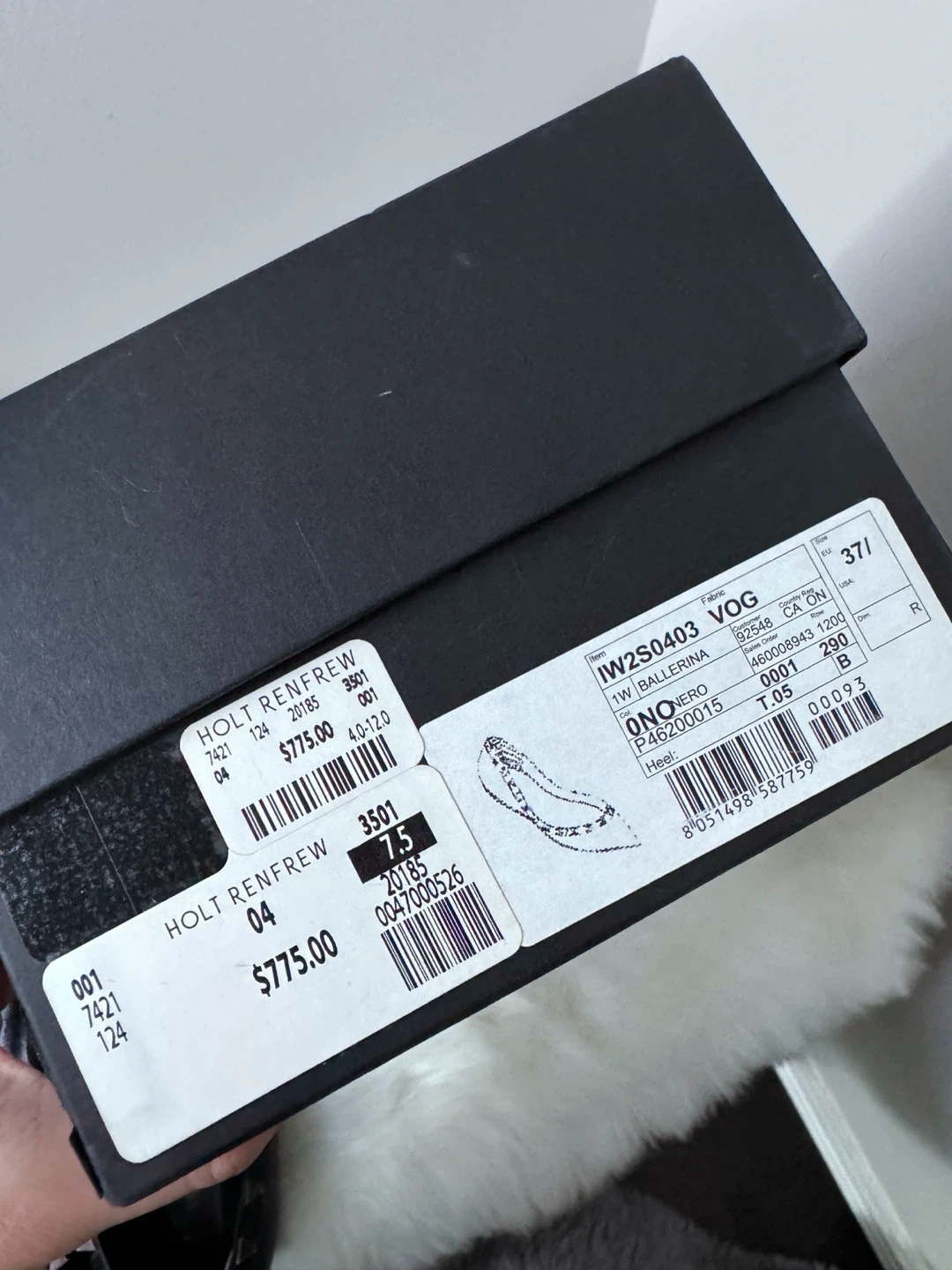 Selling a pair of Valentino Noir Rockstud ballerinas in size 37.5. They are black and come with the box. There is some wear on the toes and soles, as shown in the pictures