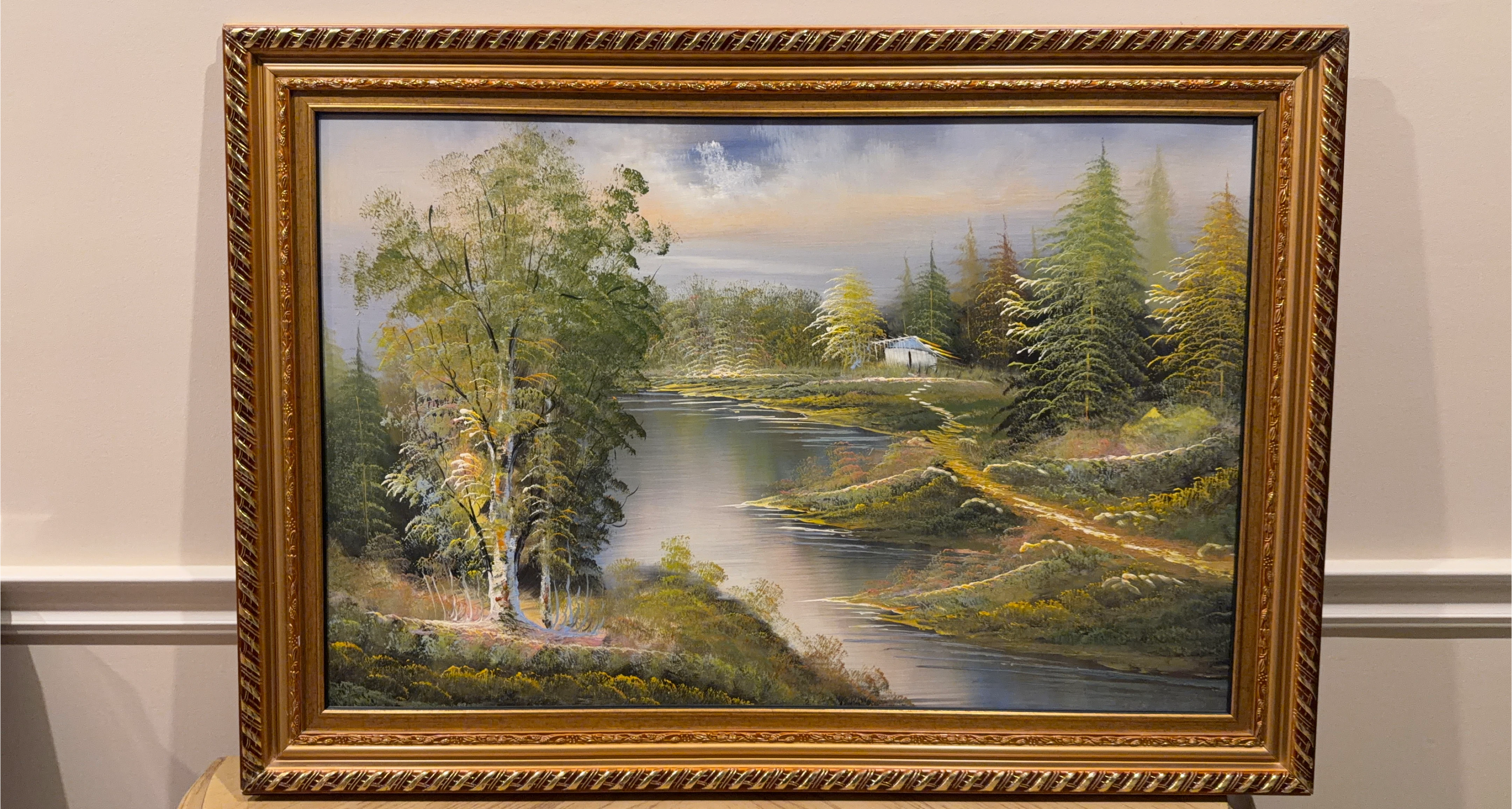 This is a lovely framed landscape painting. It features a river, trees, and a small building in the distance. The frame is ornate and gold-coloured. It would look great in any home! Excellent condition. Pick up at Richmond Hill, Hillcrest mall.