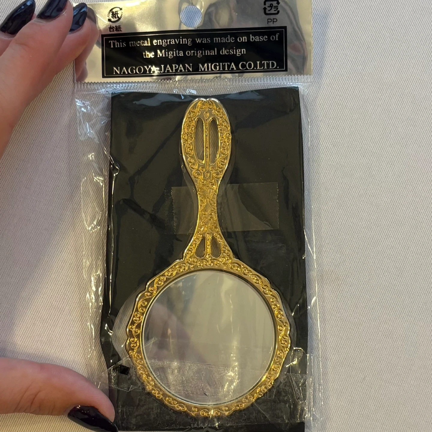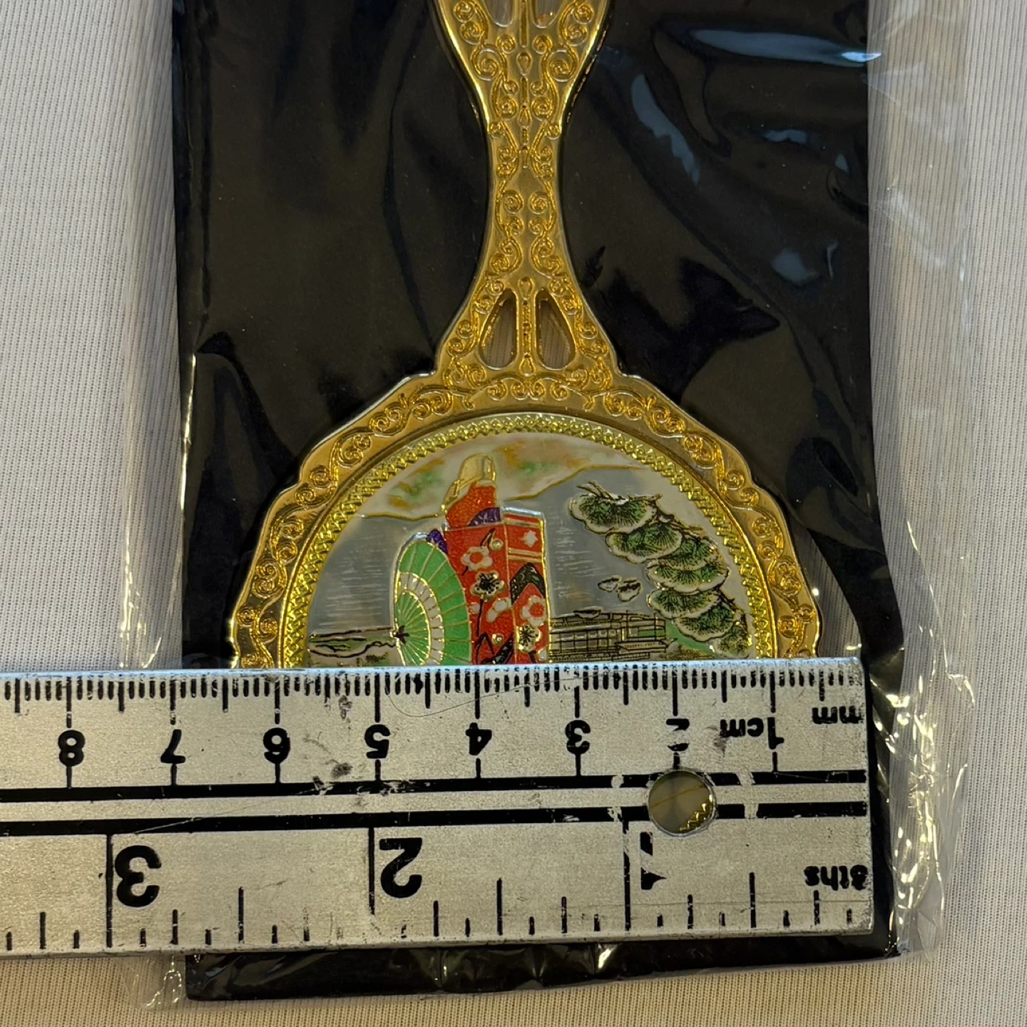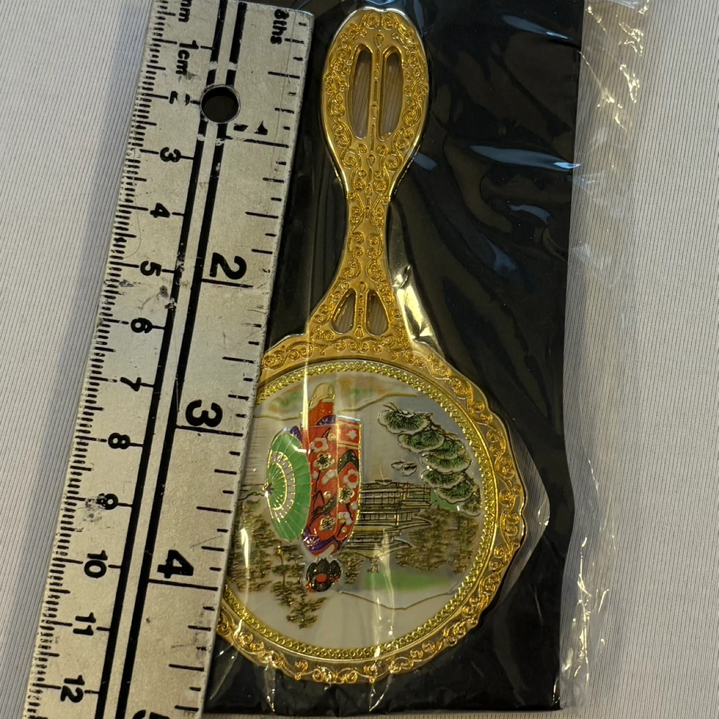 24k gold, gold plated, hand mirror, vanity mirror, compact mirror, Japanese, geisha, kimono, temple, pagoda, scenic, enamel, engraved, ornate, Migita, Nagoya, vintage style, new with tags, NWT