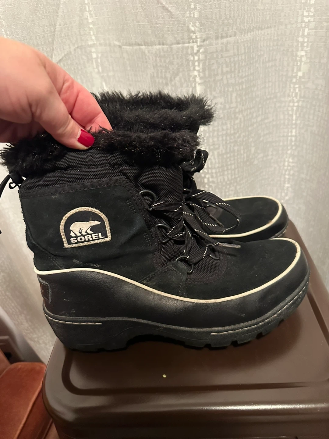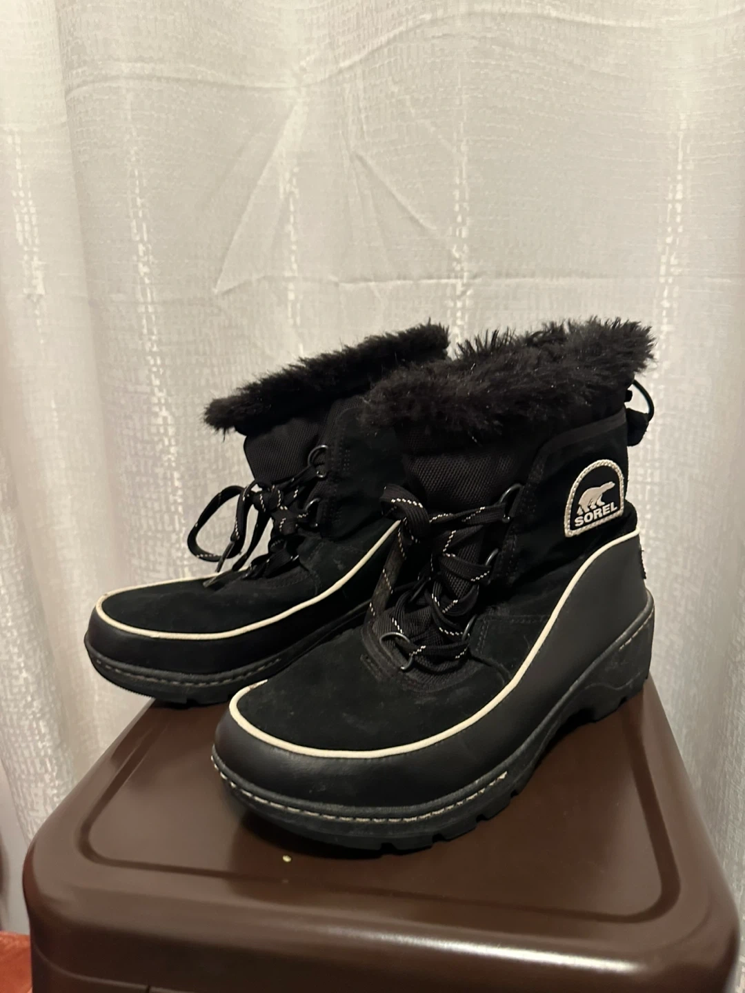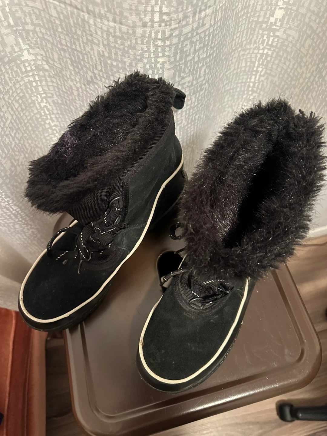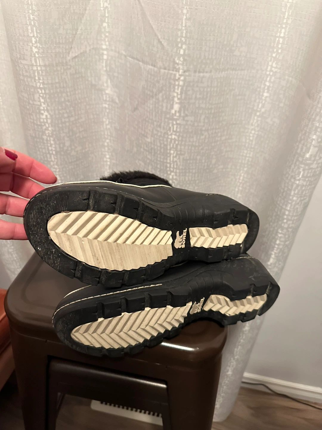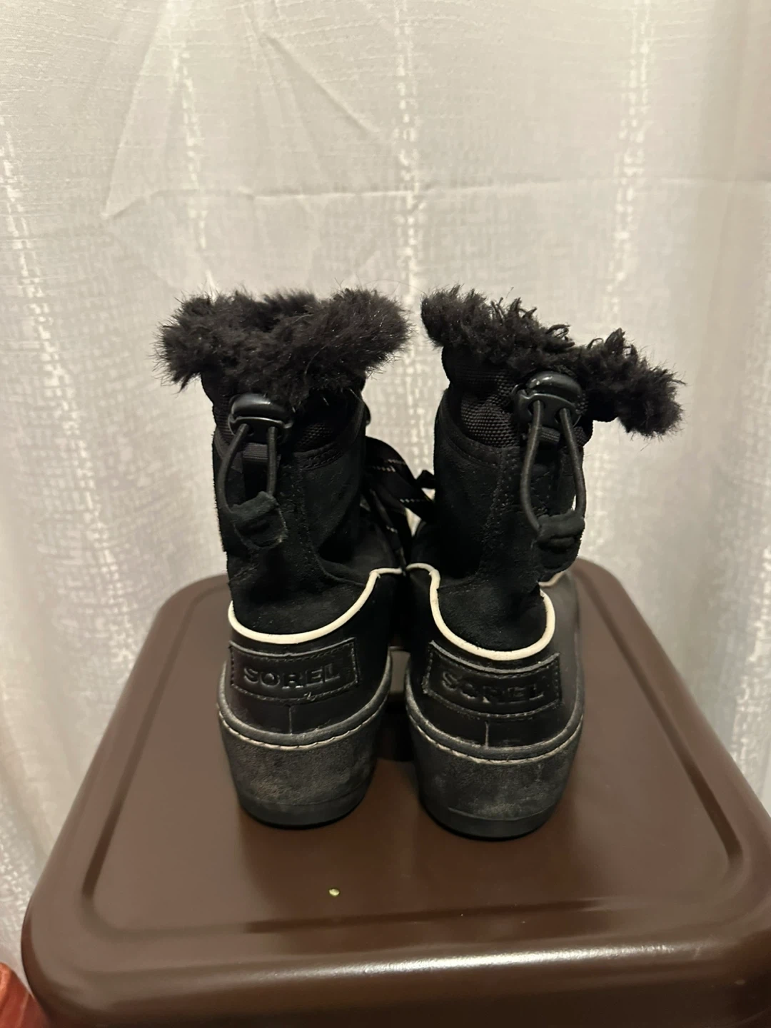 These are a pair of Sorel winter boots in black. They have a furry trim and are in good condition! Black in colour.