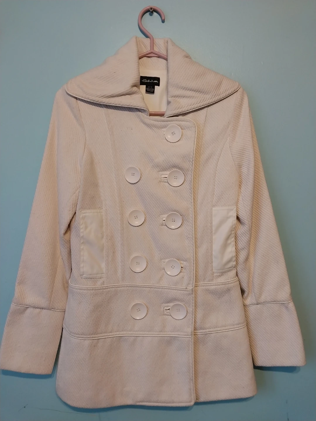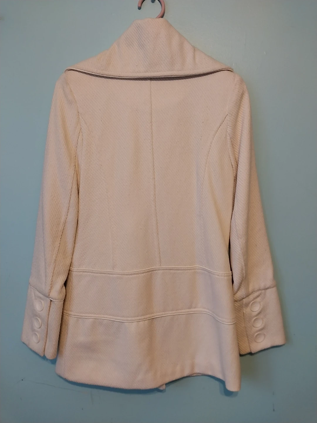 Selling a cream-coloured coat from Seductions in size XS. It features a with a double breasted closure and a wide collar. Sleeves have a decorative button detail.
