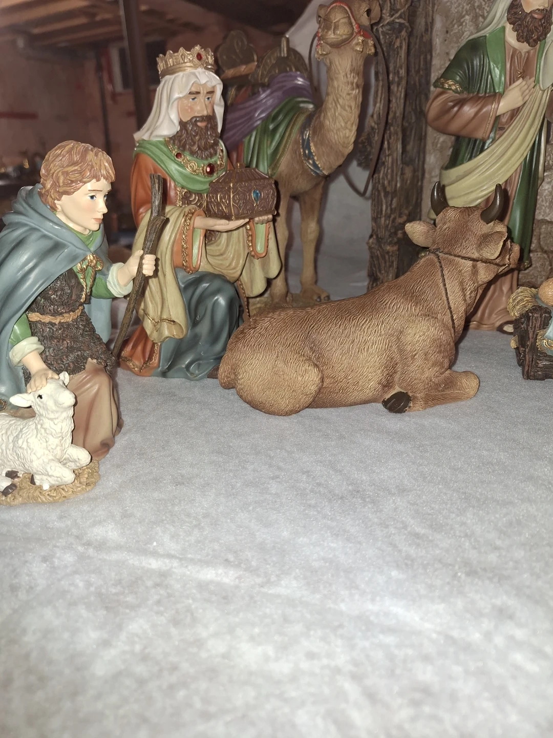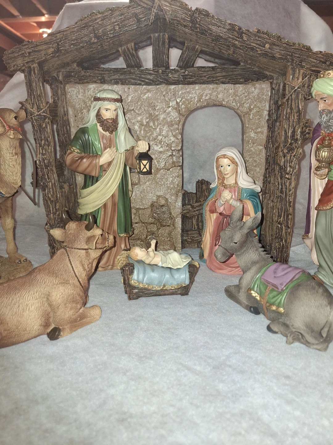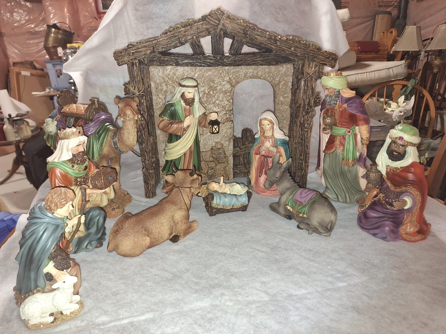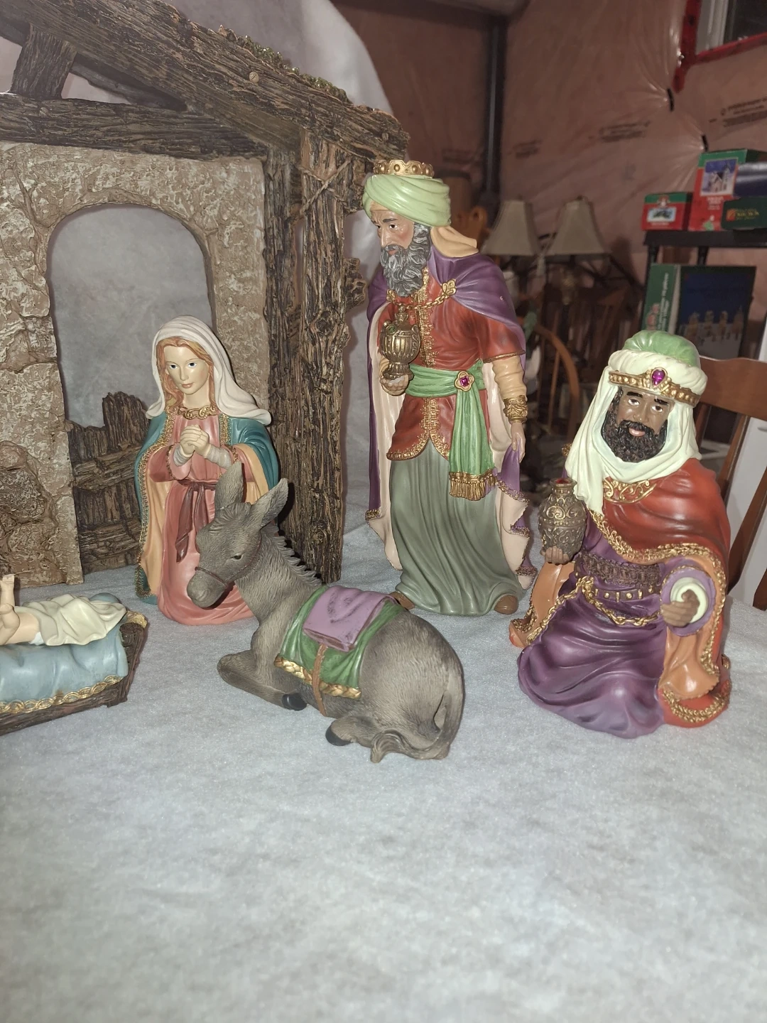 A charming Nativity scene figurine set, perfect for the holidays! This set includes the Holy Family, the Three Wise Men, animals, and a stable. All the figurines are in great condition and ready to bring the spirit of Christmas to your home