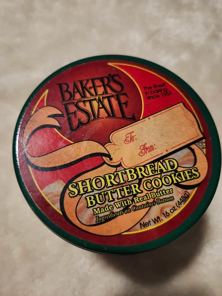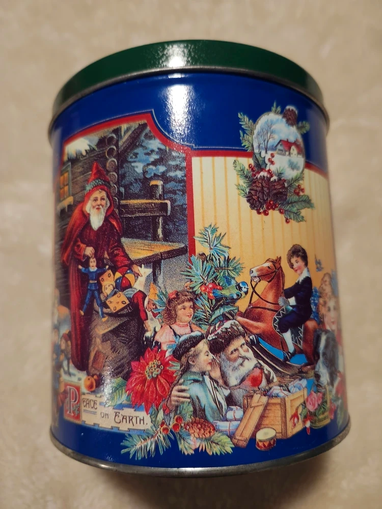 Selling a Baker's Estate shortbread butter cookies tin. It's a festive tin featuring Christmas-themed illustrations. It's a festive blue colour and features a charming vintage-style print. Vintage Santa and more! Perfect for collectors or anyone who loves a touch of nostalgia.