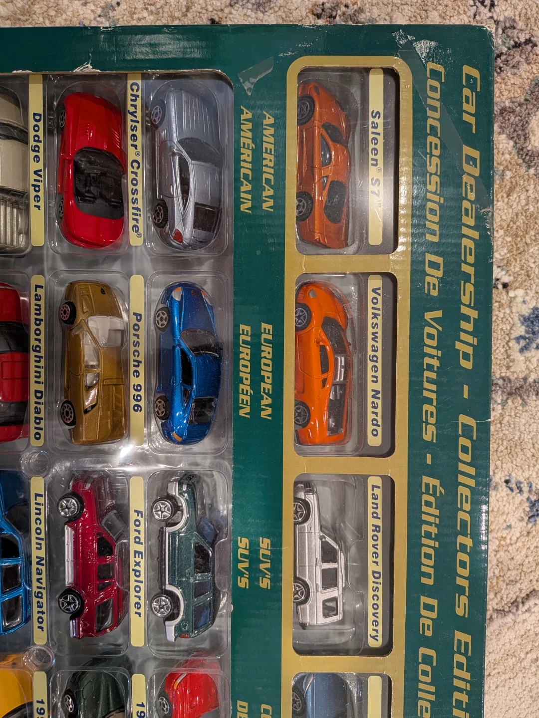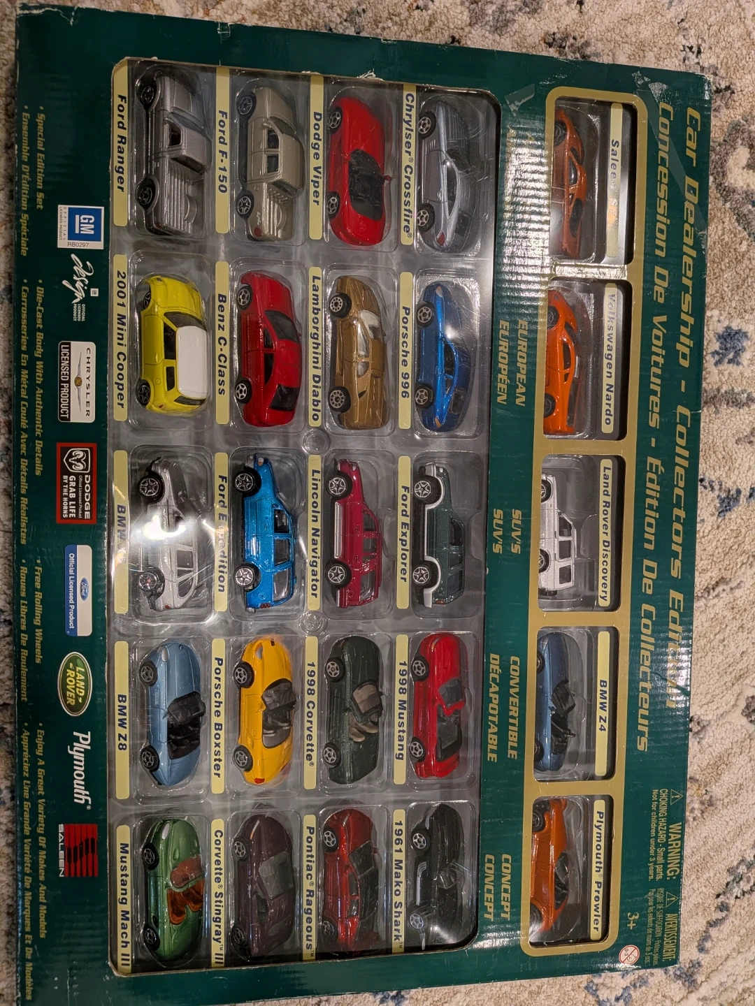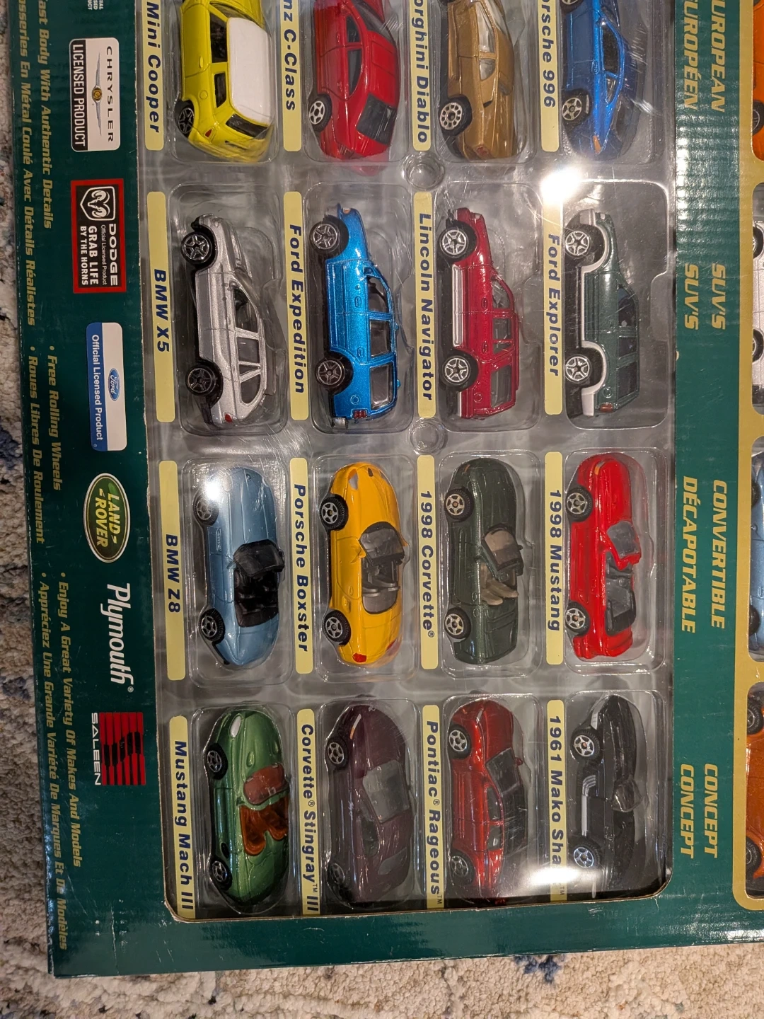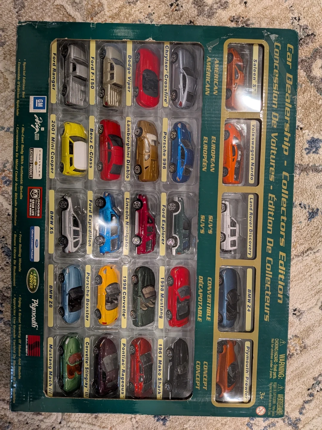 Car Dealership - Collectors Edition - Concession De Voitures - Édition De Collection diecast car set. Includes a variety of car models such as Dodge Viper, Chrysler Crossfire, Saleen S7, Volkswagen Nardo, Land Rover Discovery, Ford Ranger, Ford F-150, 2001 Mini Cooper, Benz C-Class, Lamborghini Diablo, Porsche 996, Lincoln Navigator, Ford Expedition, Ford Explorer, BMW X5, BMW Z8, Porsche Boxster, 1998 Corvette, 1998 Mustang, 1961 Mako Shark, Plymouth Prowler and Mustang Mach III and Corvette Stingray III and Pontiac Rageous