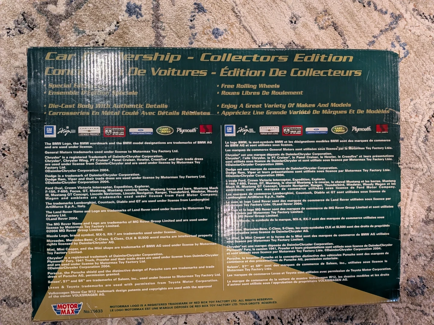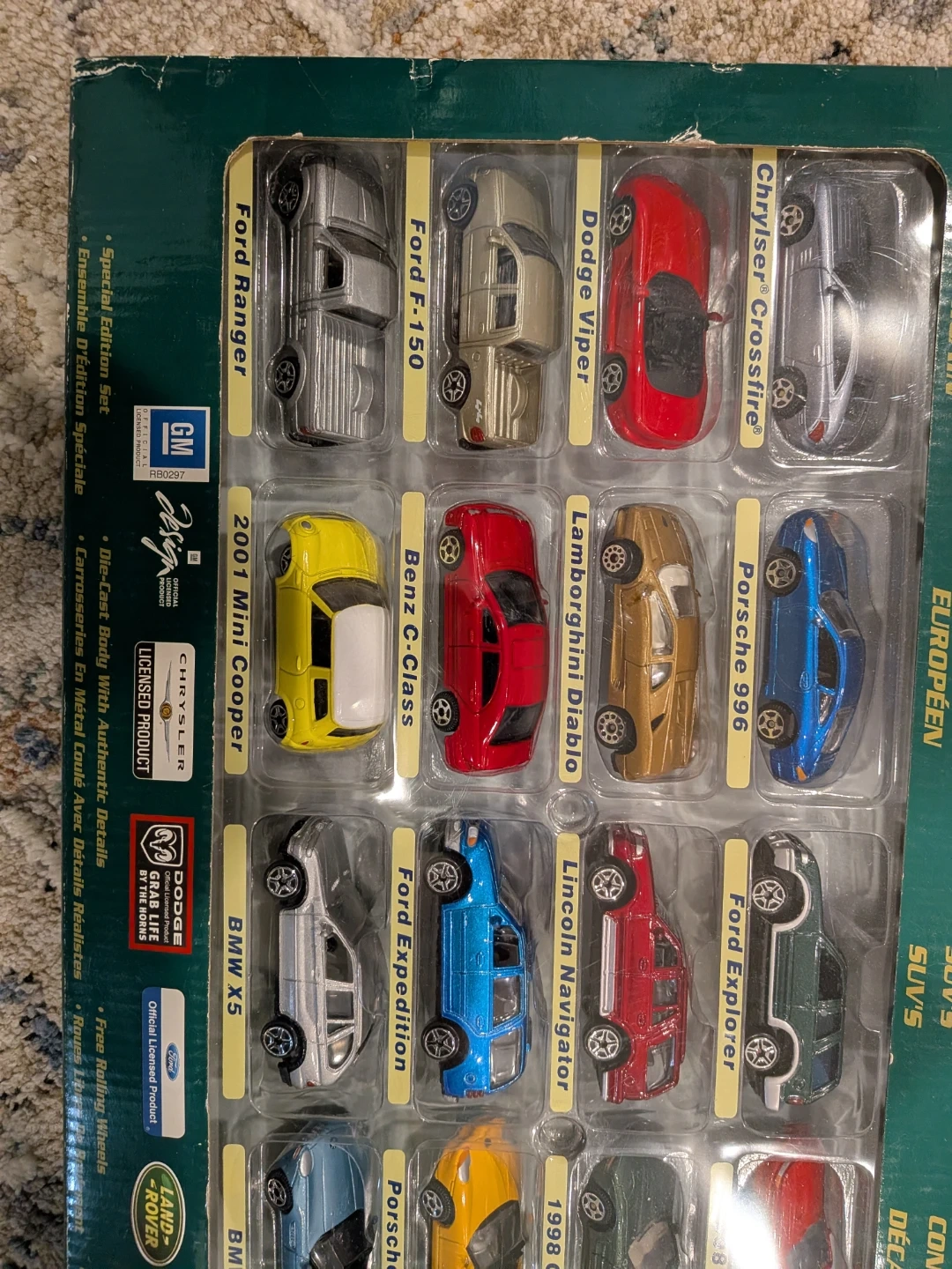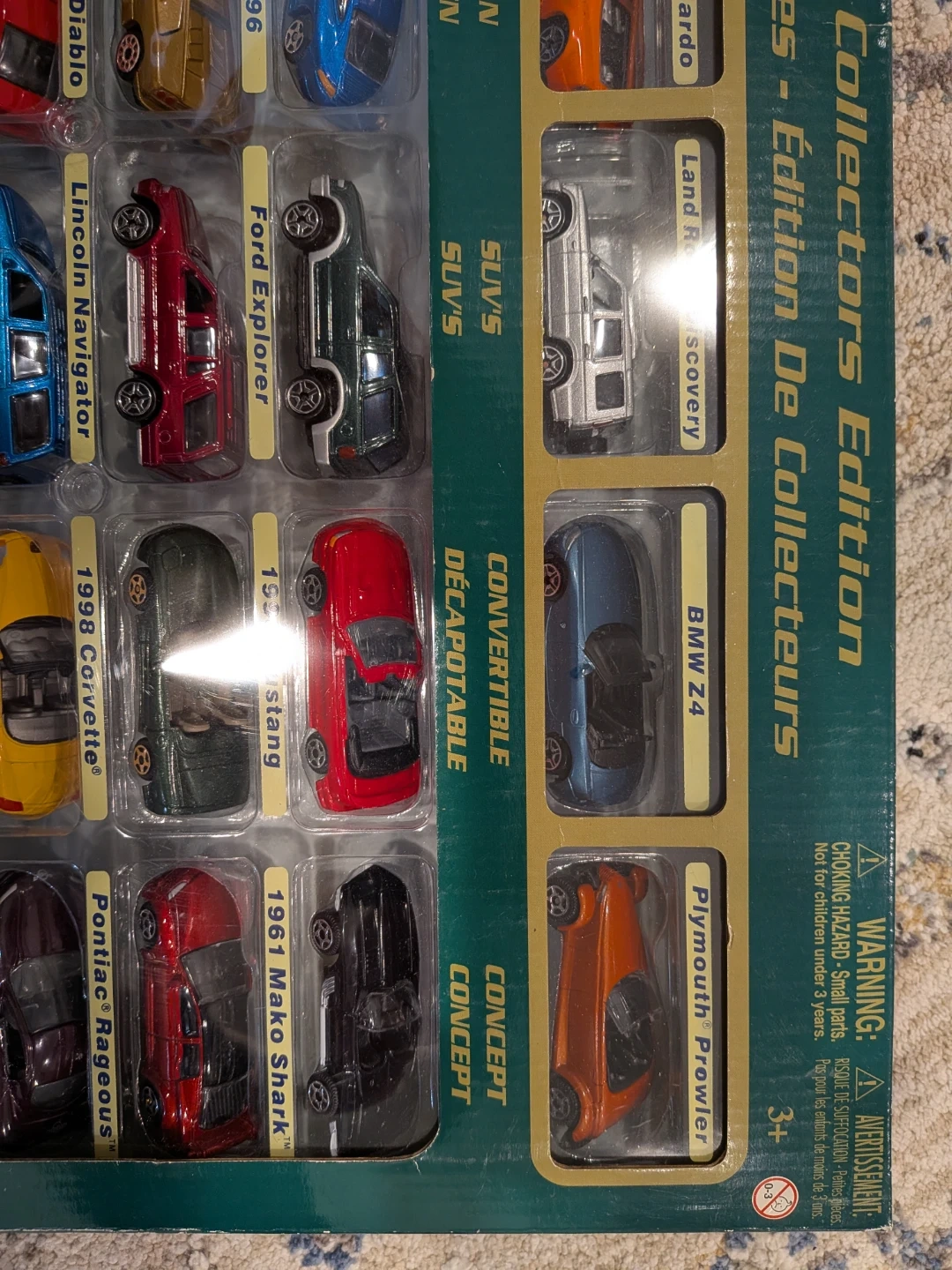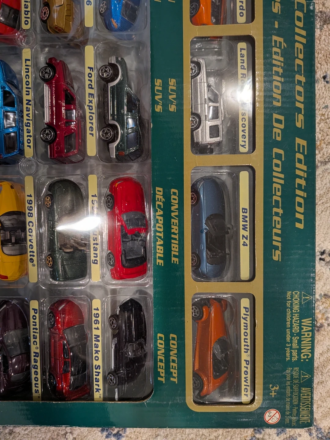 Car Dealership - Collectors Edition - Concession De Voitures - Édition De Collection diecast car set. Includes a variety of car models such as Dodge Viper, Chrysler Crossfire, Saleen S7, Volkswagen Nardo, Land Rover Discovery, Ford Ranger, Ford F-150, 2001 Mini Cooper, Benz C-Class, Lamborghini Diablo, Porsche 996, Lincoln Navigator, Ford Expedition, Ford Explorer, BMW X5, BMW Z8, Porsche Boxster, 1998 Corvette, 1998 Mustang, 1961 Mako Shark, Plymouth Prowler and Mustang Mach III and Corvette Stingray III and Pontiac Rageous