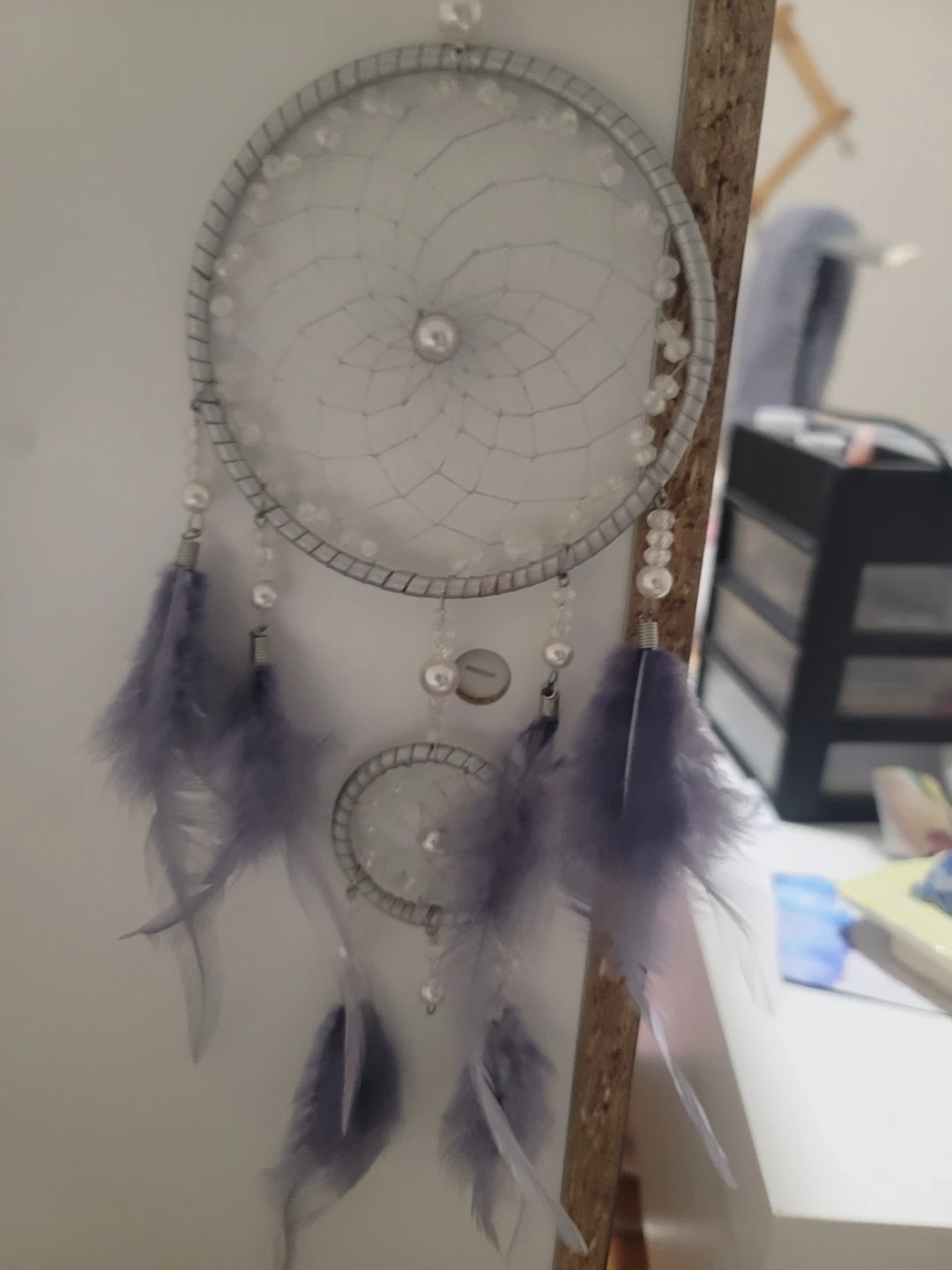 Selling a lovely handmade dream catcher featuring delicate grey feathers and a beaded design. It's in great condition and would be a charming addition to any room!