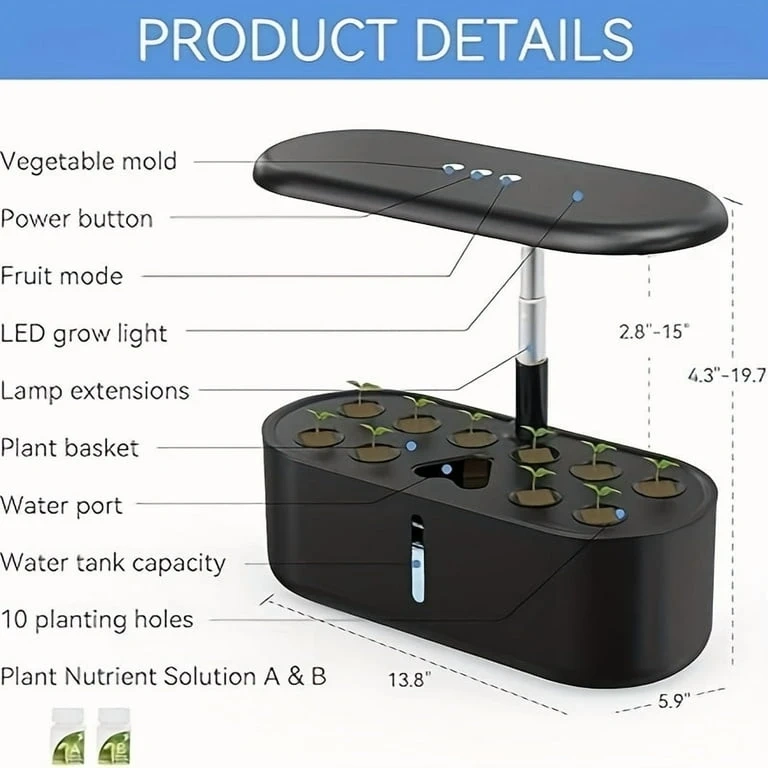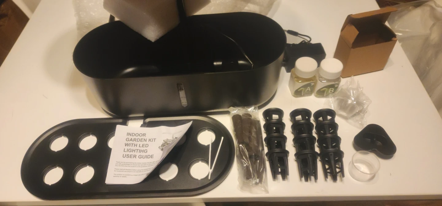 Get your green thumb on with this indoor garden kit! It comes with everything you need to start growing your own herbs, vegetables, or flowers, right in your home. The kit includes the LED grow light, plant baskets, water port, and even the plant nutrient solutions A & B. It has 10 planting holes, so you can grow a variety of plants at once. The water tank capacity is 13.8". Pickup near Harlem and Devon Chicago 60631