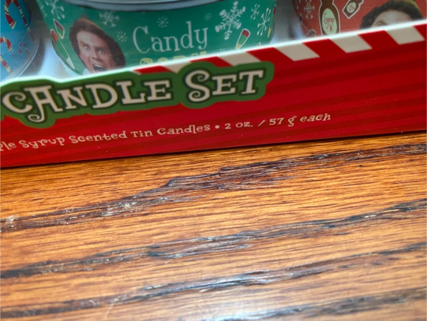 Elf Scented Tin Candle Set! This set includes four scented tin candles, each 2 oz / 57 g. The scents are Candy, Candy Cane, Candy Corn, and Maple Syrup. Perfect for adding a festive touch to your home!