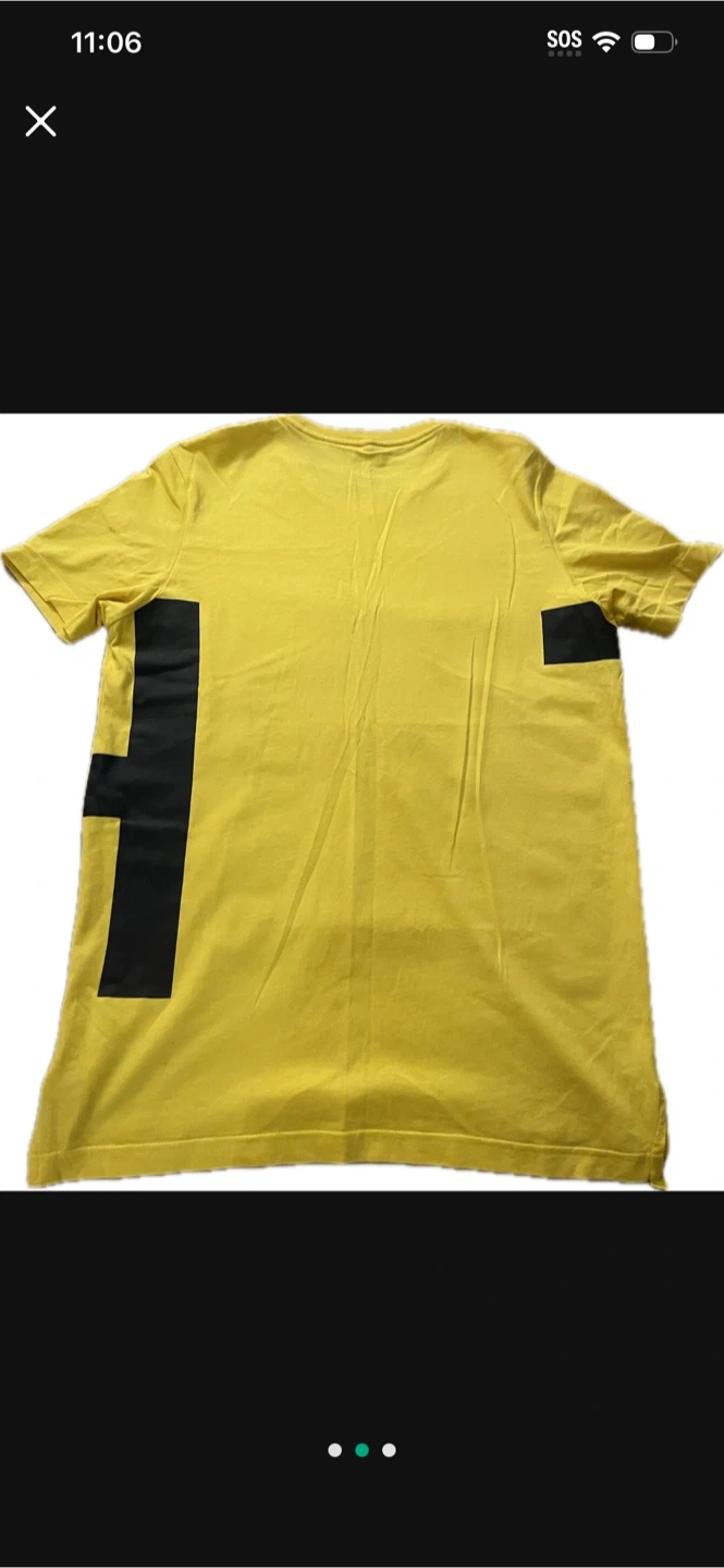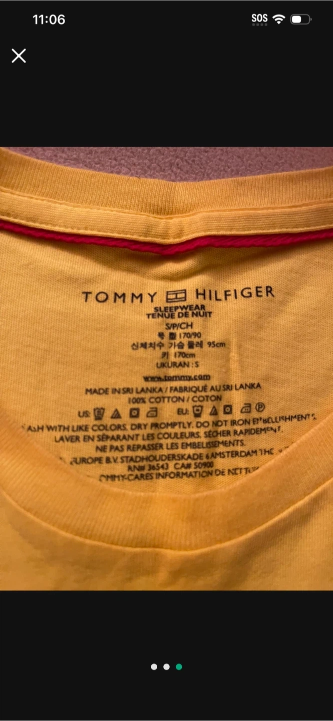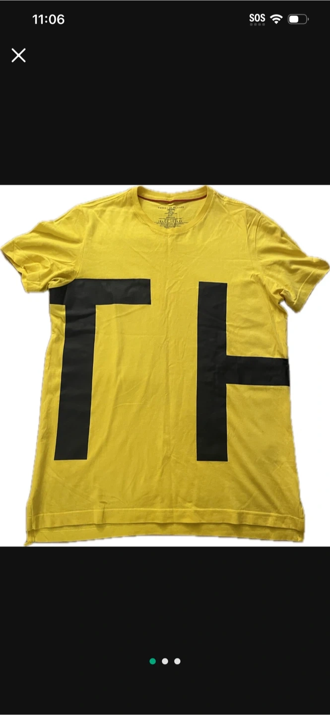 This is a Tommy Hilfiger yellow t-shirt in size S. It's made of 100% cotton. The shirt features a large black "TH" design on the front. It is in good condition.