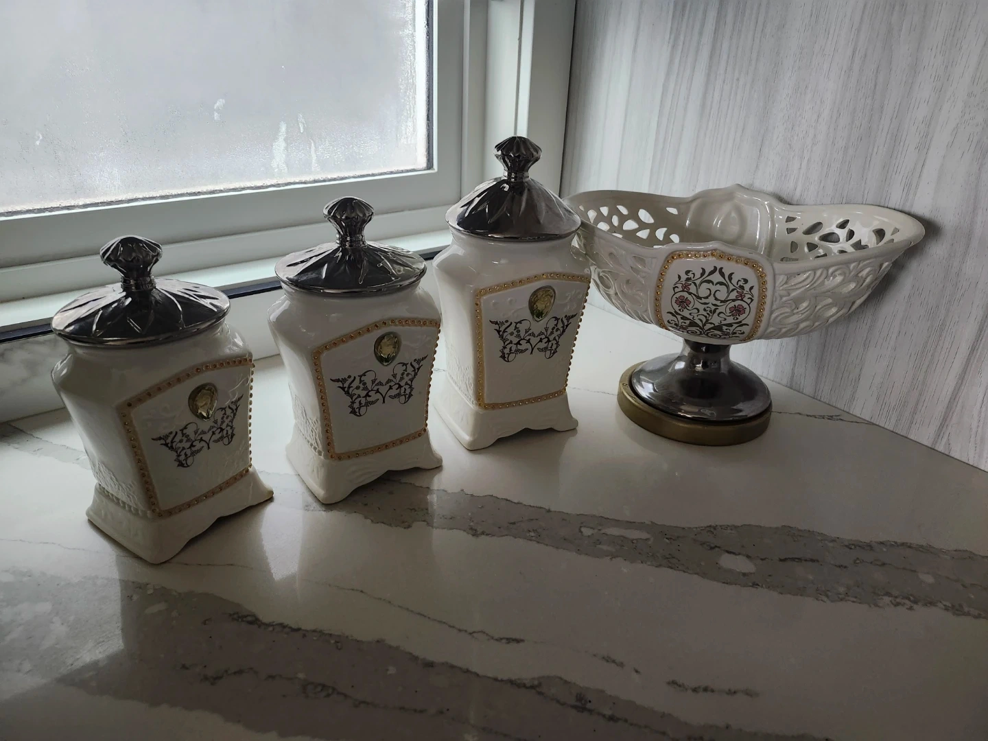 Here's a lovely set of decorative canisters and a beautiful fruit bowl to add a touch of elegance to your kitchen or dining area! They feature intricate designs and a classic colour palette that would complement any home decor