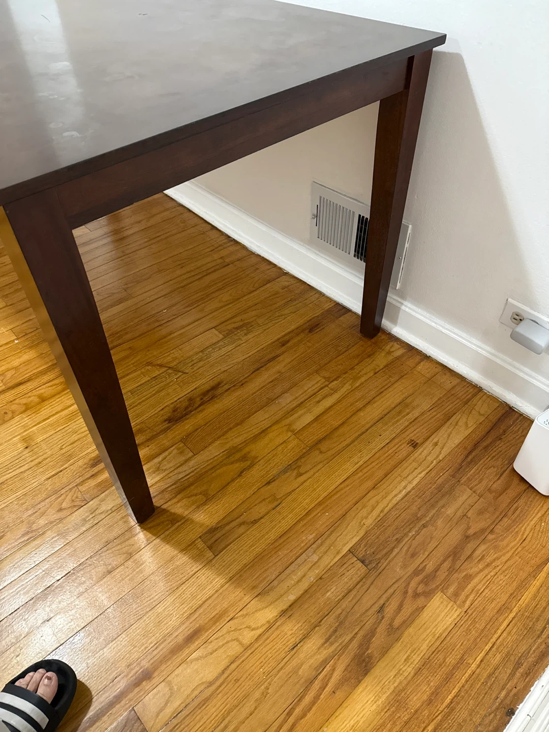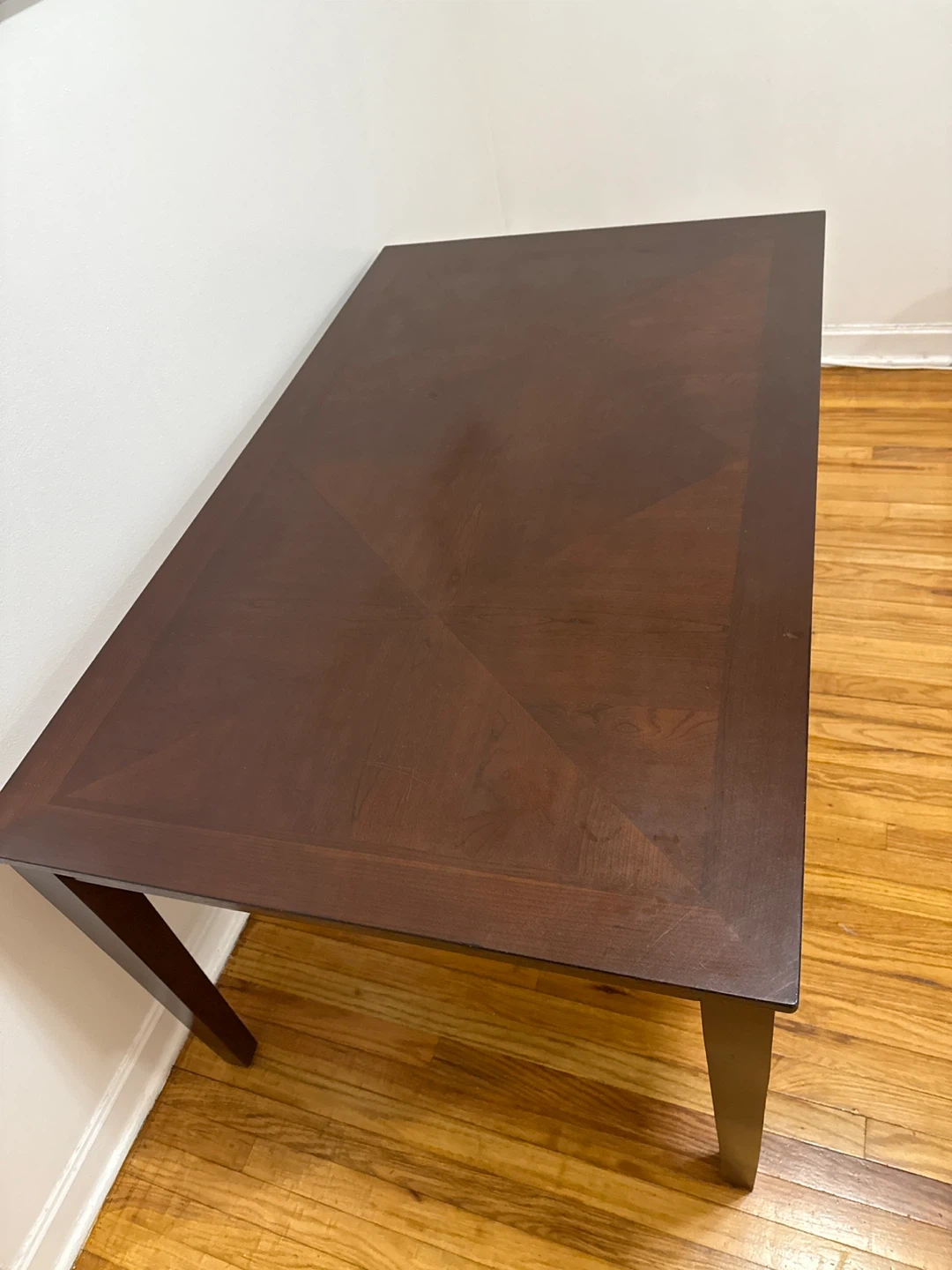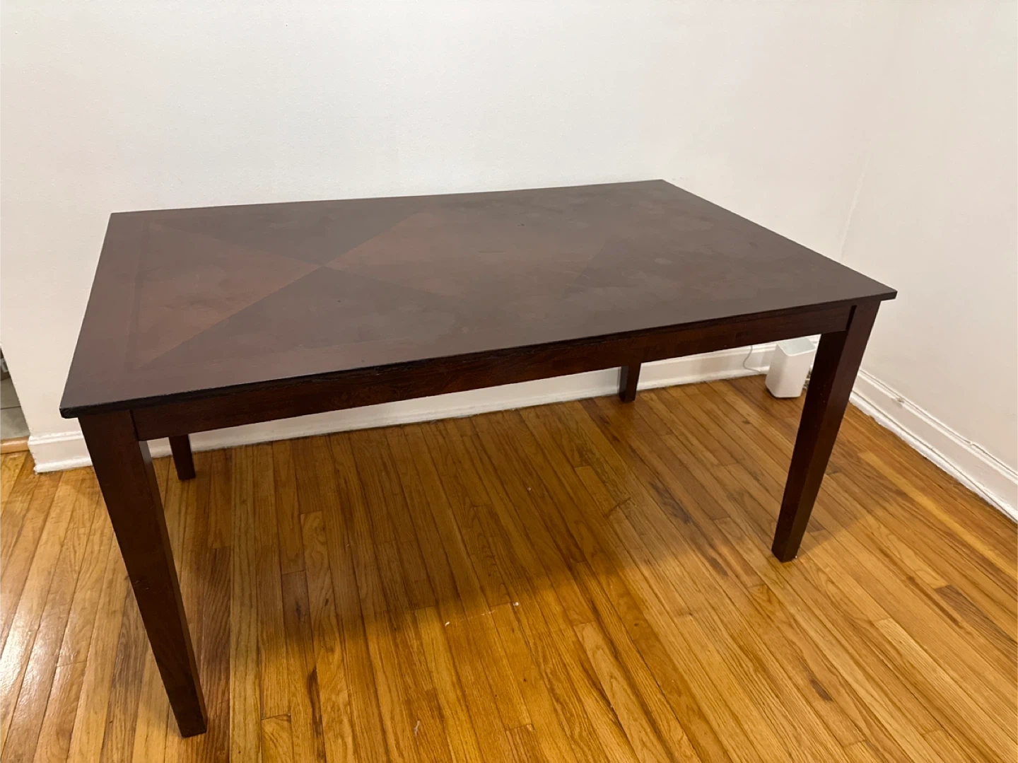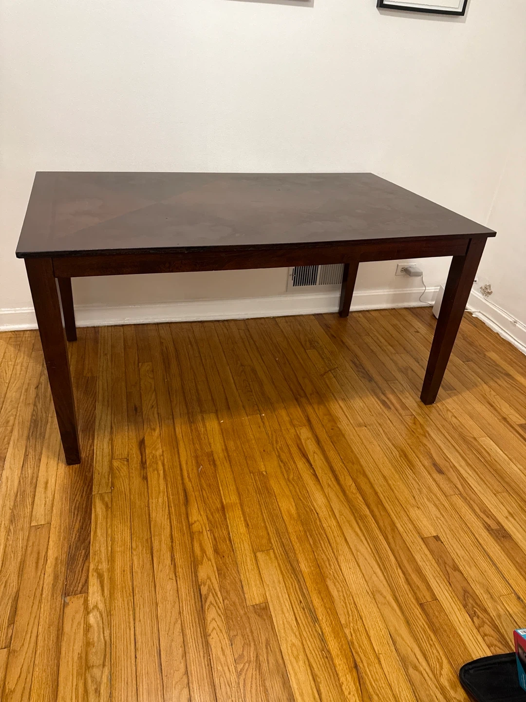 Selling a dark Cherry wooden dining table! It's perfect for smaller dining spaces and has a nice, classic look. It's in good condition and ready for a new home!