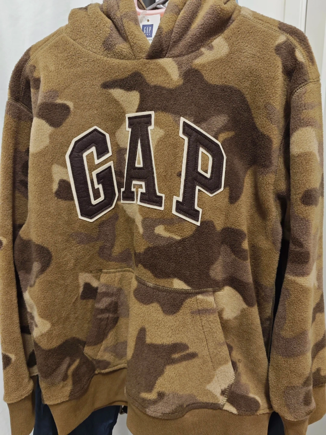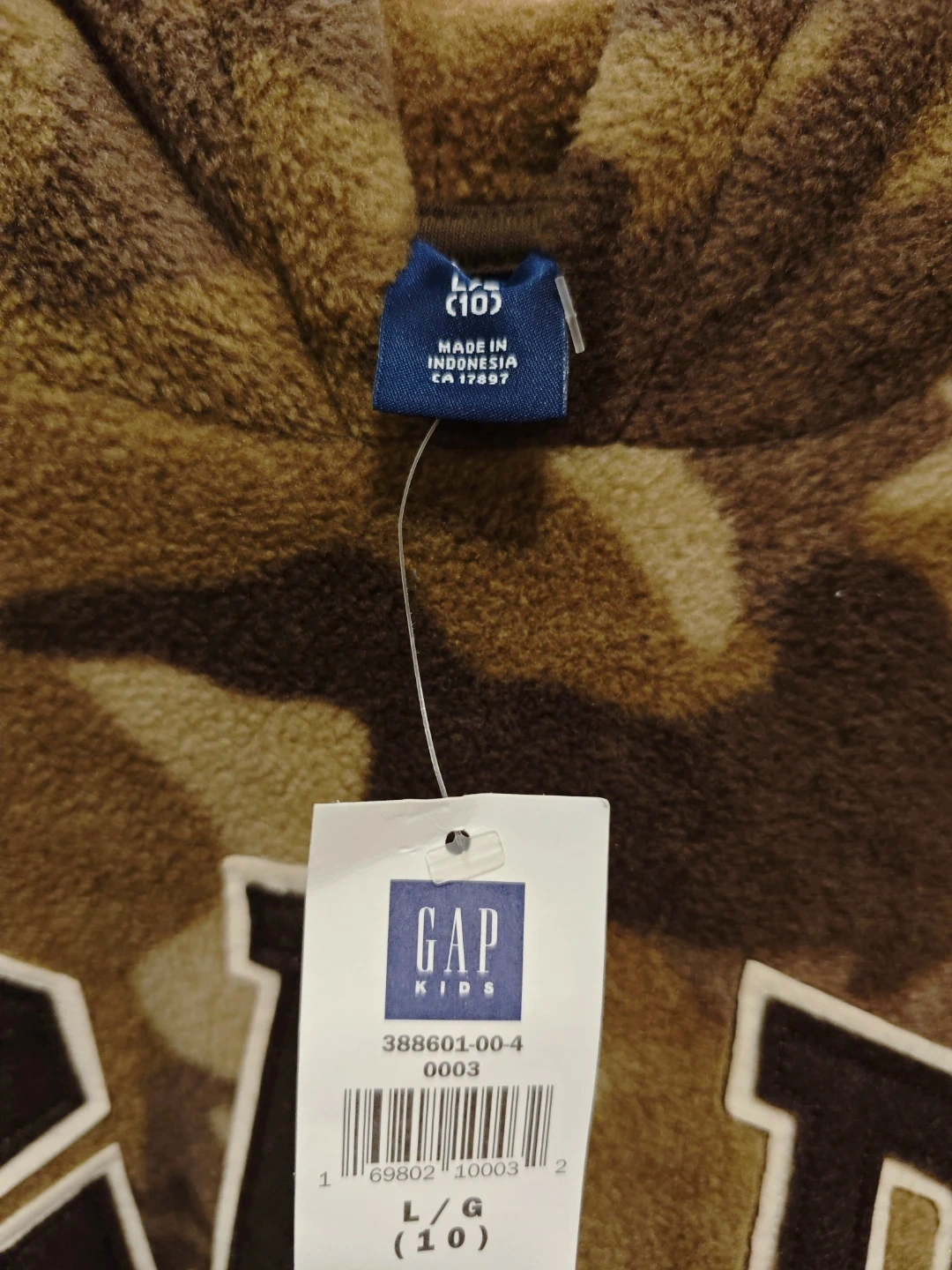 Selling a brand new with tag Gap Kids hoodie in a cool camo pattern. It's a size L (10) and made of soft, cozy fleece material. Perfect for keeping your little one warm and stylish!
