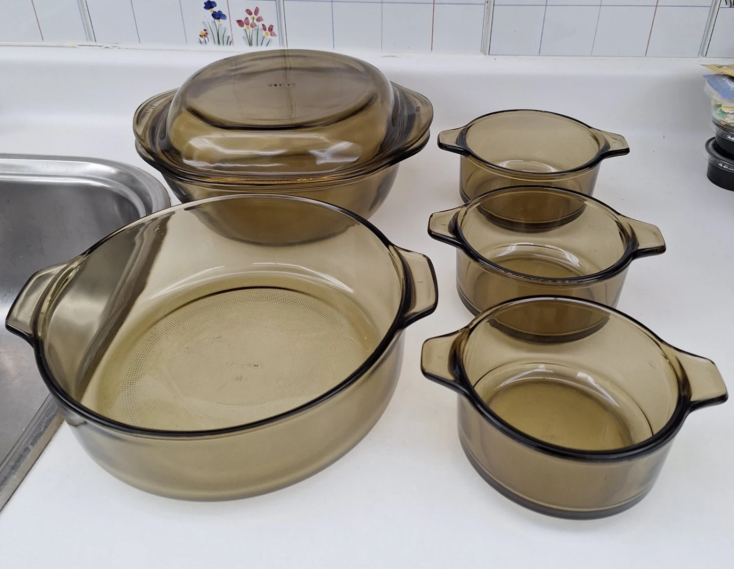 Vision glass cookware set. One covered casserole, one open casserole and three smaller ones. Pickup Scarborough Pharmacy and Ellesmere area.