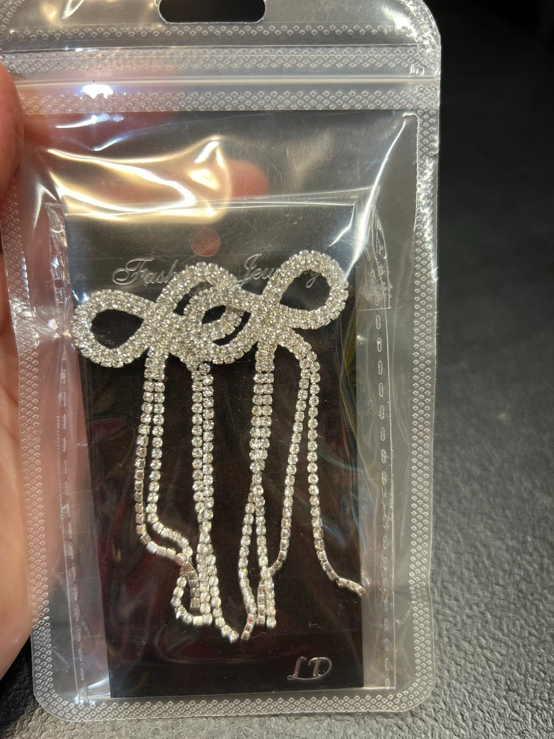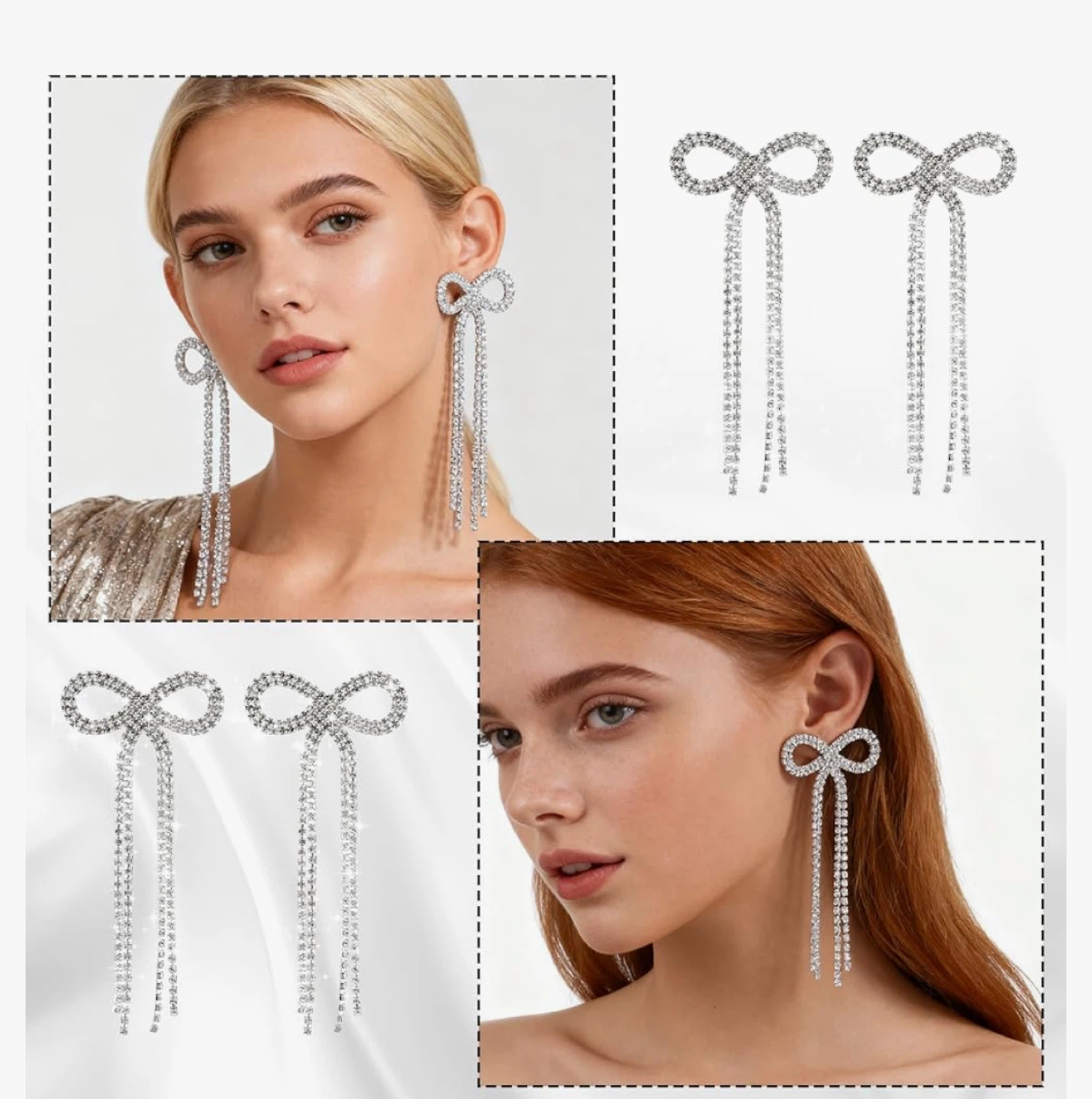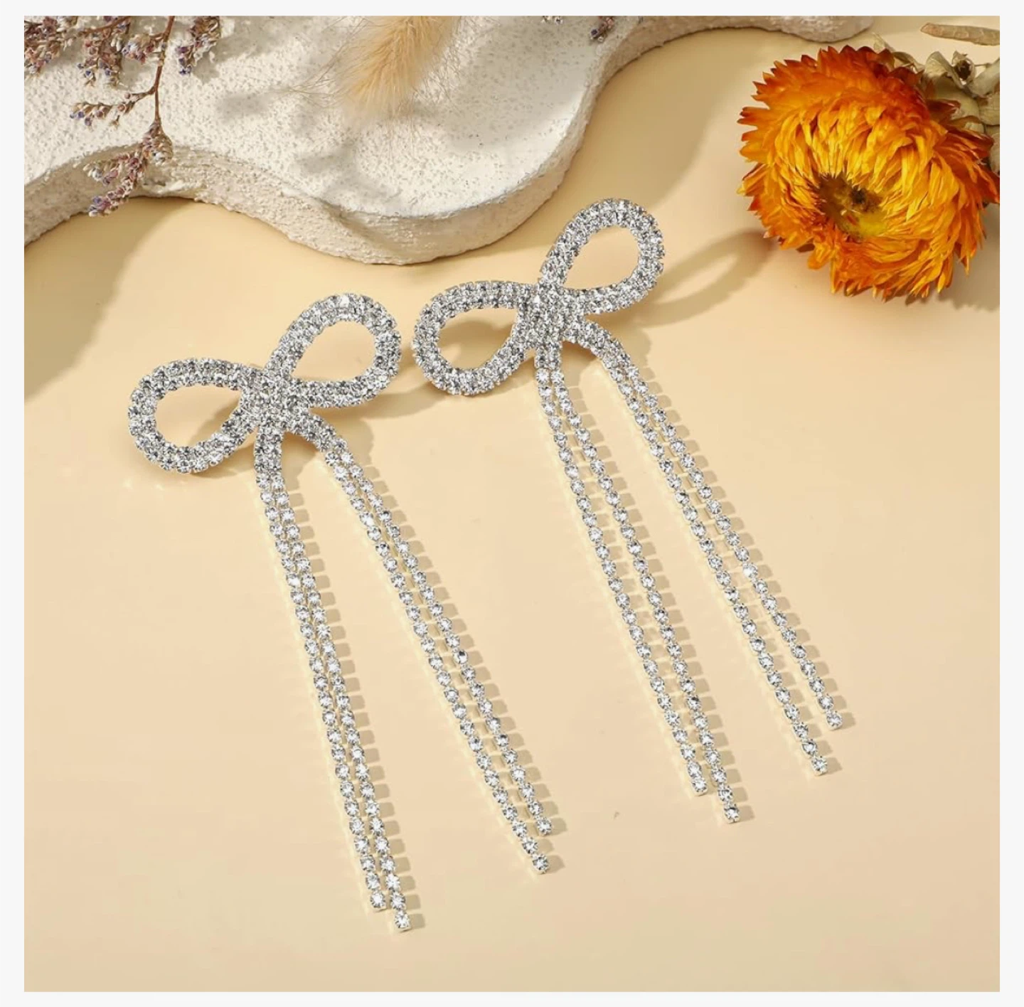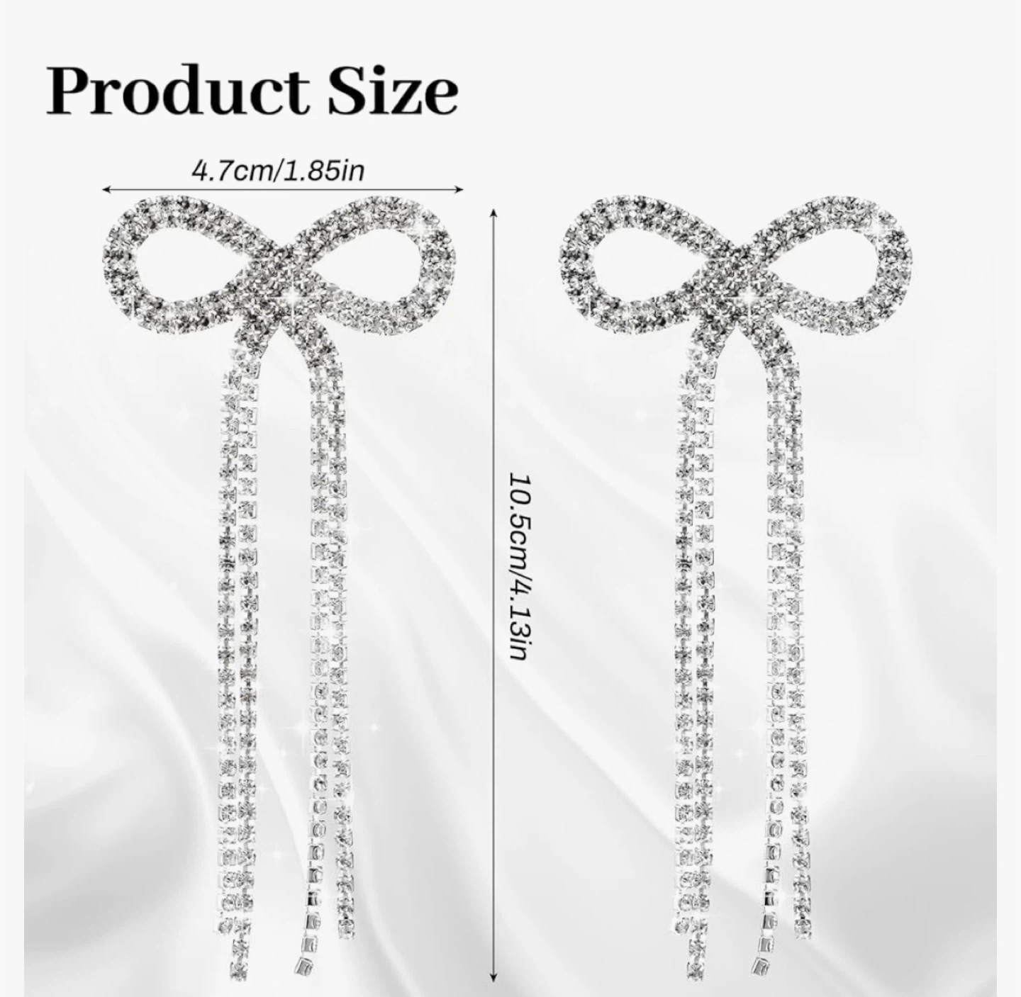 These are a pair of new bowknot dangle earrings! They are silver in color and feature rhinestones. The product size is 4.7cm/1.85in x 10.5cm/4.13in