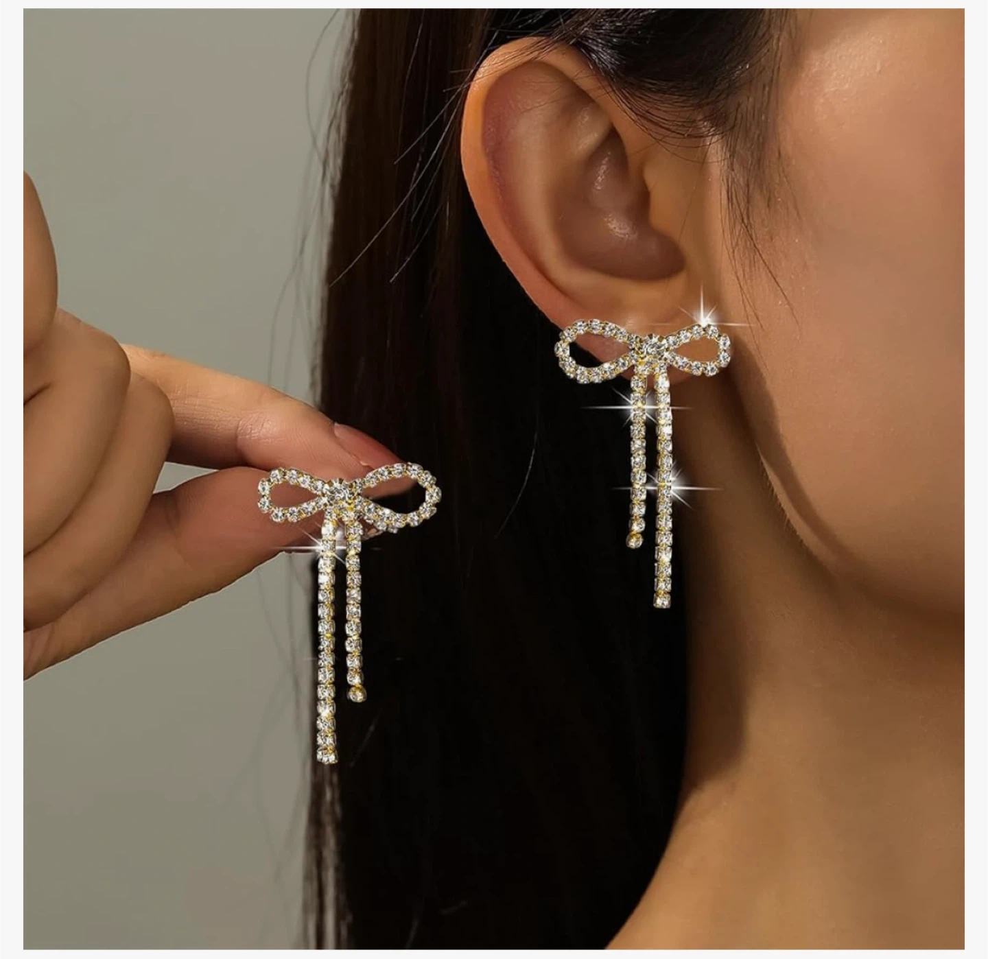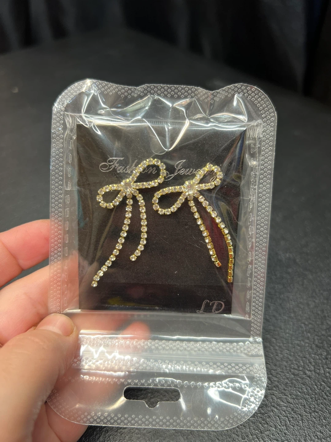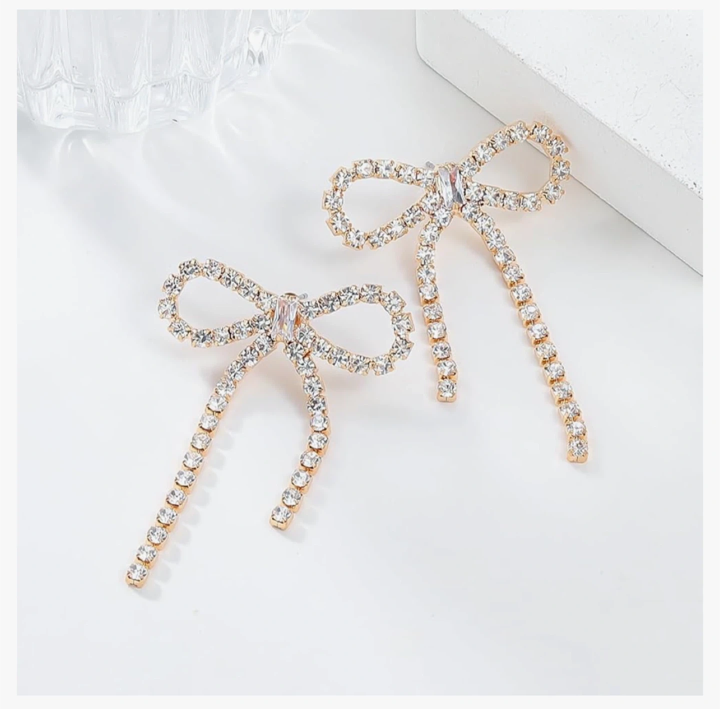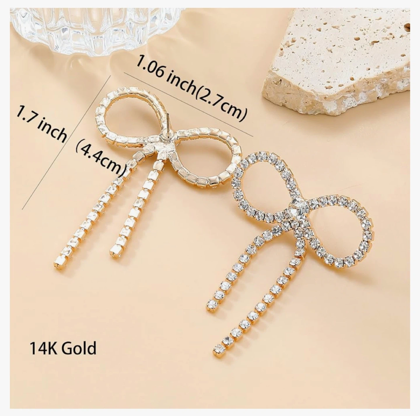 These are a pair of Fashion Jewelry bow earrings. They are gold colored and feature rhinestones. The earrings measure approximately 1.7 inches in length and 1.06 inches in width.