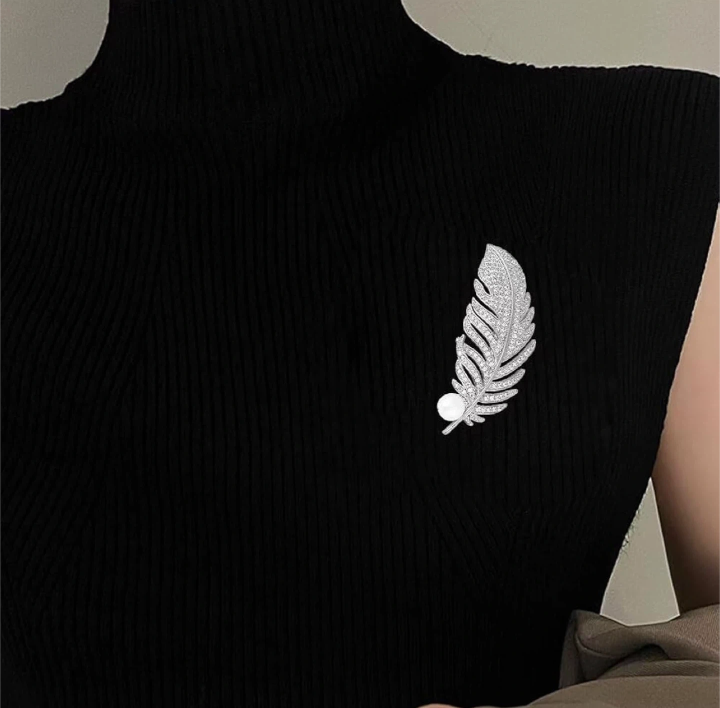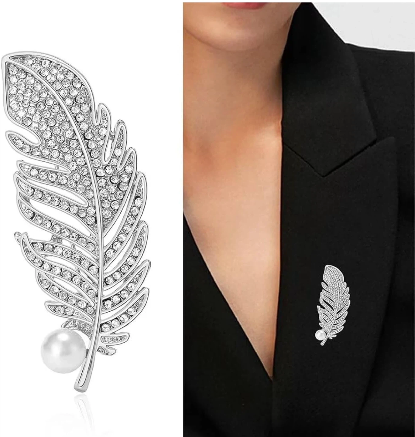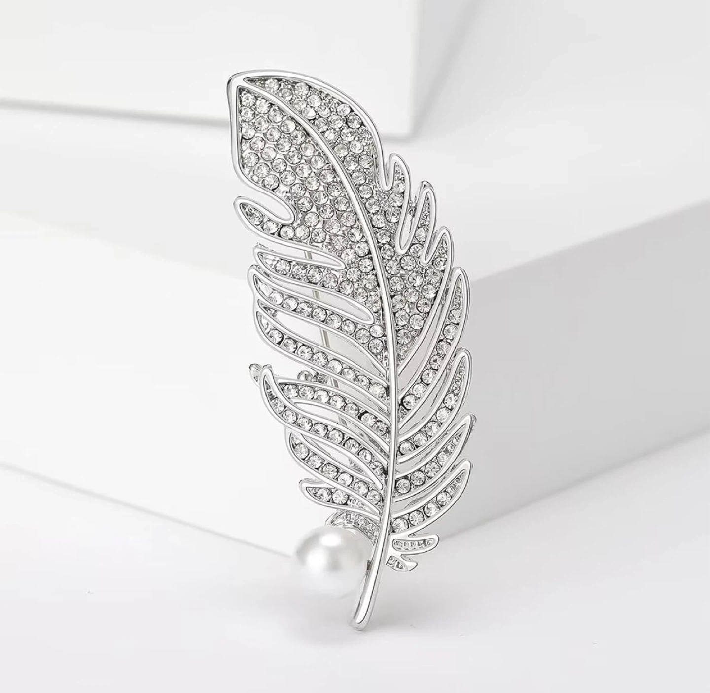 Selling a lovely feather brooch! This piece of fashion jewelry features a delicate feather design adorned with rhinestones and a faux pearl accent. It's in excellent condition and ready to add a touch of elegance to any outfit