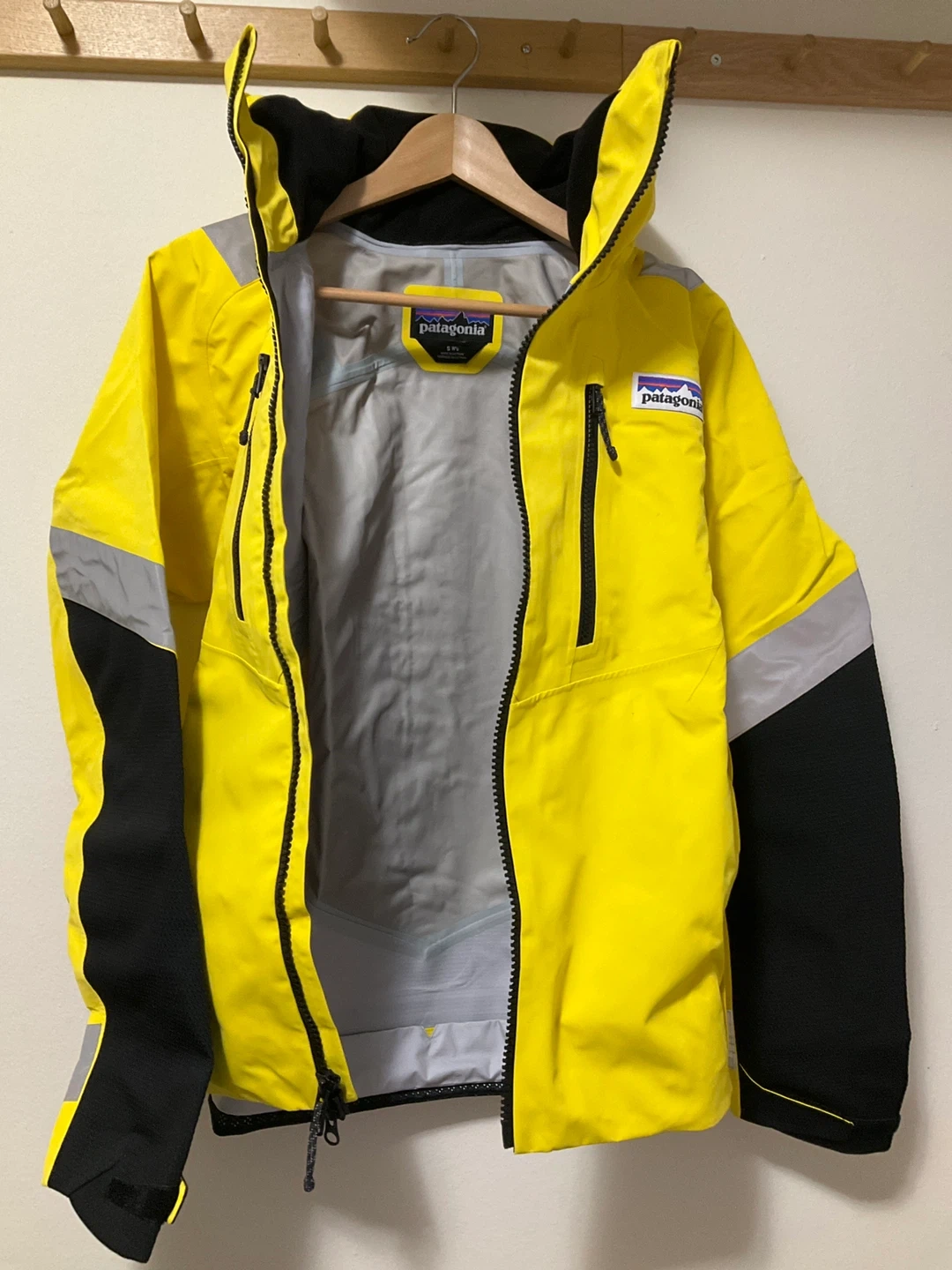 Selling a Patagonia jacket in size small. It's a vibrant yellow colour with black and grey accents. Perfect for staying visible and protected from the elements!