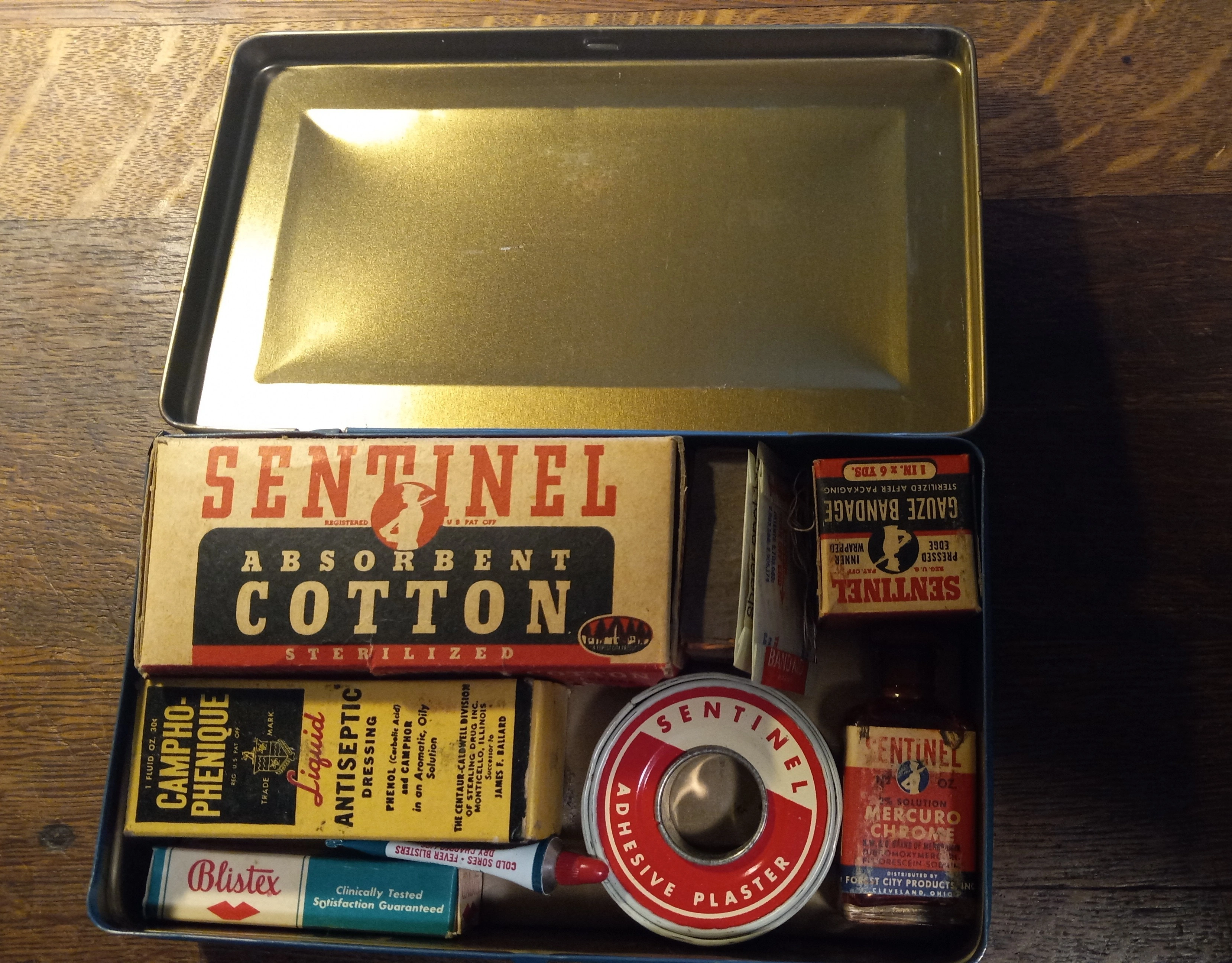 Firestone Tin retains 98% of its paint, has minor wear at edges. Old packages of contents inside - not all full. Small band-aids for head-on collisions. Not meant for future medical uses, but a branded antique.
