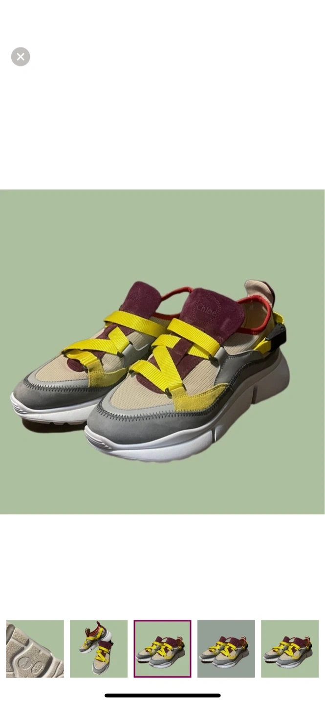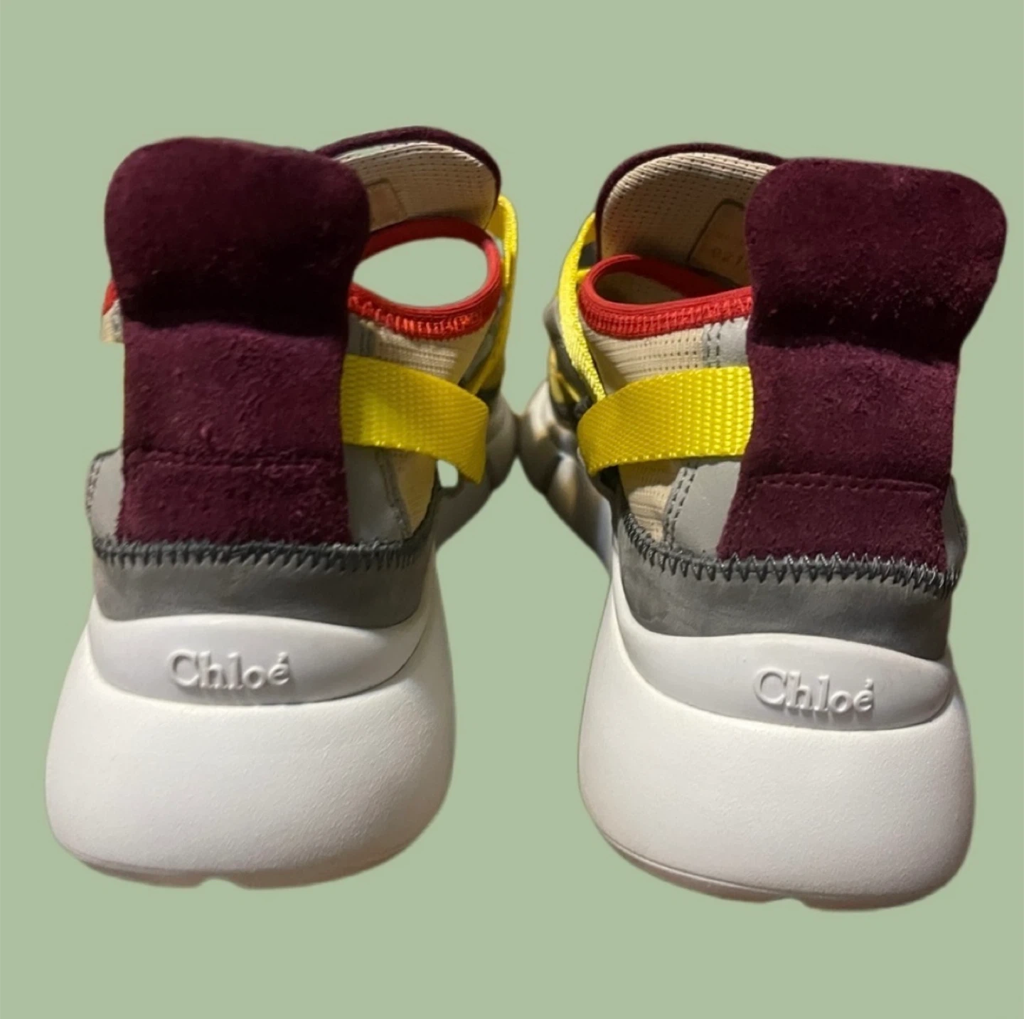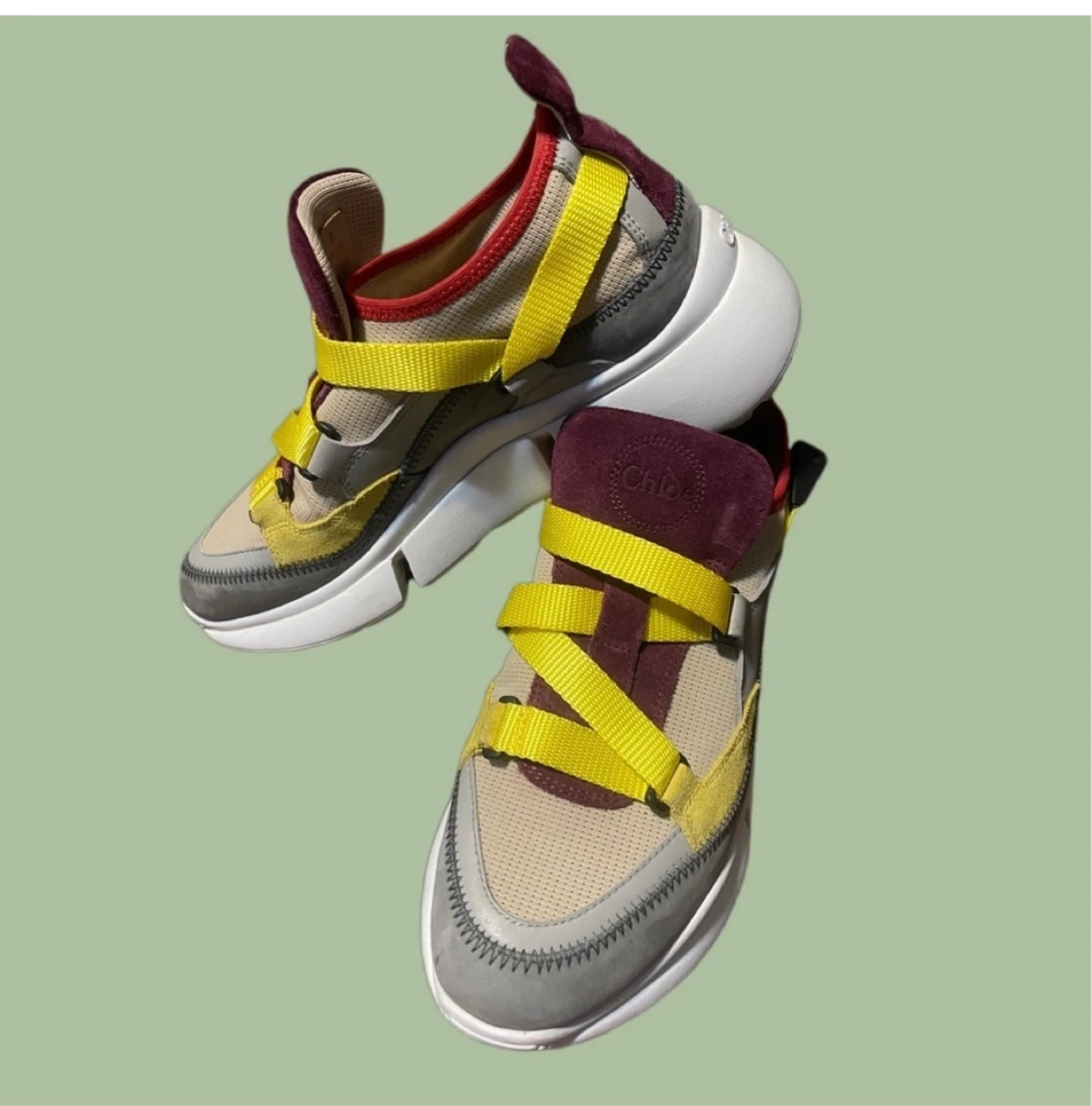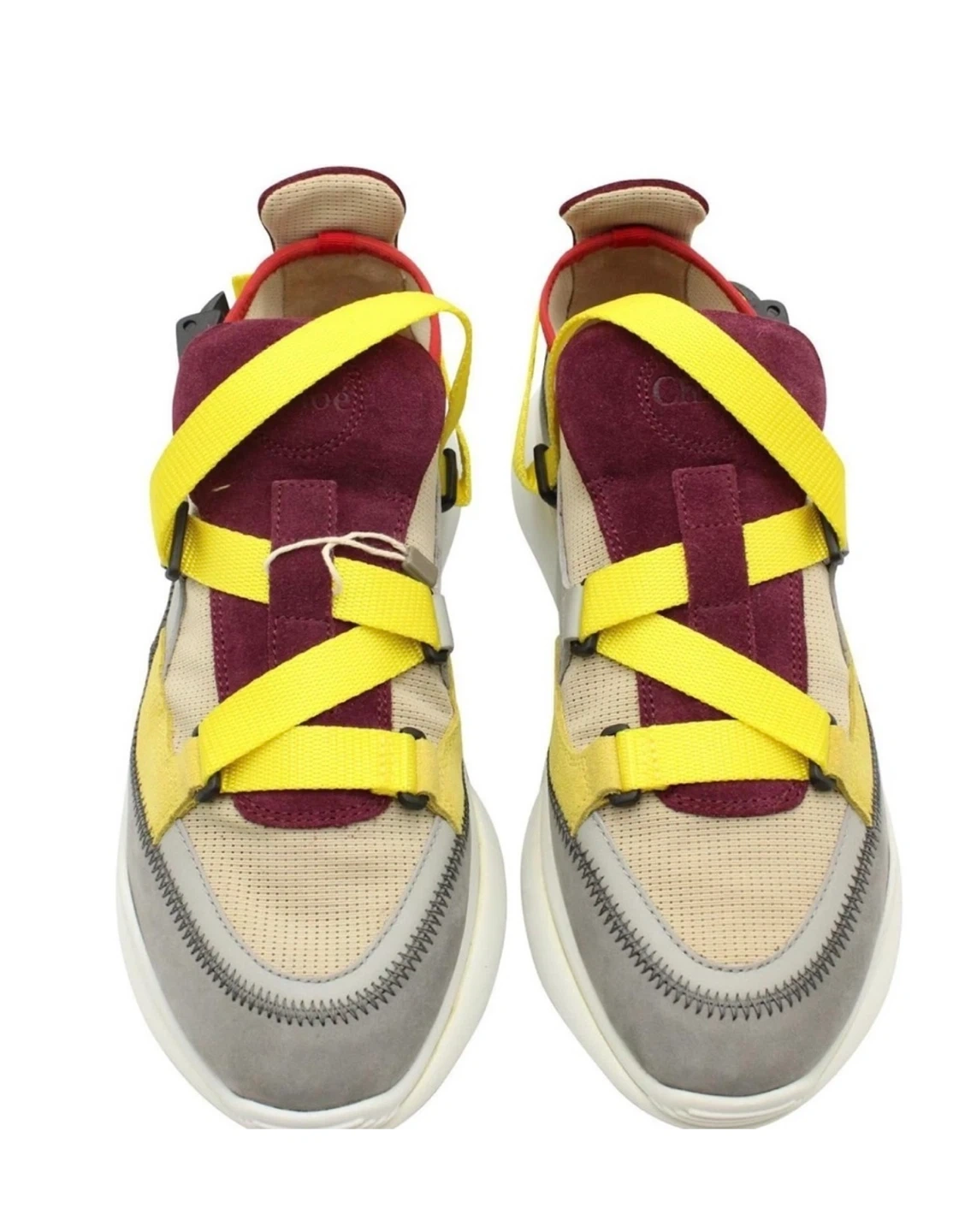Upgrade your designer sneaker collection with these authentic Chloé Sonnie Sneakers in European size 38 (fits US 7.5–8). Made in Italy with exceptional craftsmanship, this unique colorway features yellow nylon cross-straps, burgundy suede tongue, grey leather details, and breathable mesh panels.