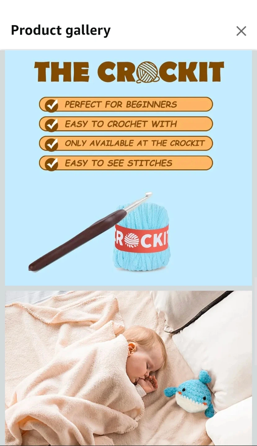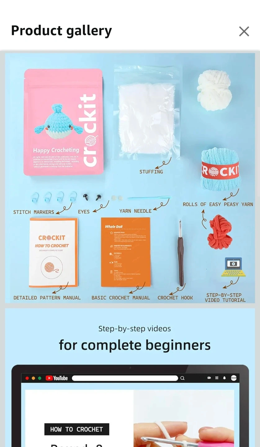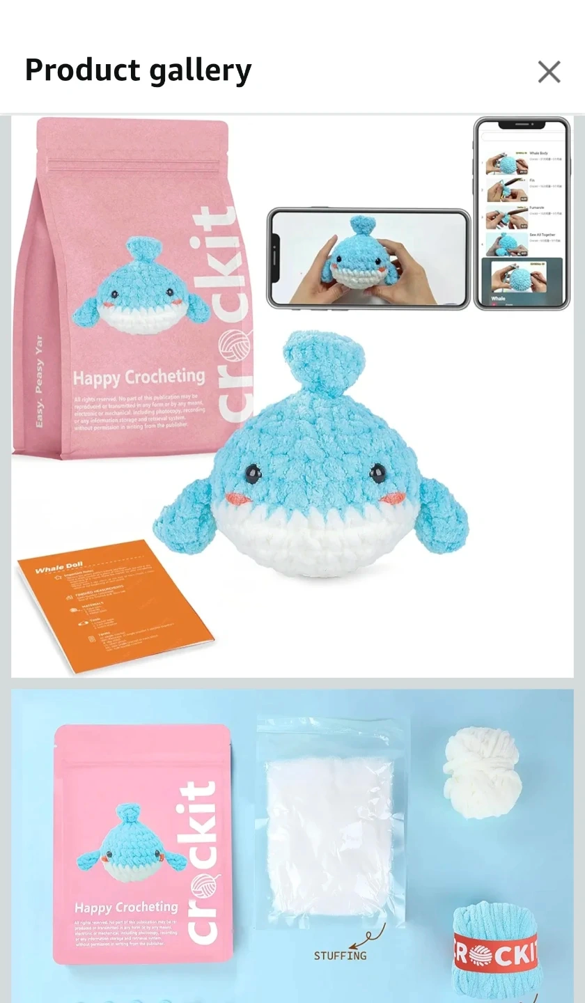Selling a brand new Crockit crochet kit to make an adorable whale doll! This kit includes everything you need to get started, including cotton yarn, stitch markers, stuffing, a crochet hook, a yarn needle, knitting instructions, plastic eyes, and access to step-by-step videos. It's perfect for complete beginners! The finished size of the doll is 5.1 inches.