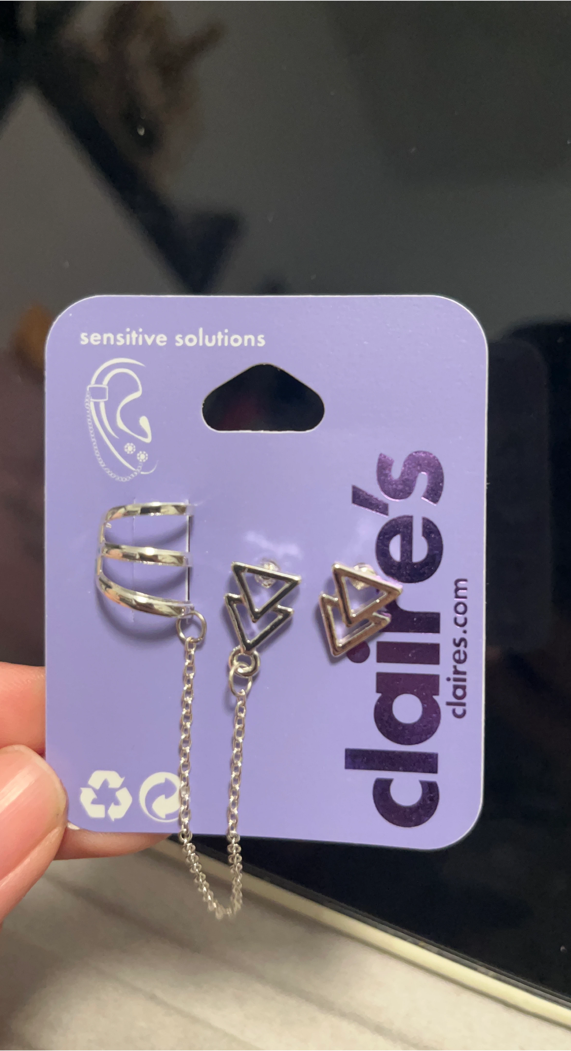 Selling a brand new Claire's ear cuff and stud set! This set includes a silver ear cuff with a chain, and a stud earring: silver with a triangle design. Perfect for adding a bit of edgy style to any outfit