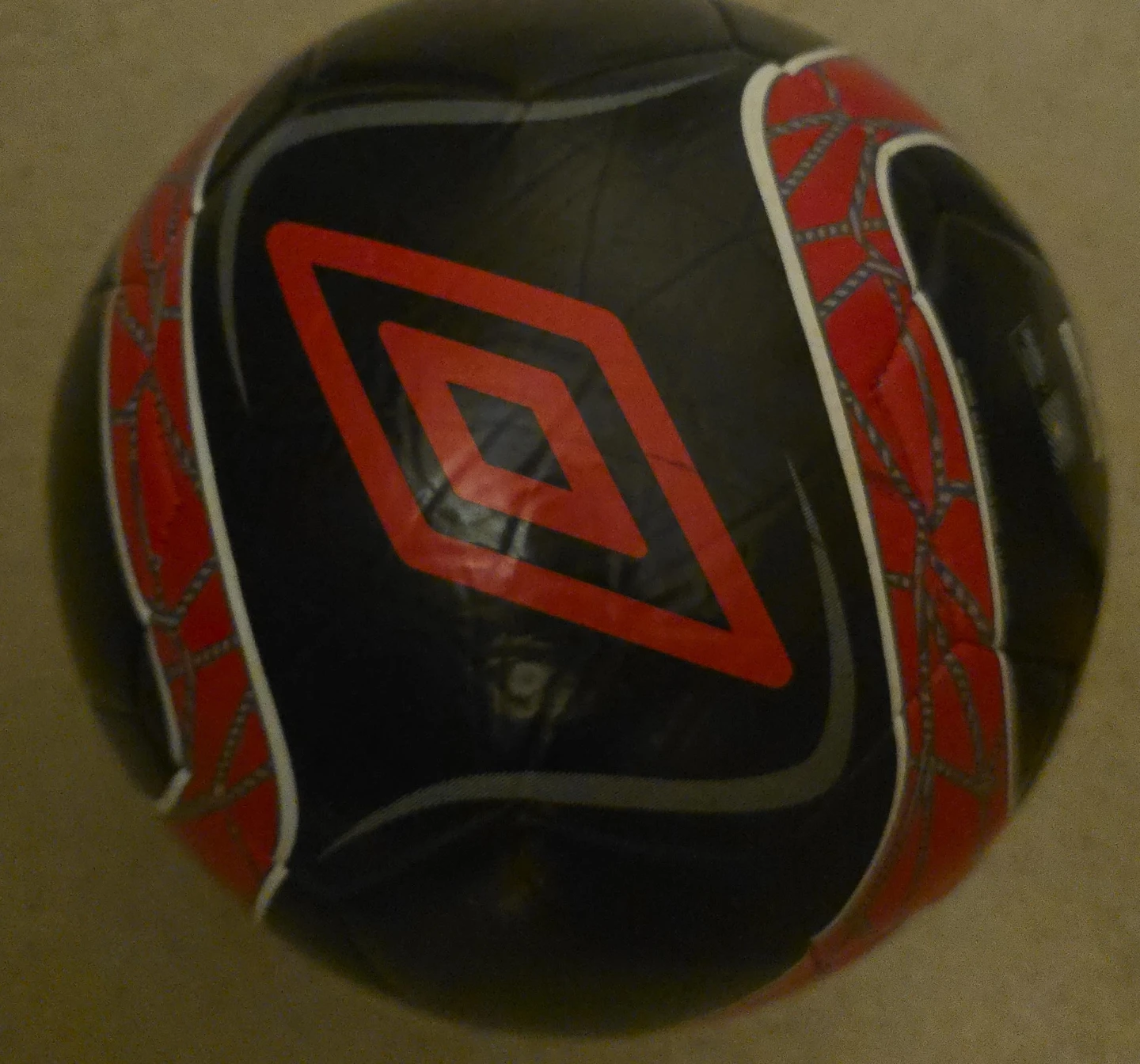 Selling an Umbro Neo Trainer soccer ball in size 5. It's designed for grass training. The ball is black with red and grey accents.