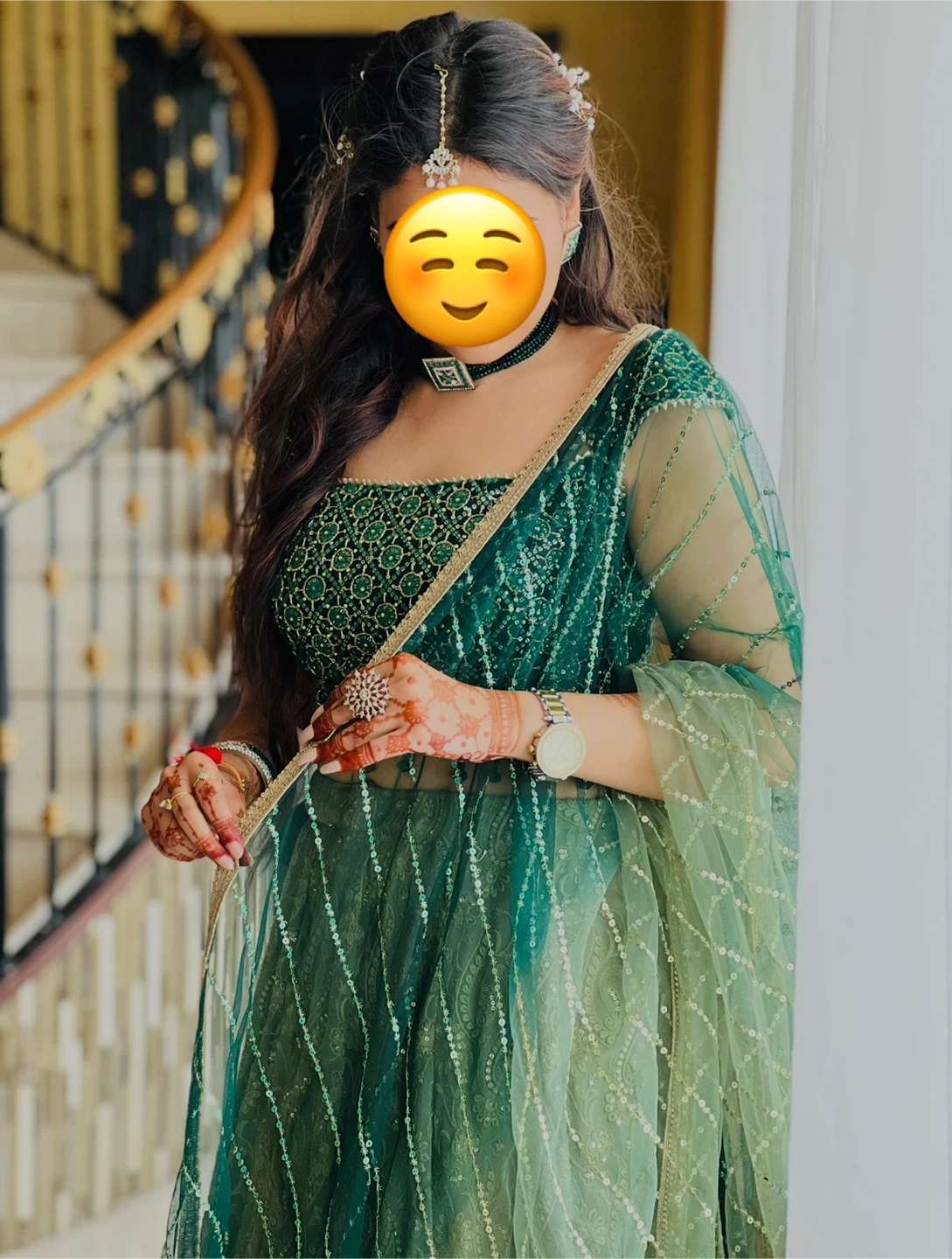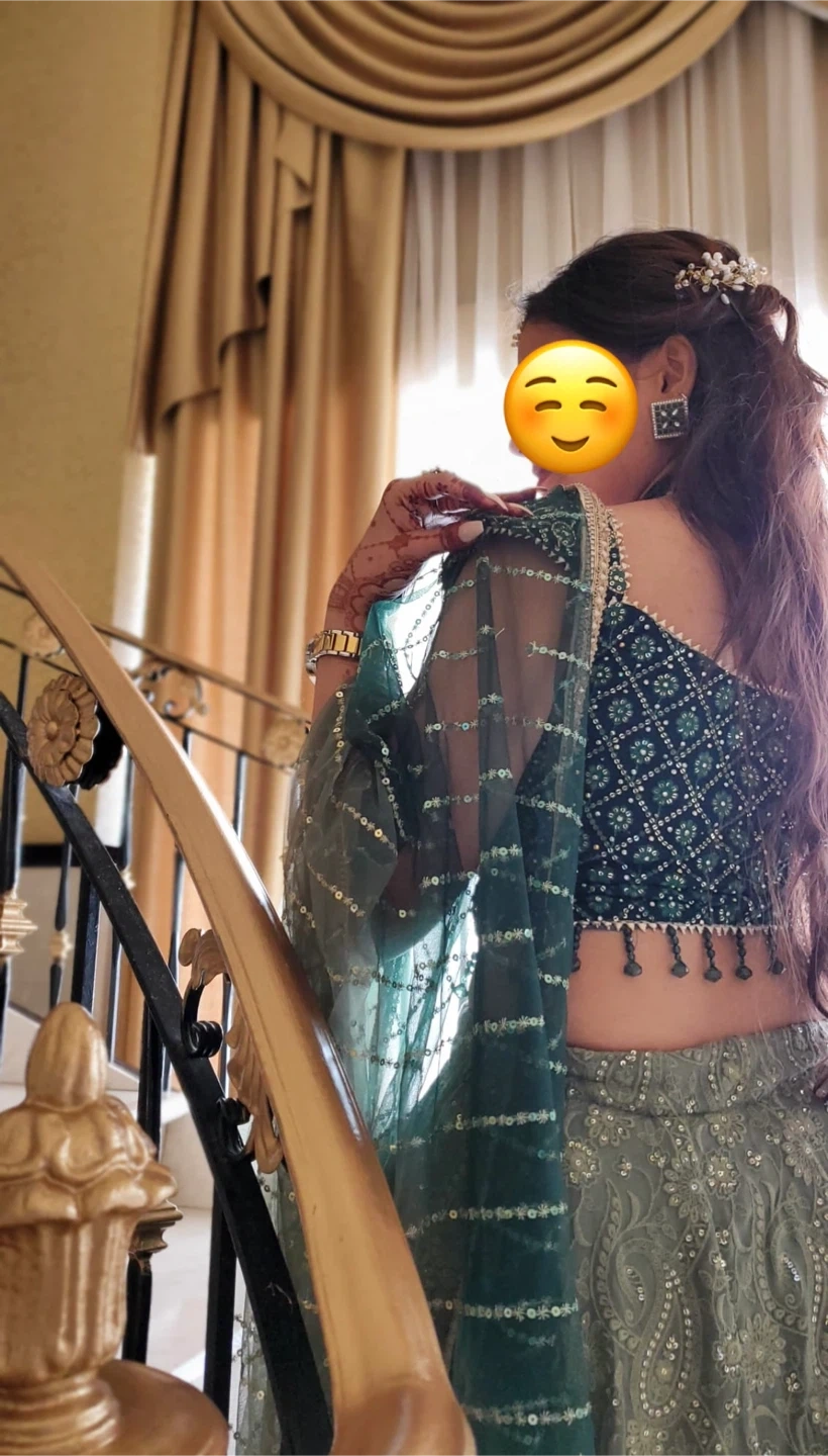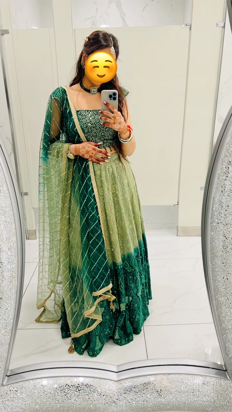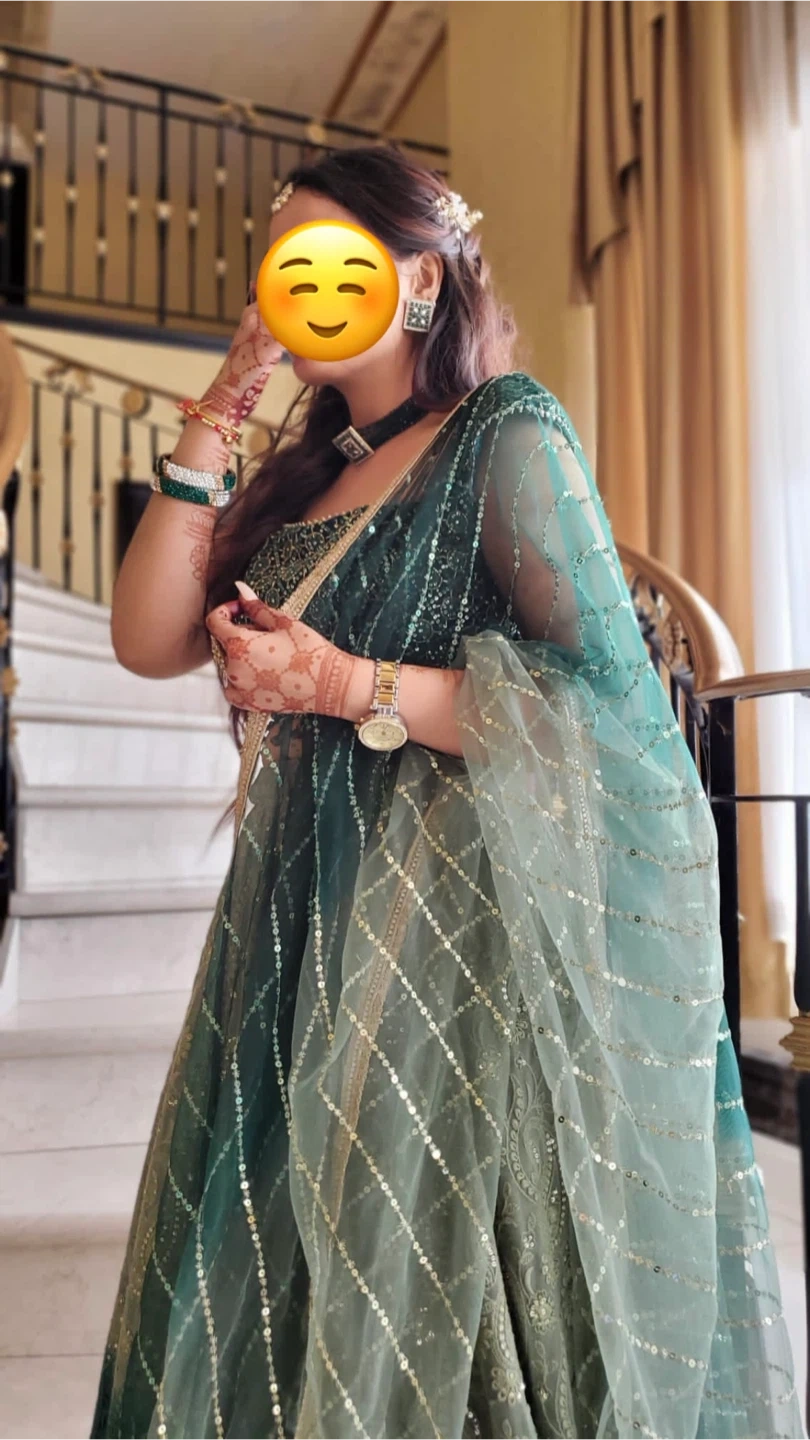 Green lehenga in excellent condition, worn once for my brother’s wedding in Canada. Fabric is soft, flowy, and sits beautifully in photos. The work is intact, no loose threads, no stains, and absolutely no odour.