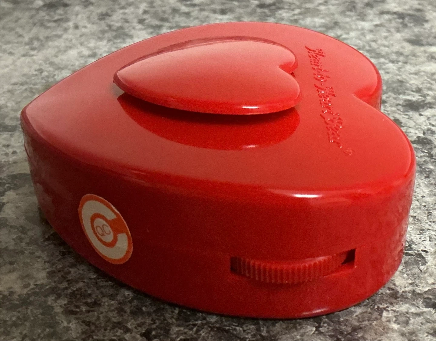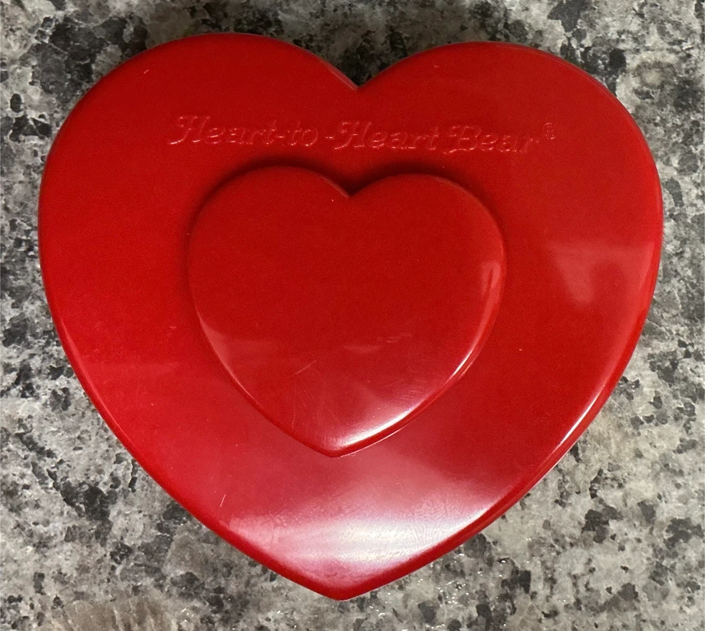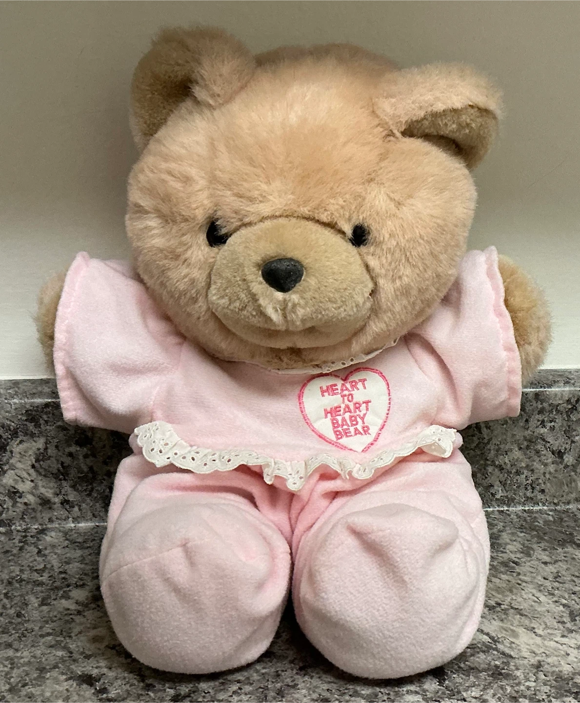 Selling a cute Heart to Heart Baby teddy bear. It's in good condition and ready for a new home! The bear has a pink outfit and a heart on the chest. Opens at the side to put the red heart in. Needs battery, not included.
