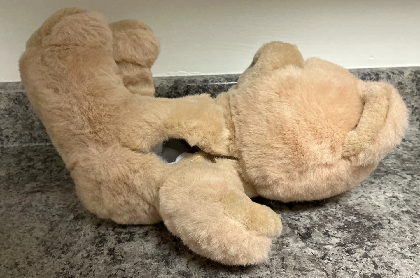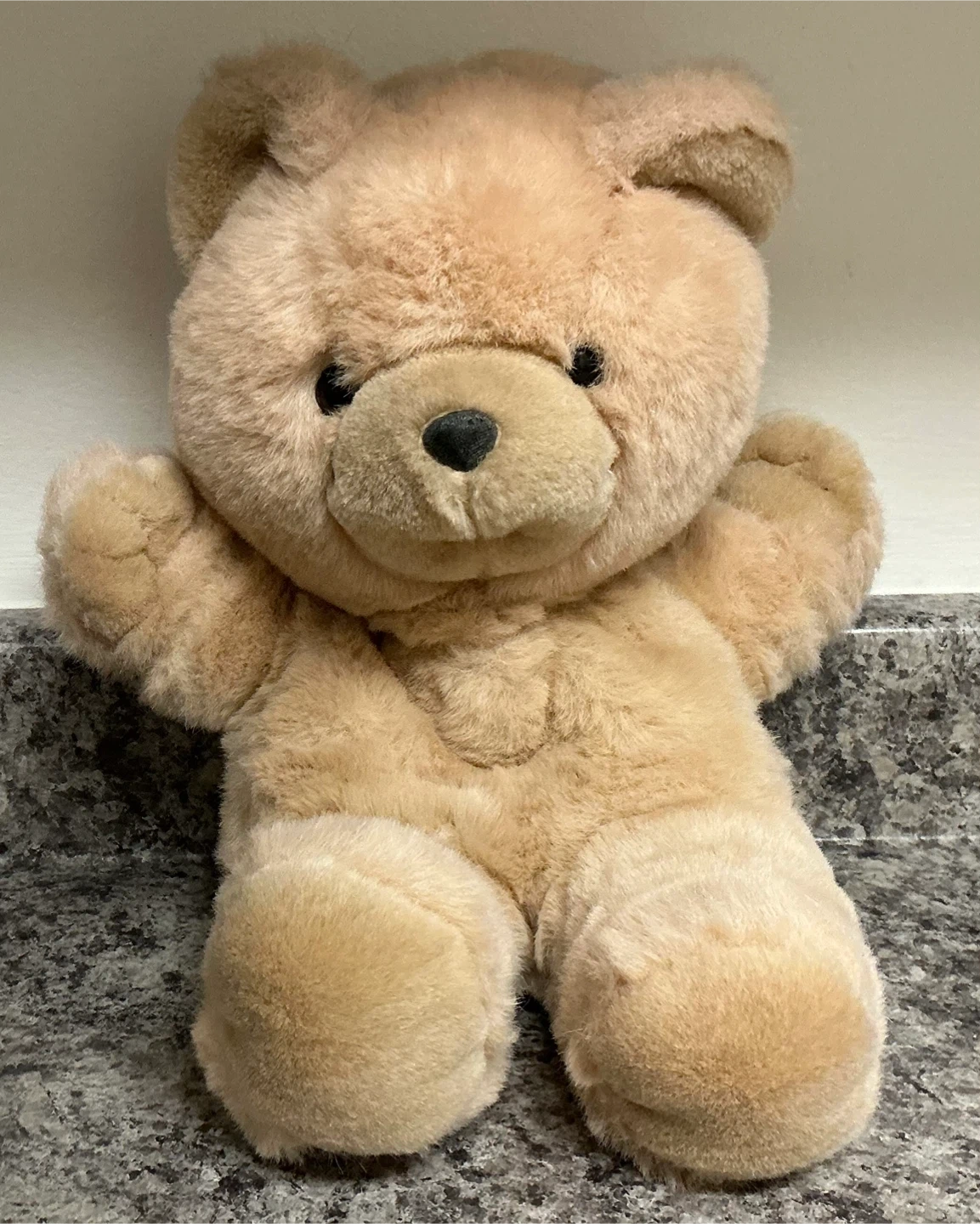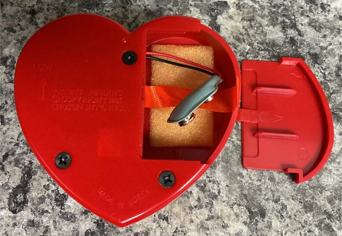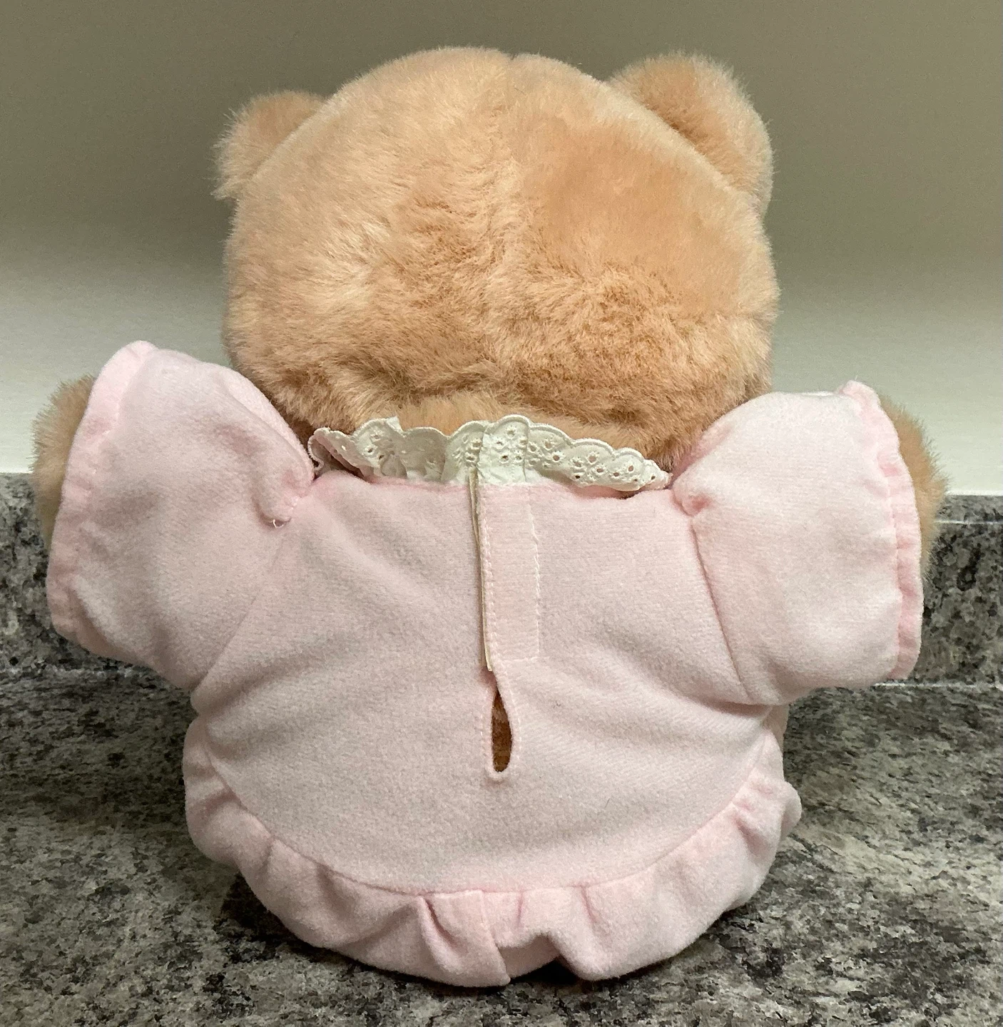 Selling a cute Heart to Heart Baby teddy bear. It's in good condition and ready for a new home! The bear has a pink outfit and a heart on the chest. Opens at the side to put the red heart in. Needs battery, not included.