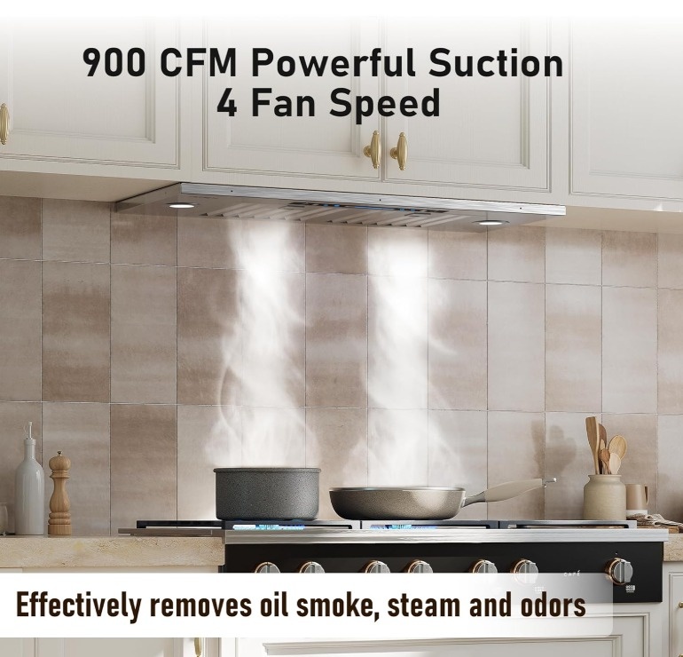 【Powerful Airflow】: Maximum 900 CFM large airflow with good balance fans efficiently removes large amounts of smoke and cooking odors with ease from the air in your kitchen.