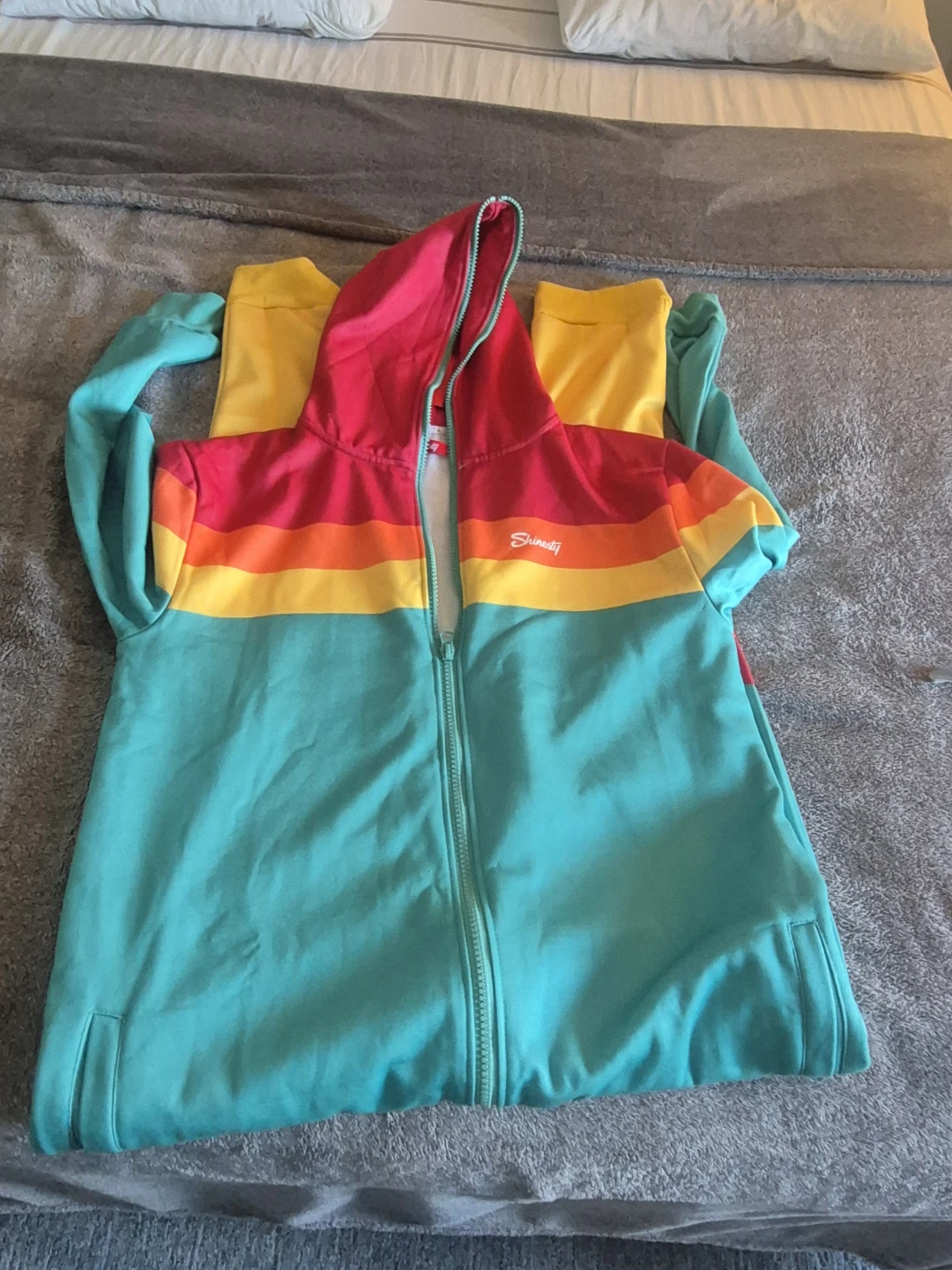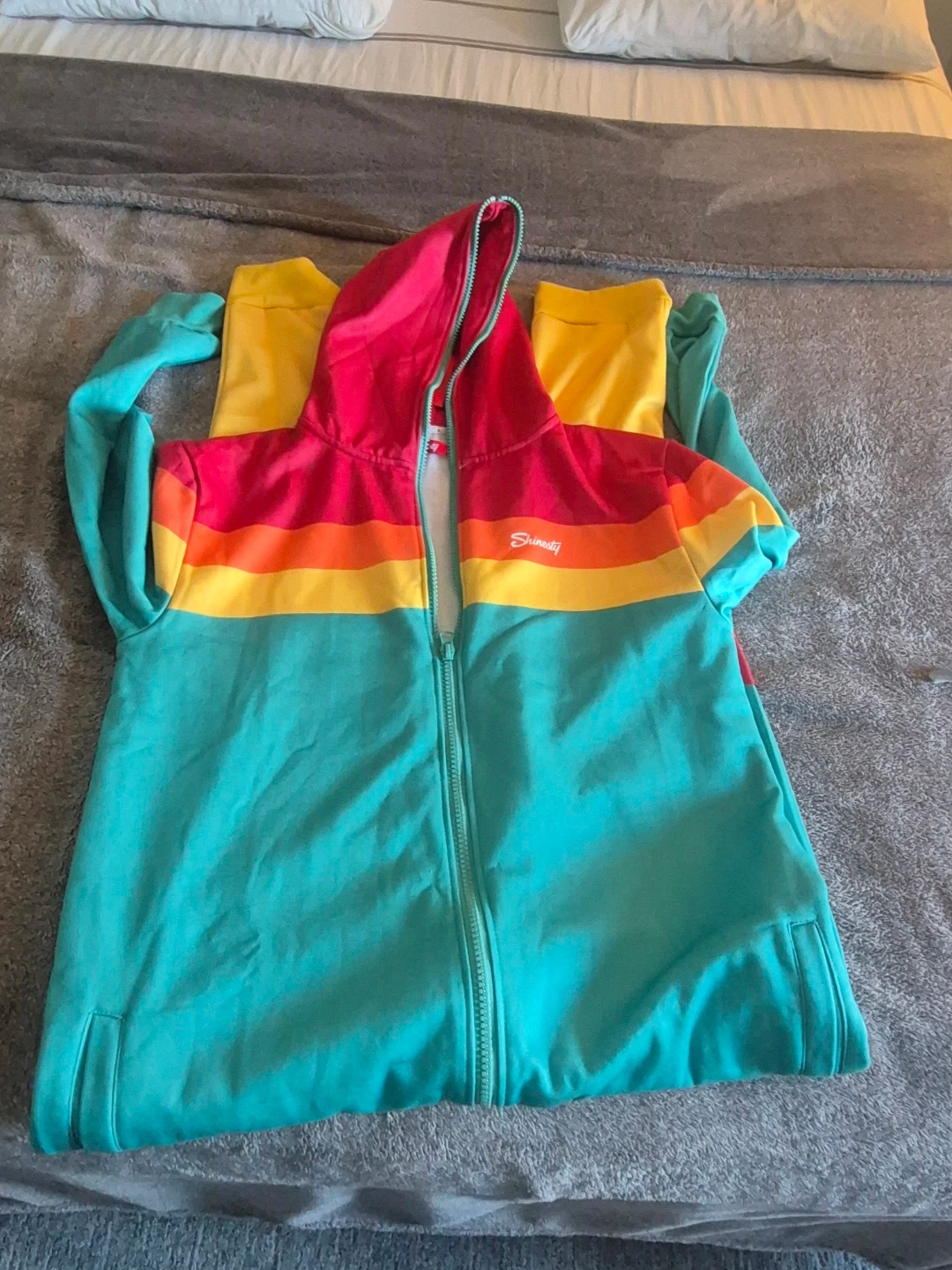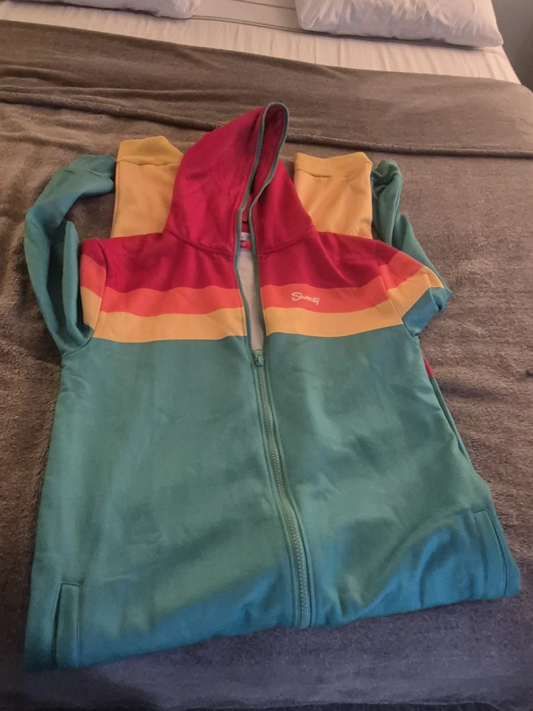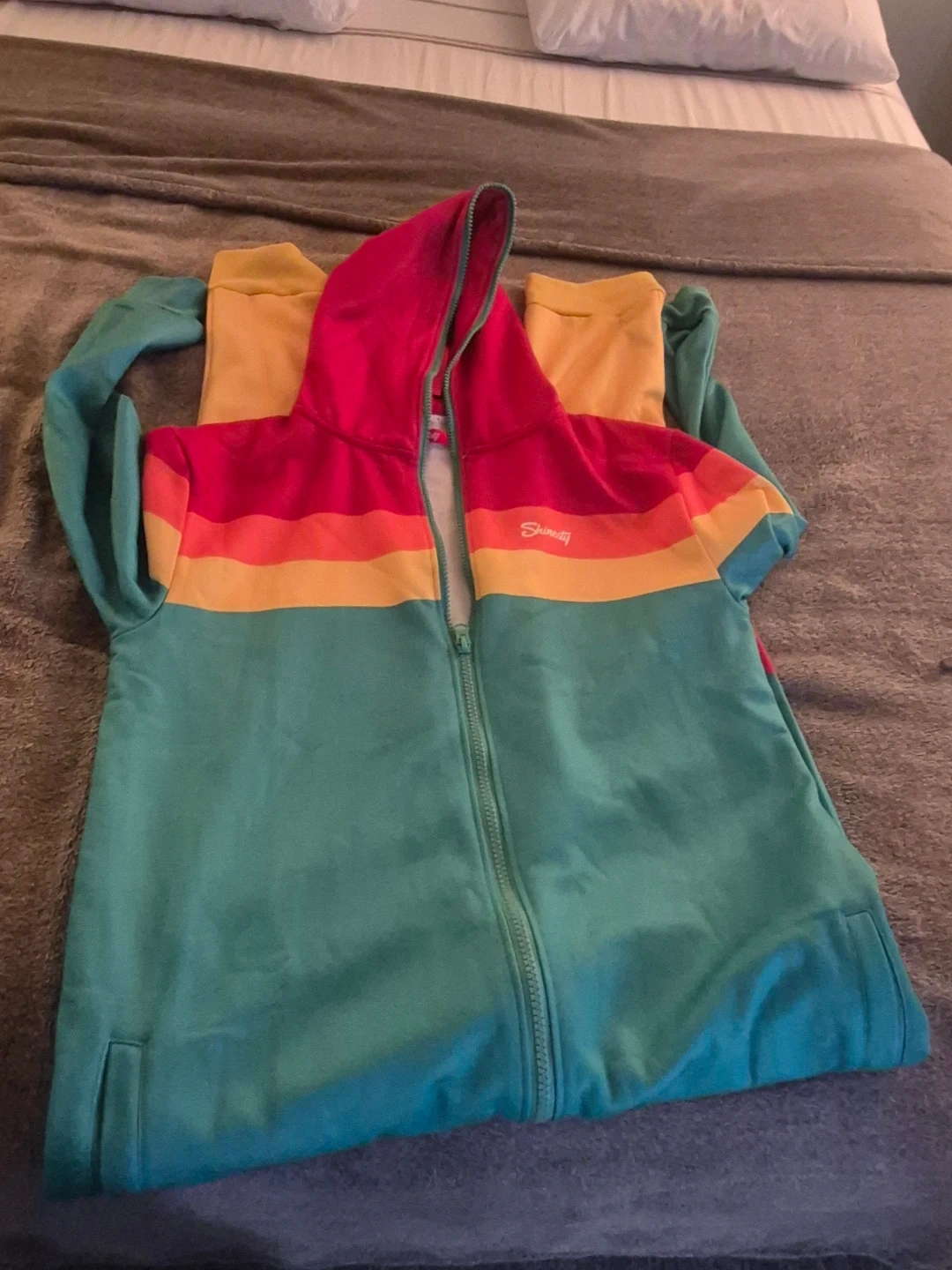 Here's a Shiraleah zip-up hoodie with a fun, colourful design! It features a vibrant mix of colours that are sure to brighten up any day. Perfect for layering or wearing on its own during cooler weather