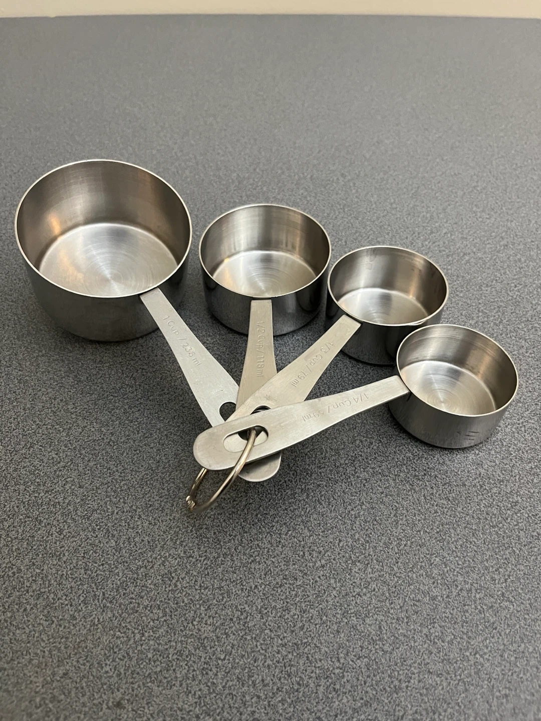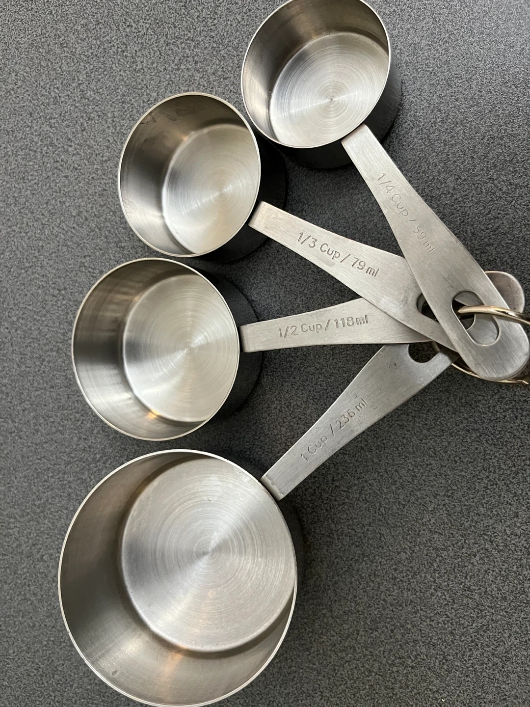 Here's a set of four stainless steel measuring cups. The sizes include 1/4 cup, 1/3 cup, 1/2 cup, and 1 cup. They're all held together with a ring, making them easy to store and keep organized!
