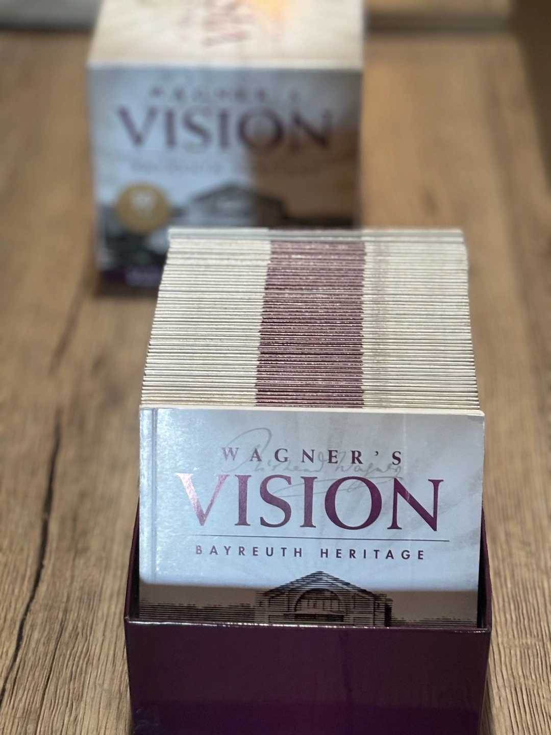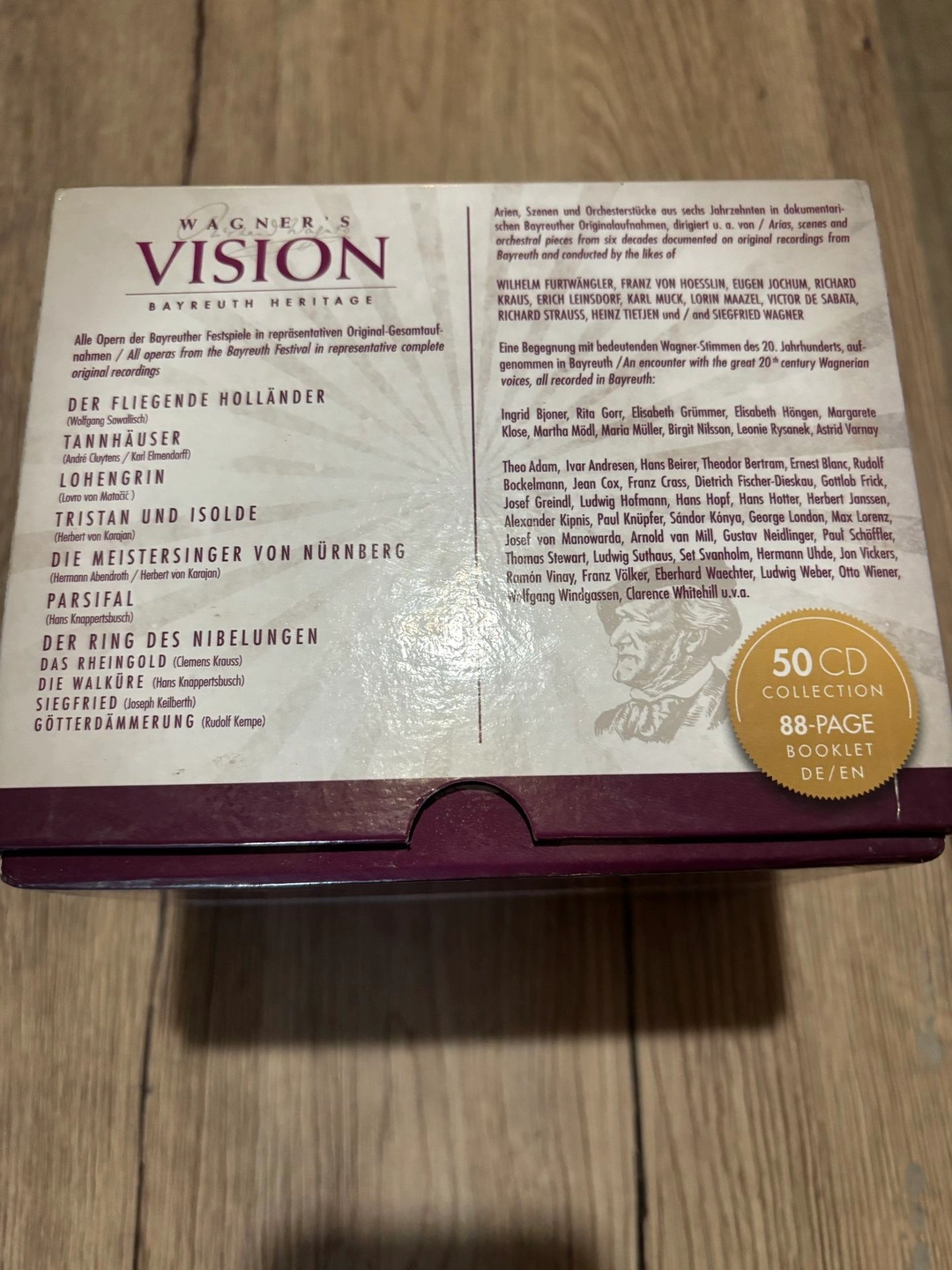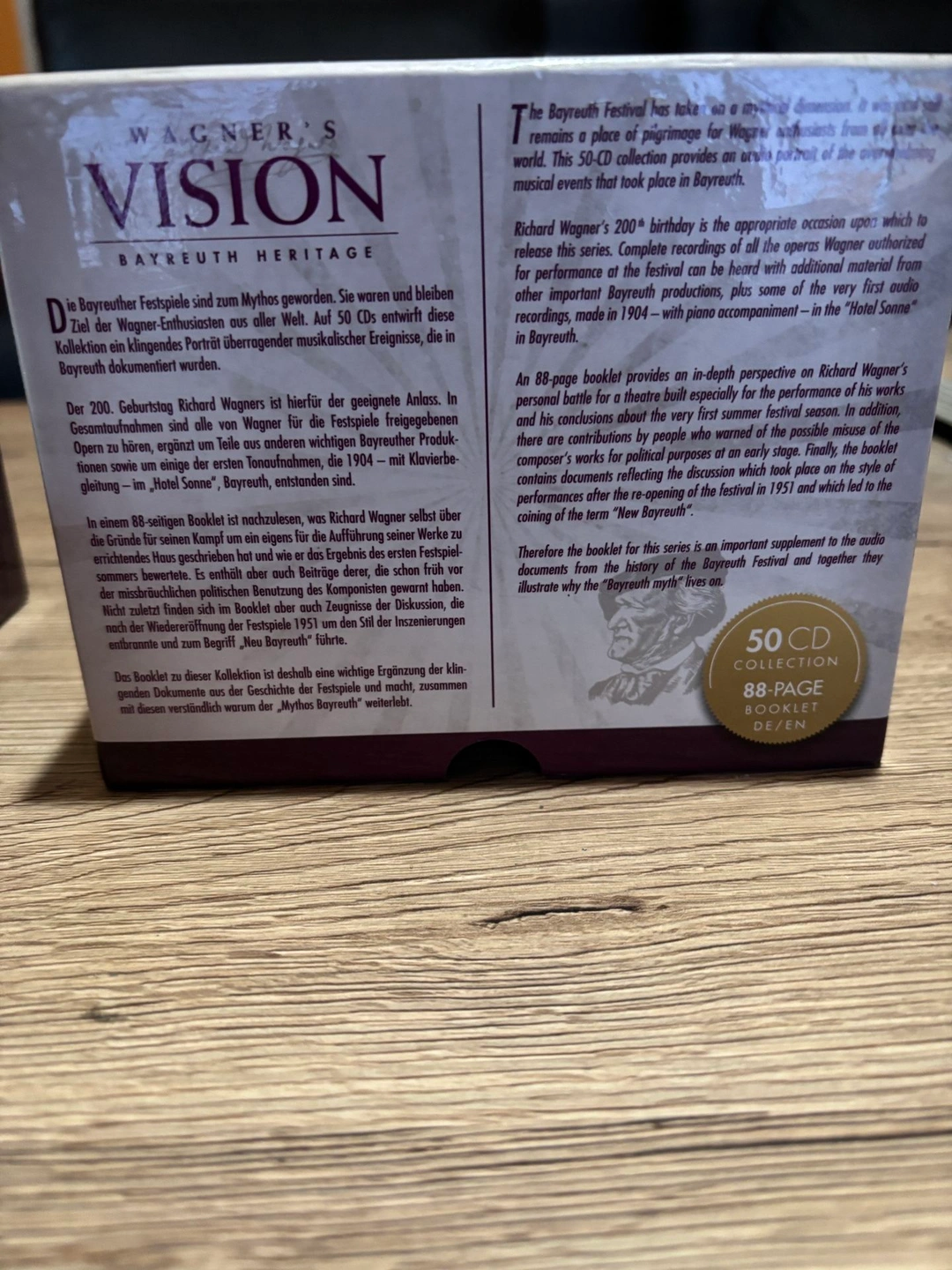 The 50 cds are in a heavy cardboard box with a lid. It contains 11 operas by Wagner rerecorded in digital Audio. A booklet contains a history of Bayreuth history. The CD's are placed in cardboard slips with the opera, names of the singers and conductor.