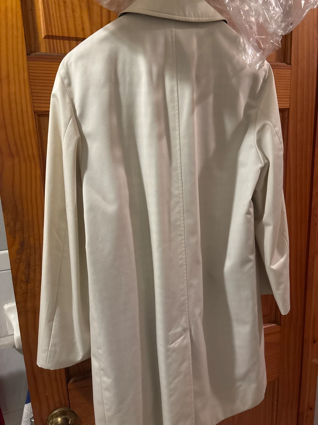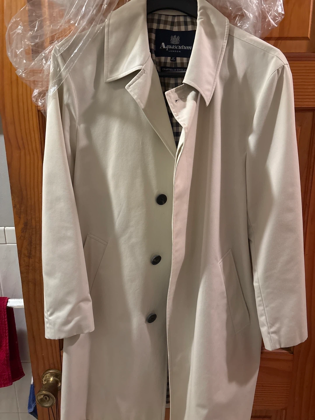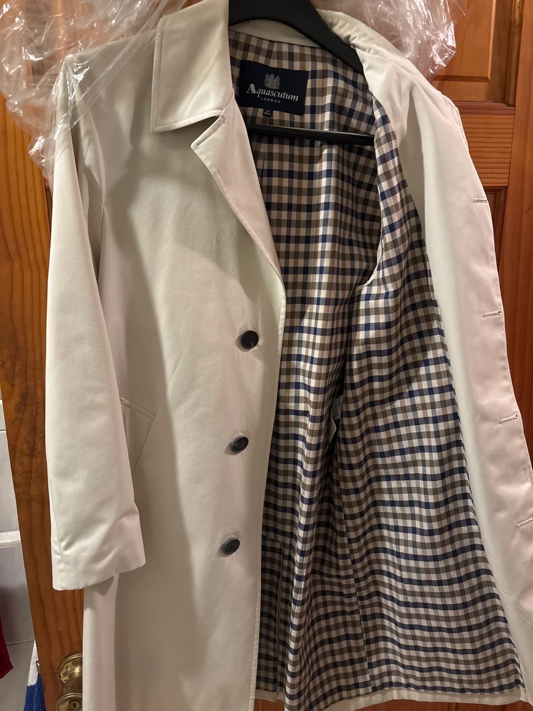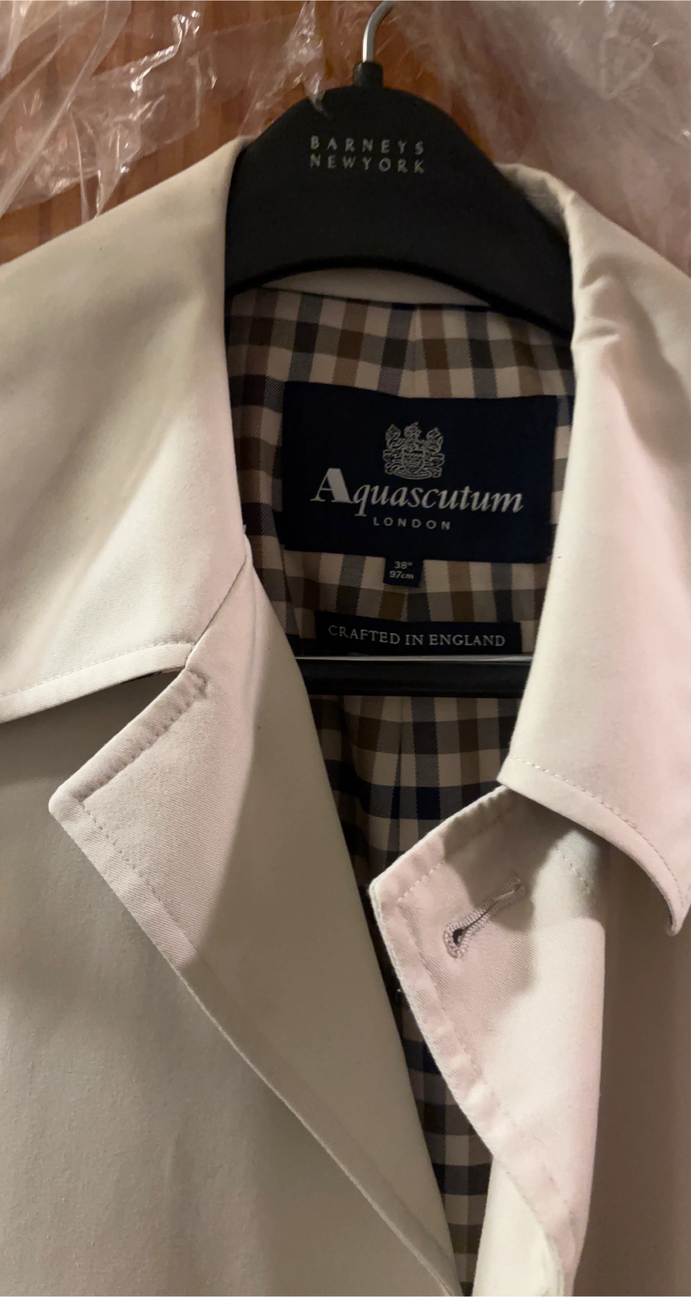 Here's a classic Aquascutum London trench coat! It's a size 38 and crafted in England. The coat features a stylish checkered lining. It's in great condition and ready for a new owner.