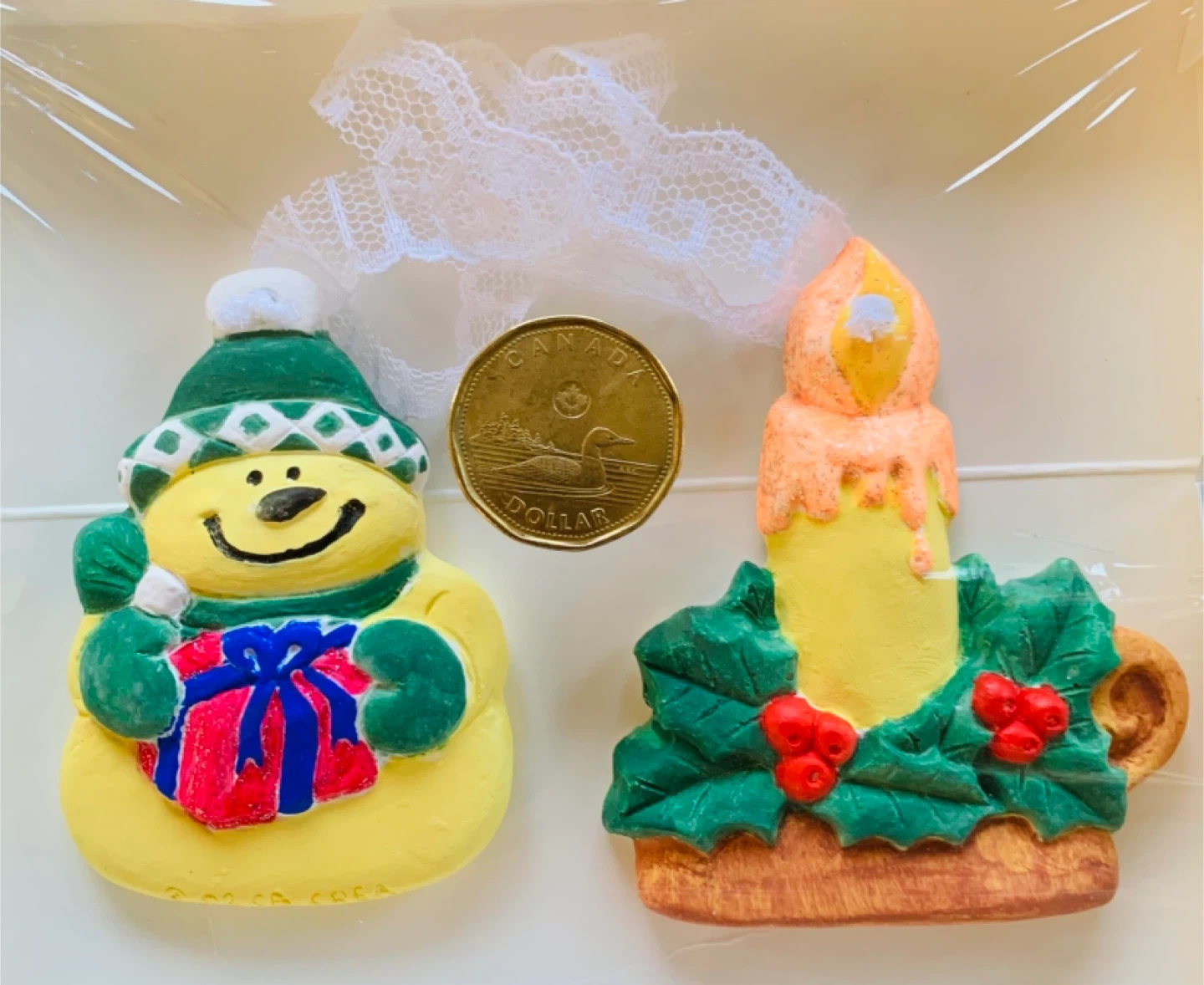 Plaster… NEW / Unused. Each set of 2 ornaments is $5 (CAD) OR buy 2 sets for $8. Get one FREE blank Greeting Card for every set purchased. **set comes as is** Smoke free home.