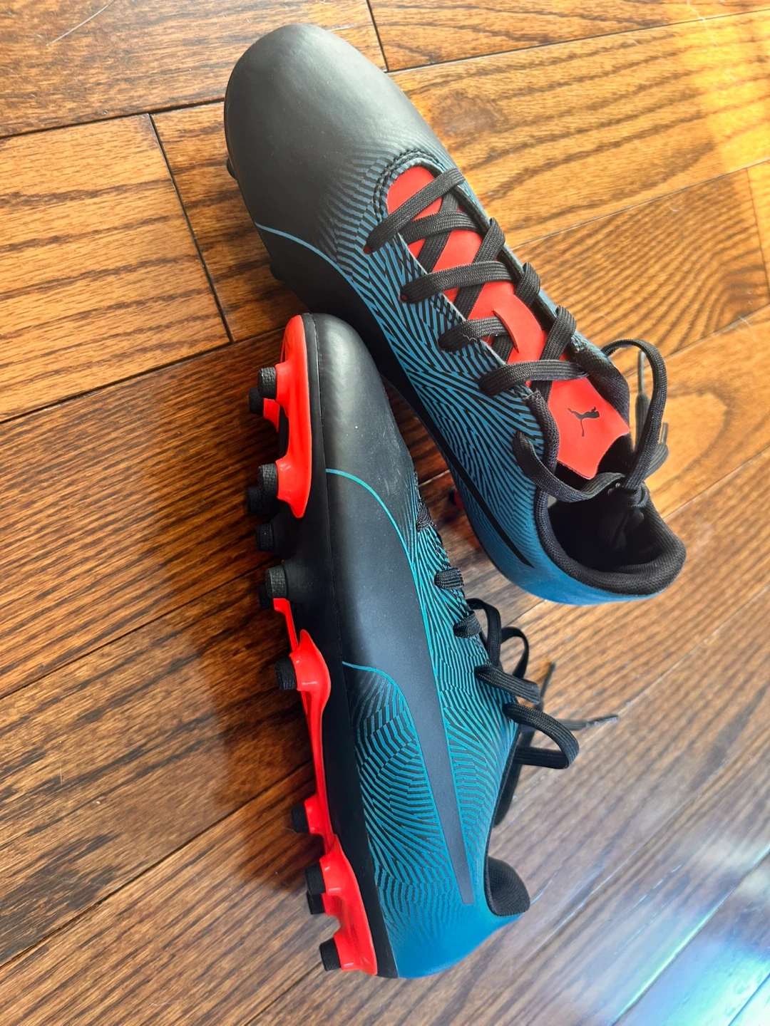 Selling a pair of Puma soccer cleats in youth 5 size! They feature a stylish black and blue design with vibrant red accents. Perfect for young athletes looking for quality footwear on the field