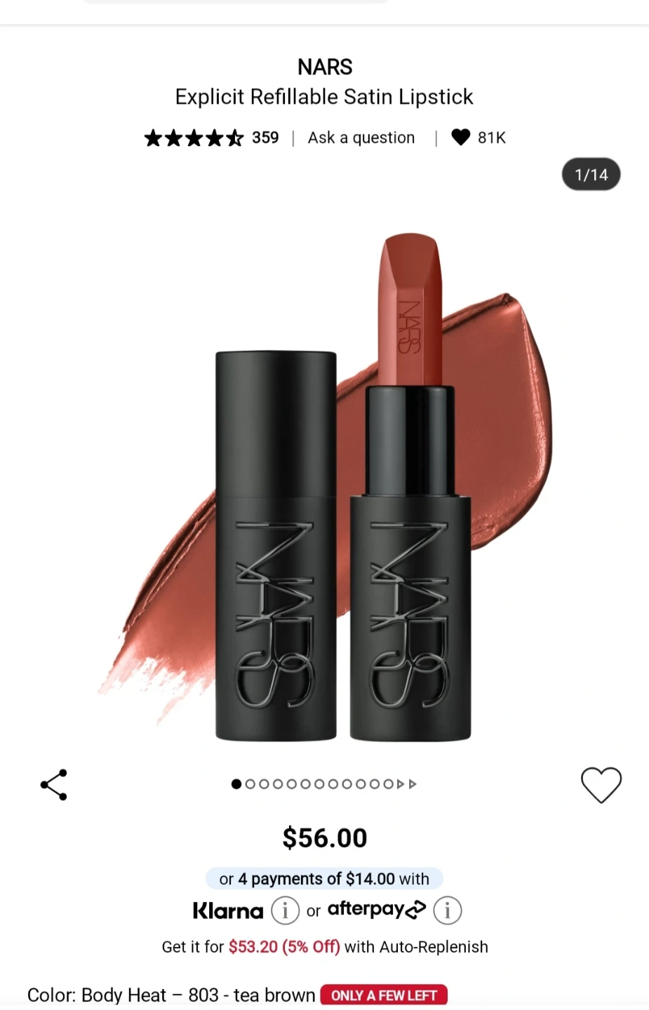Selling a NARS Explicit Refillable Lipstick in the shade Body Heat (803). It's a beautiful tea brown colour and the lipstick is brand new!