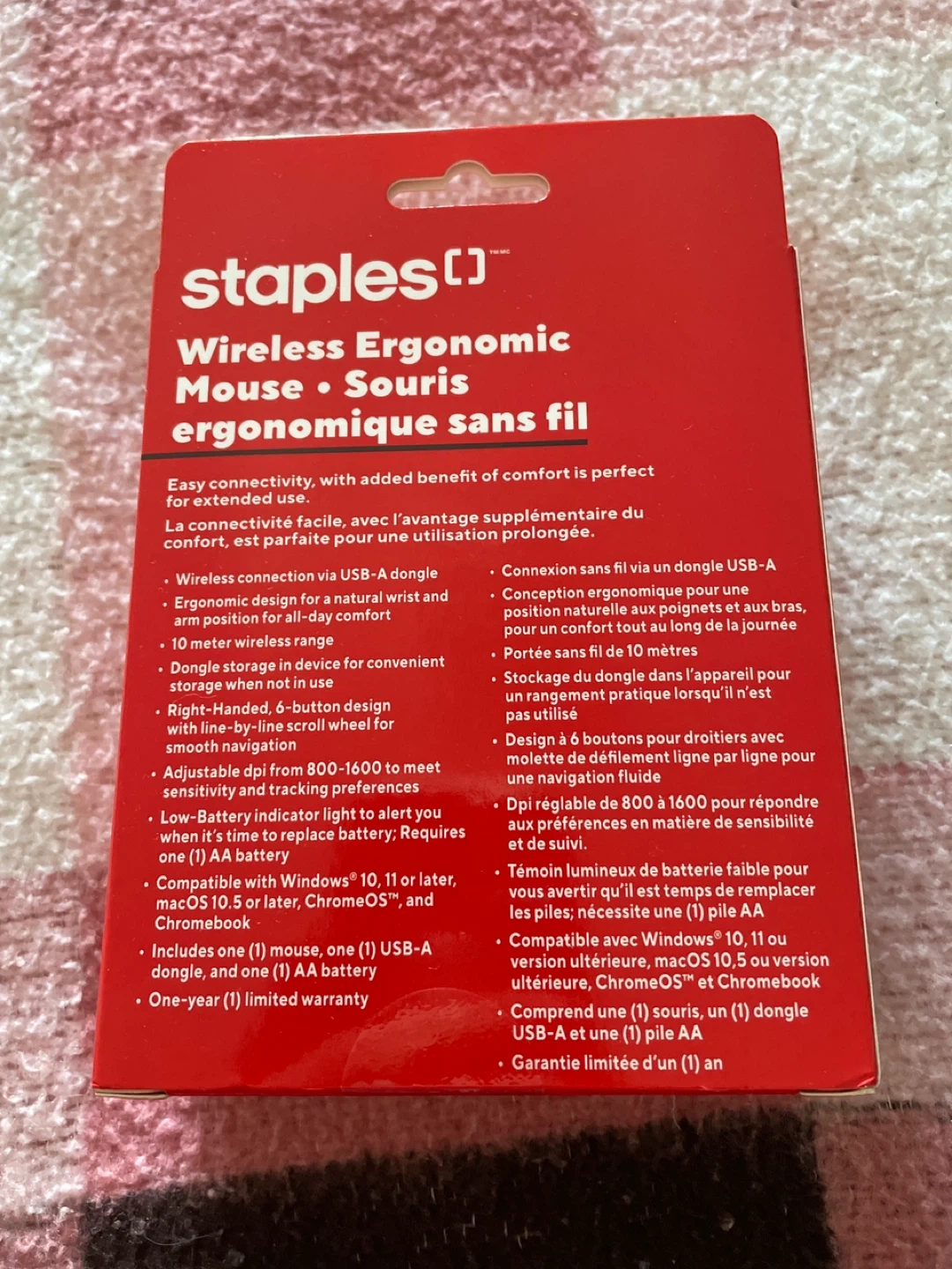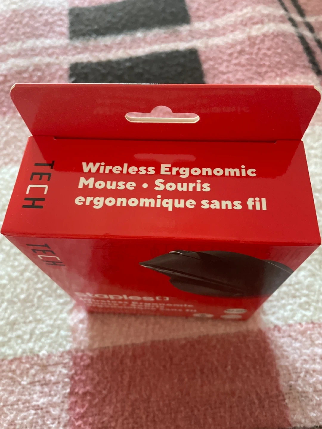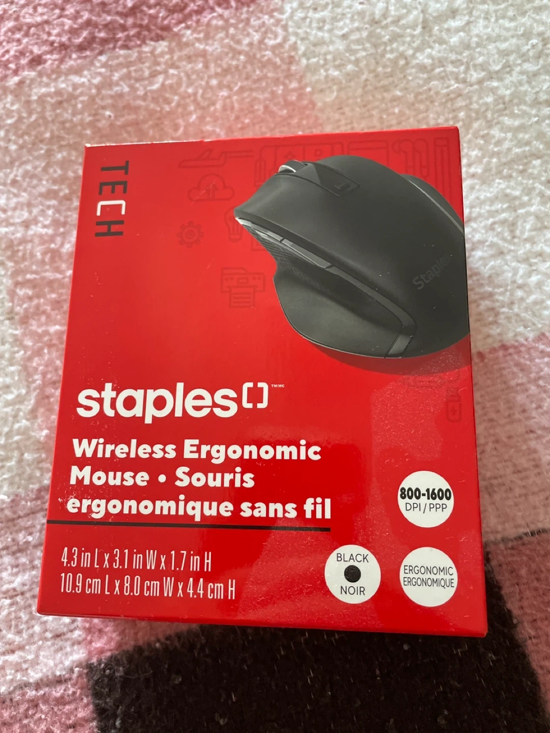Selling a brand new Staples wireless ergonomic mouse in black! This mouse is designed for comfort and prolonged use, with a natural wrist and arm position. It features: