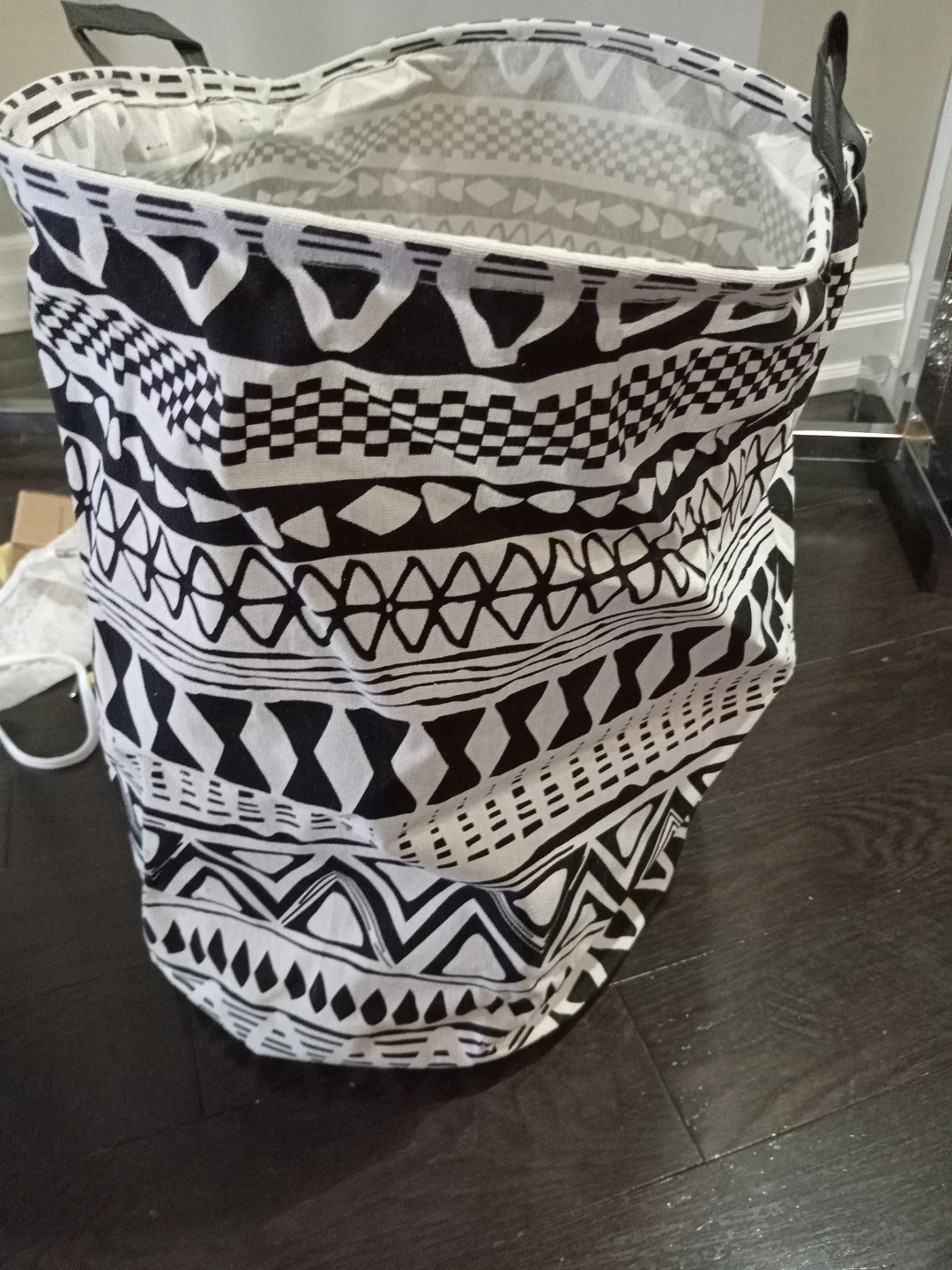 Selling a laundry hamper with a cool black and white pattern! It's in great condition, practically brand new. This hamper is one-size and ready to help keep your laundry organized!