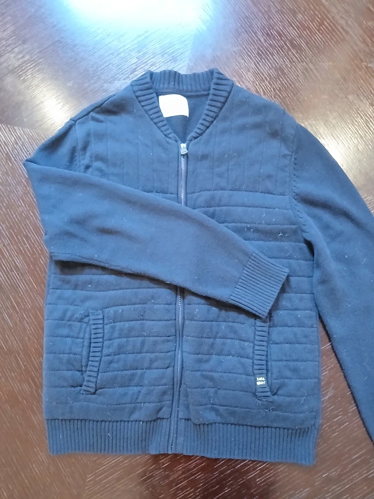 Here's a Zara Kids blue zip-up jacket! It has a quilted design on the front and pockets. It's in good condition and ready for a new owner