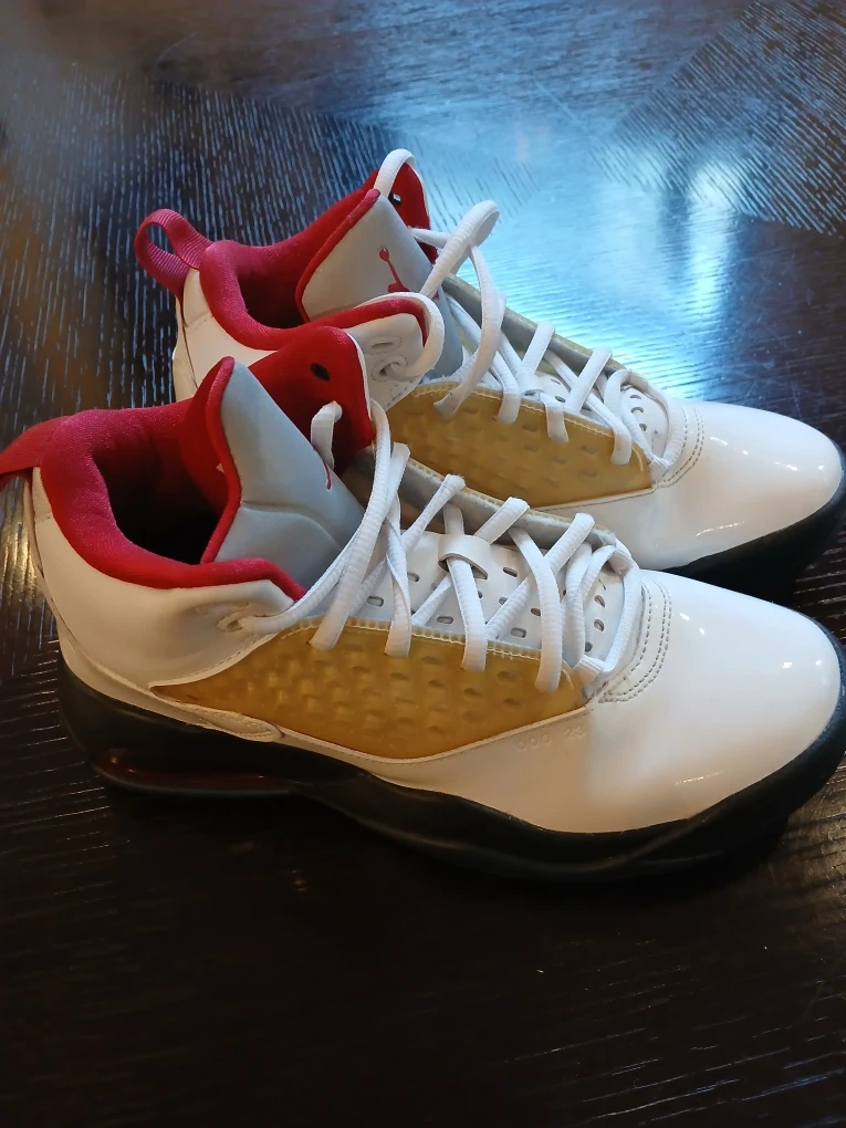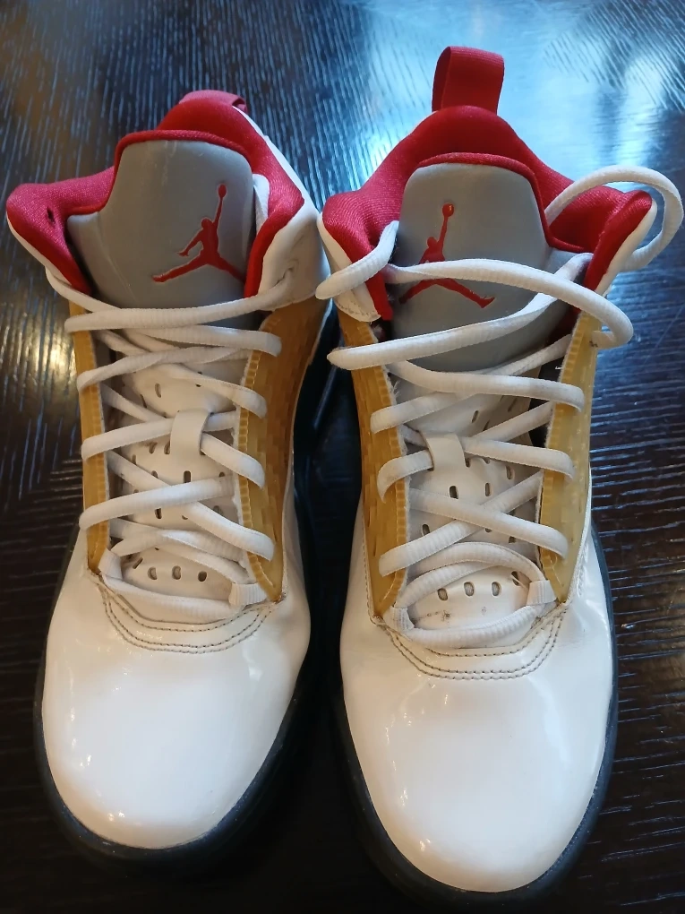 Selling a pair of Jordan 360 23 sneakers in a white and gold colorway! They feature the Jumpman logo on the sole and tongue. These sneakers are in good condition and ready for a new owner!