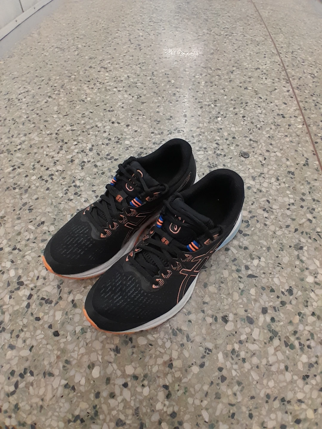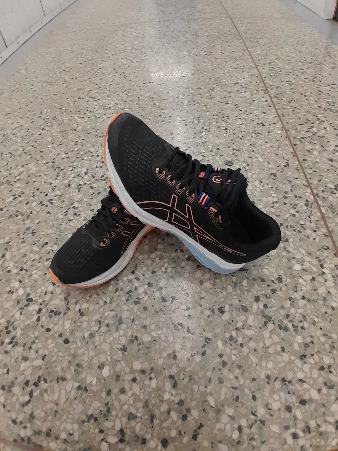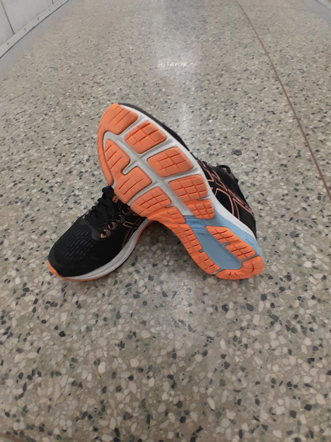 Asics Gel-Excite 9 running shoes for sale! They're in great shape and ready for your next run. The shoes are black with orange accents on the sole and Asics logo. Perfect for jogging or everyday wear women's size 7