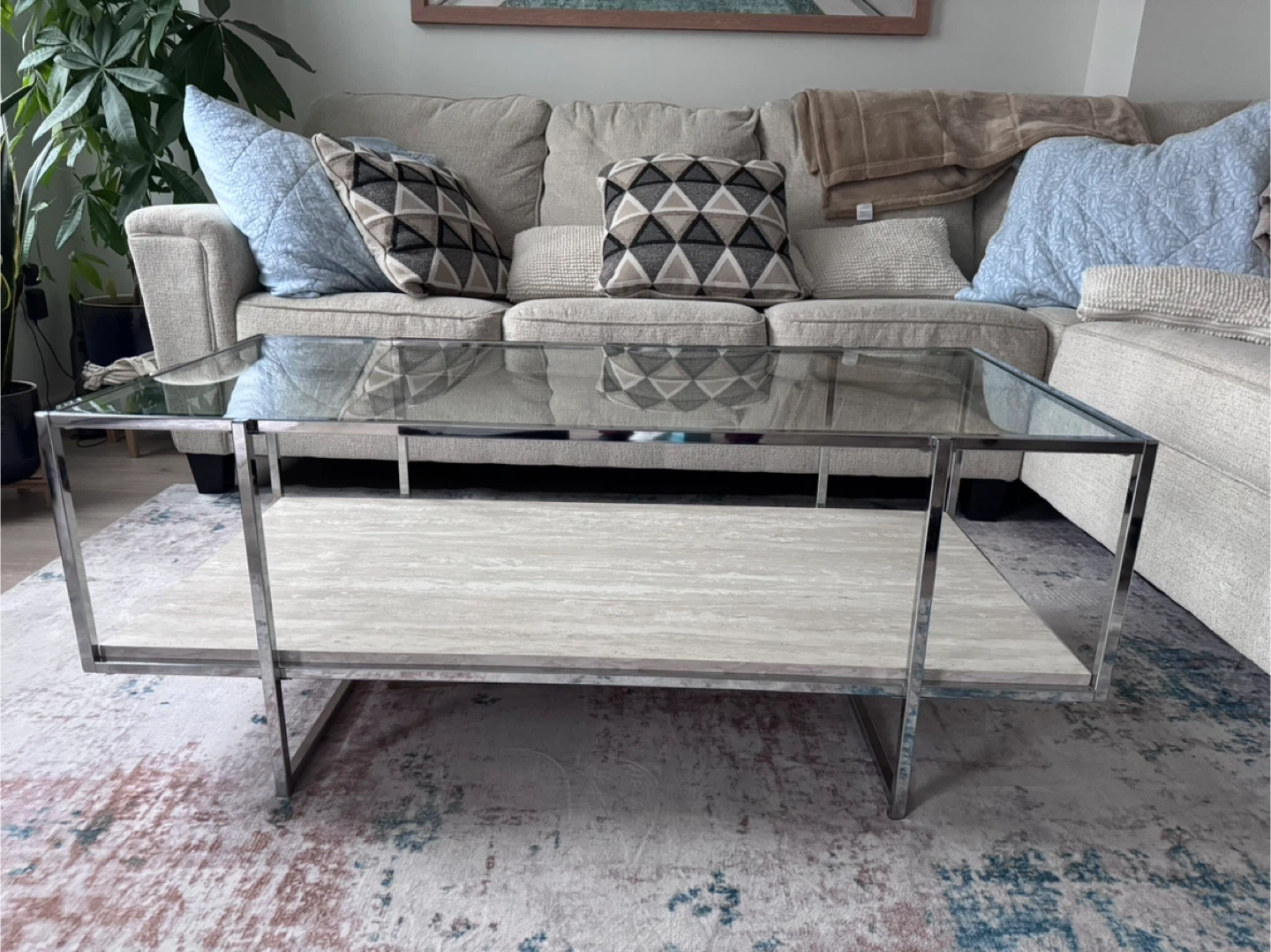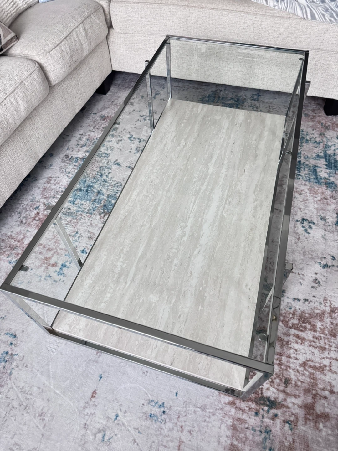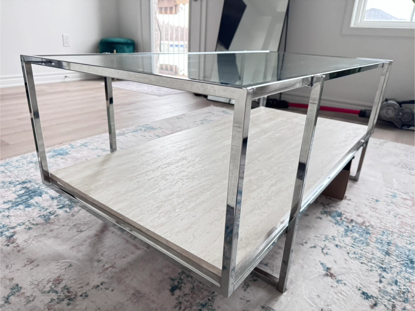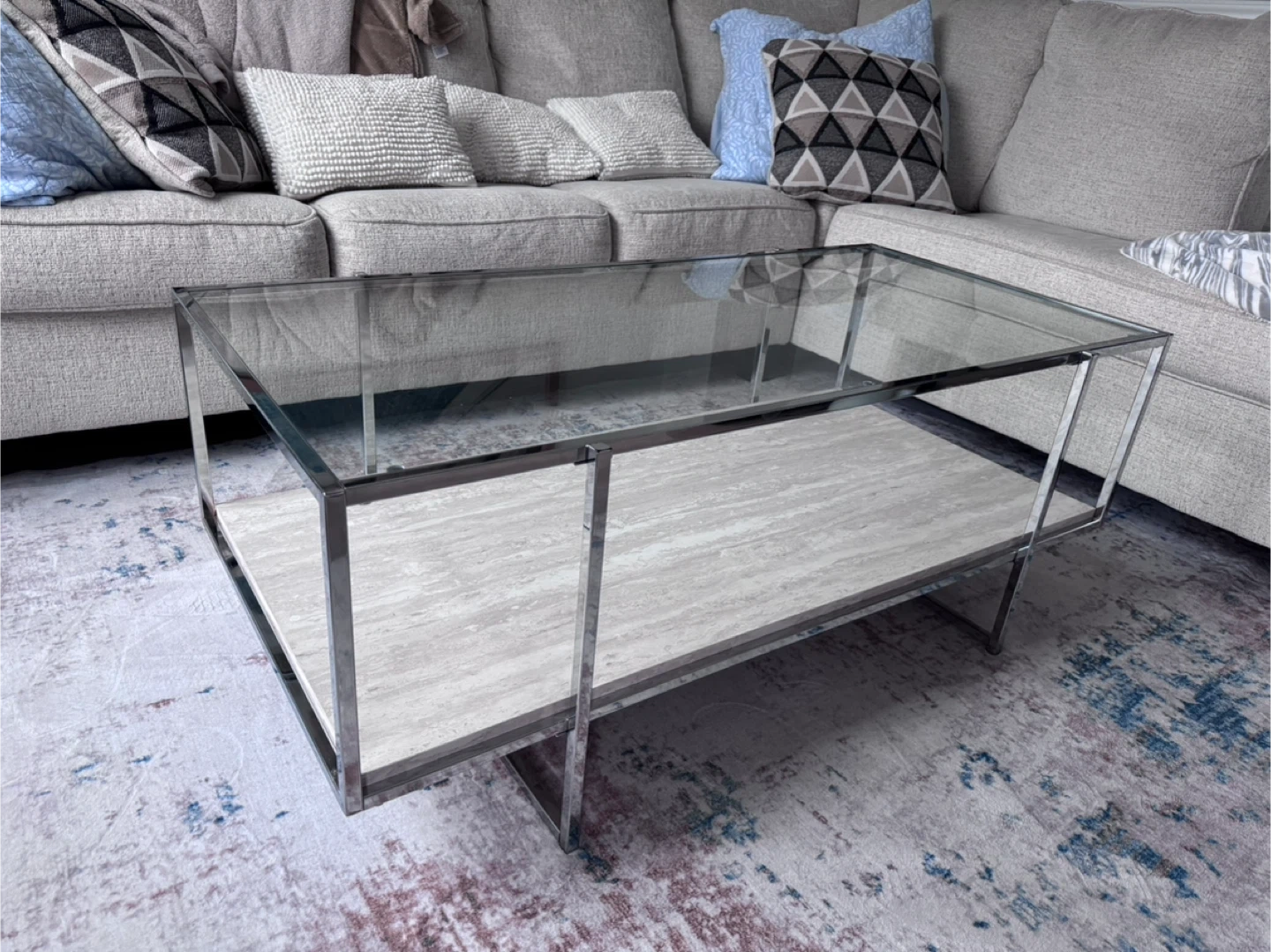 Hi there! I’m selling my Glass Chrome two layer coffee table. It is in really good condition. Zero cracks, dents, or chips on the glass and chrome. Let me know if you’re interested. Thanks
