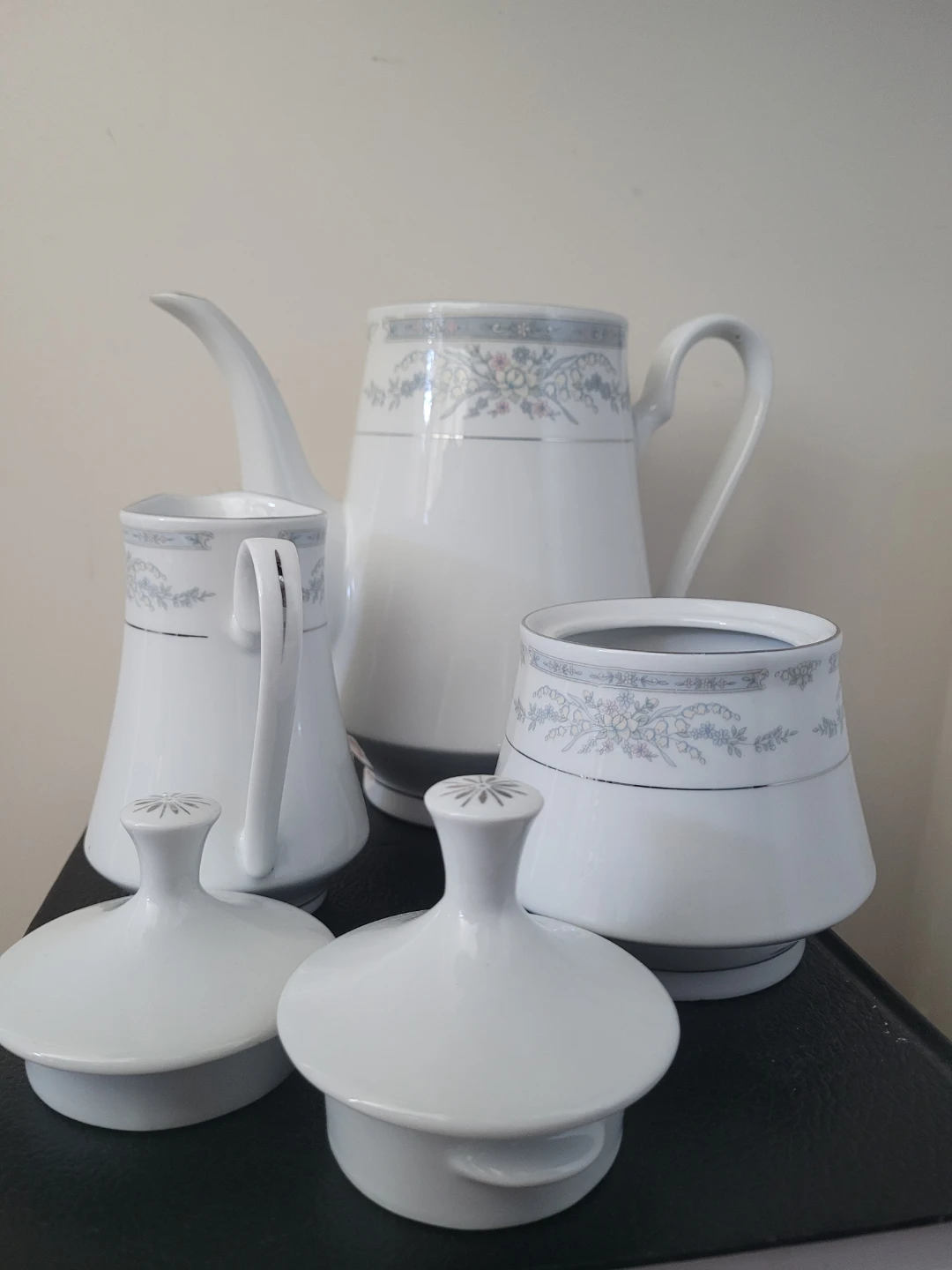 Selling a beautiful Crown Ming fine china tea set. It includes a teapot, creamer, sugar bowl, and two lids. Perfect for tea parties or adding a touch of elegance to your kitchen!