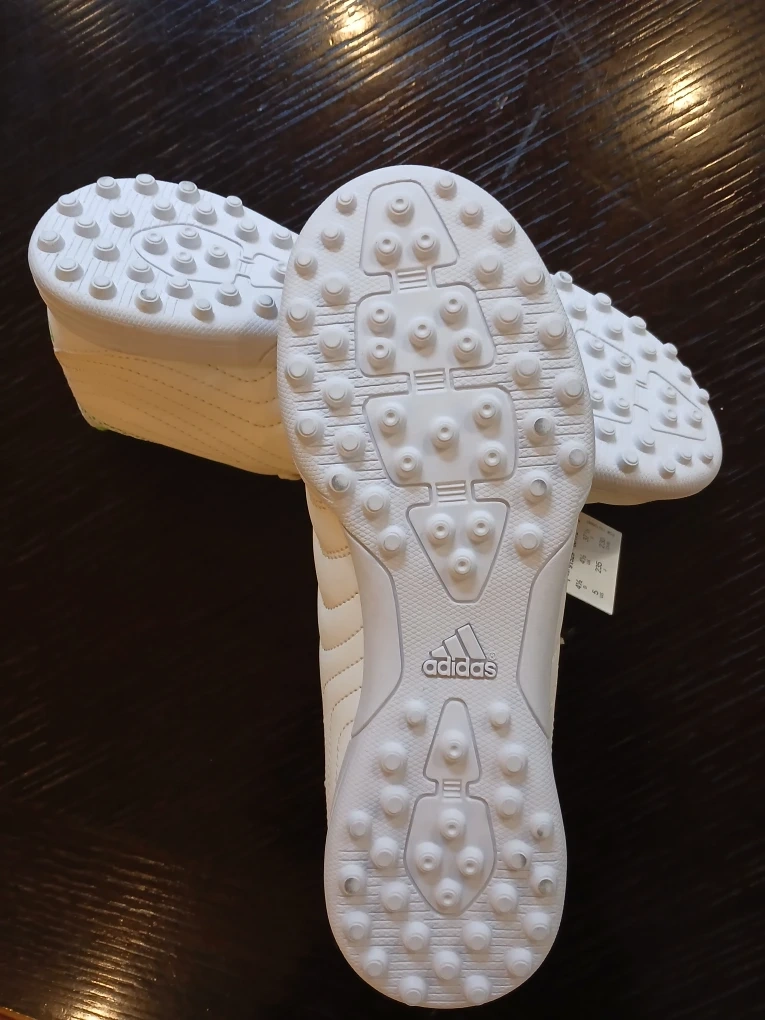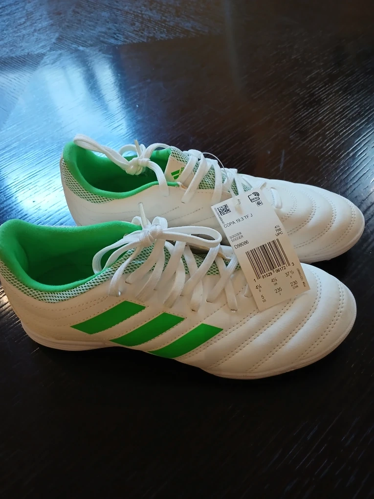 Selling a pair of Adidas Copa 19.3 TF J soccer shoes in white with green stripes. They are in great condition and perfect for turf fields. Size is US 5.
