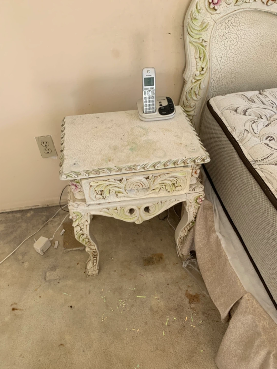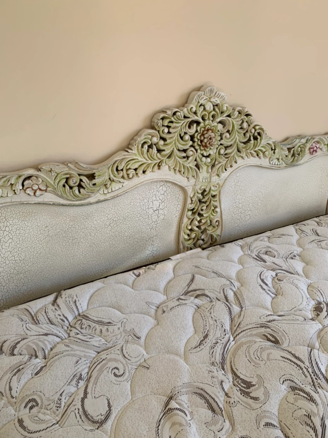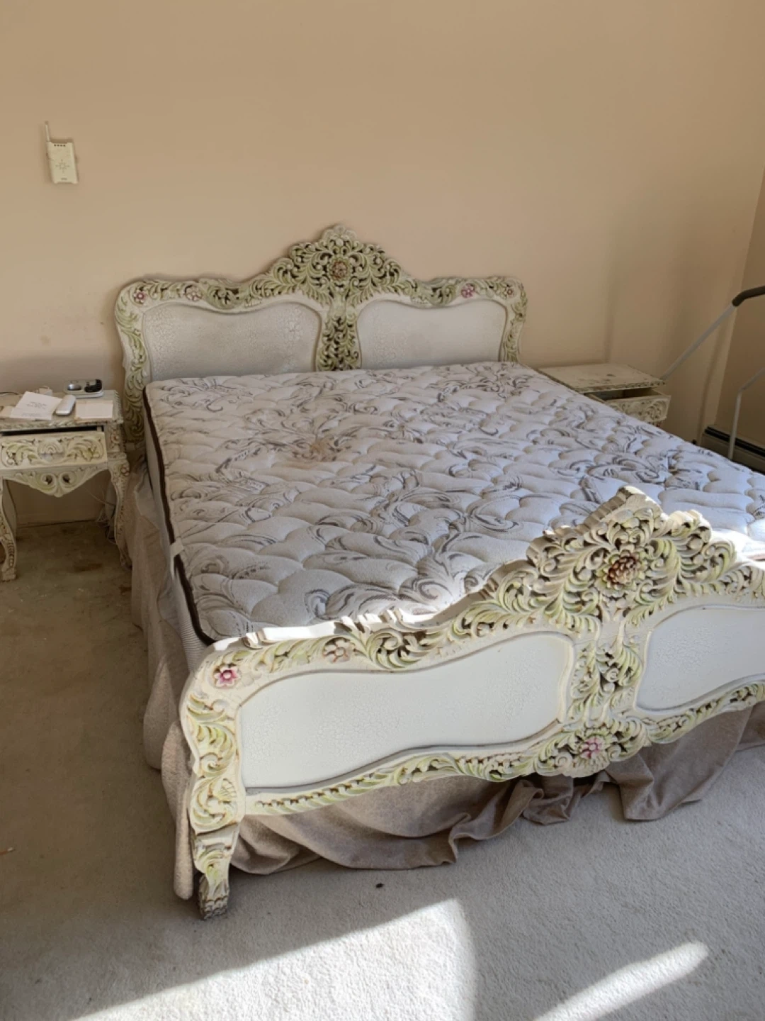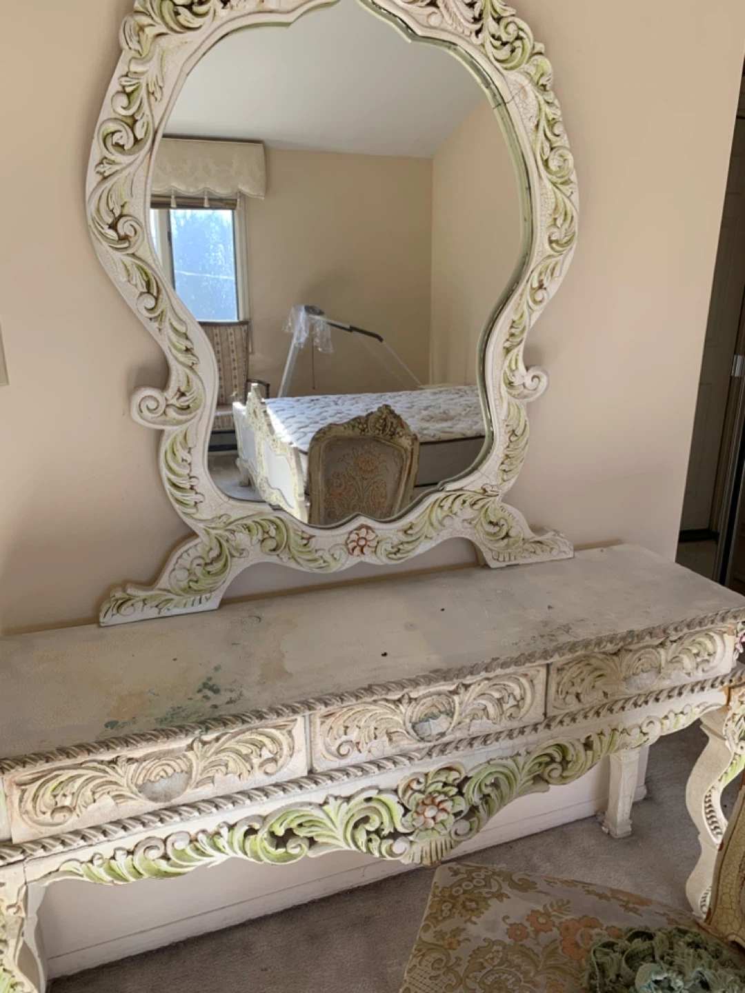 Selling a beautiful, ornate antique bedroom set. Includes a bed frame, mattress, two nightstands, and a vanity with a mirror. The set has an antique white finish with floral detailing. The set shows signs of wear and use.